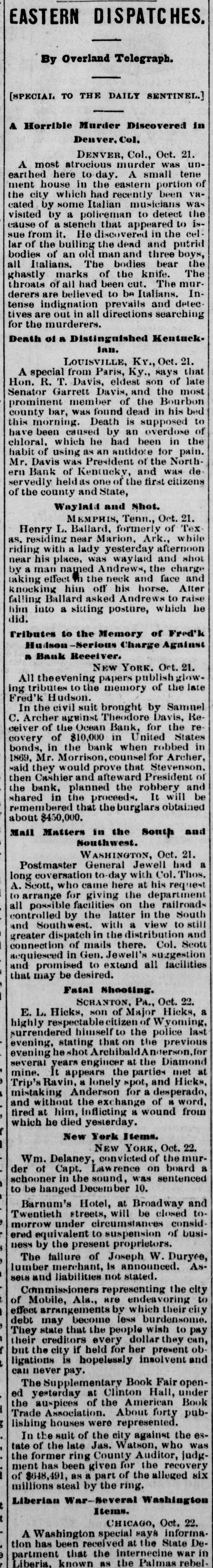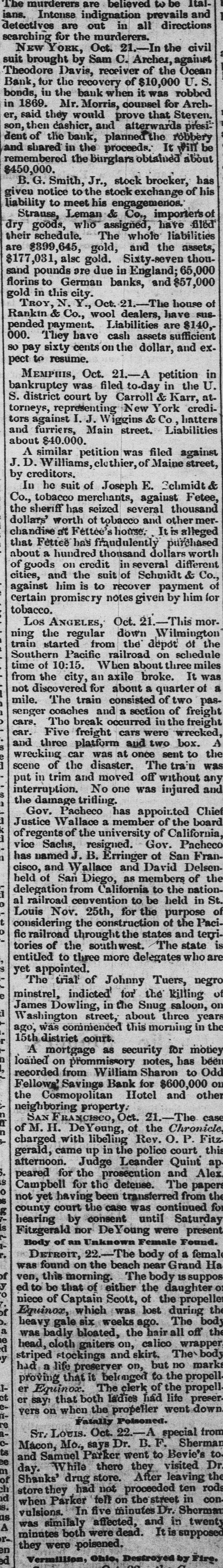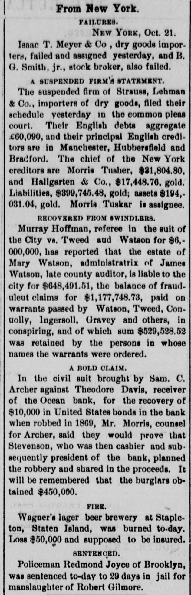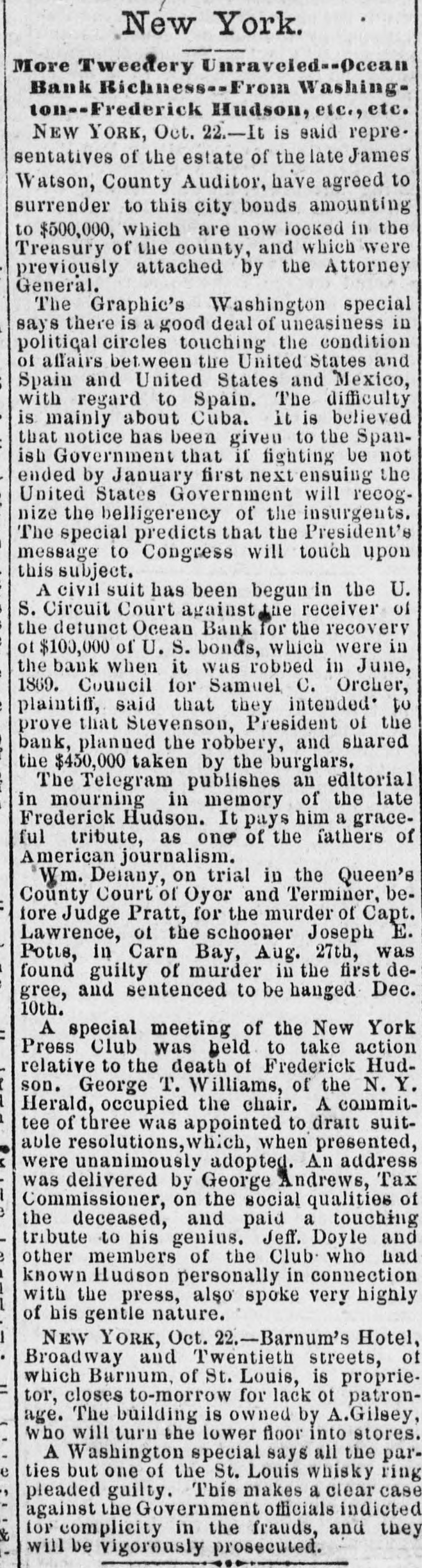 New York. More Tweedery Unraveled--Oceam Bank Richness.-From Washington--Frederick Hudson, etc., etc. NEW YORK, Oct. 22.-It is said representatives of the estate of the late James Watson, County Auditor, have agreed to surrender to this city bonds amounting to $500,000, which are now looked in the Treasury of the county, and which were previously attached by the Attorney General. The Graphic's Washington special says there is a good deal of uneasiness in political circles touching the condition of affairs between the United States and and United States Spain and Mexico, with regard to Spain. The difficulty is mainly about Cuba. it is believed that notice has been given to the Spanish Government that if fighting be not ended by January first next ensuing the United States Government will recognize the belligerency of the insurgents. The special predicts that the President's message to Congress will touch upon this subject. A civil suit has been begun in the U. S. Circuit Court against the receiver of the detunct Ocean Bank for the recovery ot $100,000 of U. S. bonds, which were in the bank when it was robbed in June, 1869. Council for Samuel C. Orcher, plaintiff, said that they intended* to prove that Stevenson, President of the bank, planned the robbery, and shared the $430,000 taken by the burglars. The Telegram publishes an editorial in mourning in memory of the late Frederick Hudson. It pays him a graceful tribute, as one of the fathers of American journalism. Wm. Delany, on trial in the Queen's County Court of Oyer and Terminer, before Judge Pratt, for the murder of Capt. of the schooner Lawrence, Carn Joseph 27th, E. Potts, in Bay, Aug. was found guilty of murder in the first degree, and sentenced to be hanged Dec. 10th. A special meeting of the New York Press Club was held to take action relative to the death of Frederick Hudson. George T. Williams, of the N. Y. Herald, occupied the chair. A committee of three was appointed to drait suitable resolutions, which, when presented, were unanimously adopted. An address was delivered by George Andrews, Tax Commissioner, on the social qualities of the deceased, and paid a touching tribute to his genius. Jeff. Doyle and other members of the Club who had known Hudson personally in connection with the press, also spoke very highly of his gentle nature. NEW YORK, Oct. 2.-Barnum's Hotel, Broadway and Twentieth streets, of which Barnum, of St. Louis, is proprietor, closes to-morrow for lack of patronage. The building is owned by A.Gilsey, who will turn the lower floor into stores. A Washington special says all the pare ties but one of the St. Louis whisky ring pleaded guilty. This makes a clear case against the Government officials indicted for complicity in the frauds, and they & will be vigorously prosecuted.