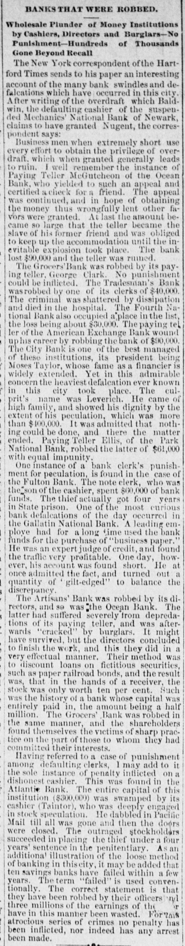 # BANKS THAT WERE ROBBED. Wholesale Plunder of Money Institutions by Cashiers, Directors and Burglars-No Punishment-Hundreds of Thousands Gone Beyond Recall The New York correspondent of the Hart- ford Times sends to his paper an interesting account of the many bank swindles and de- falcations which have occurred in this city. After writing of the overdraft which Bald- win, the defaulting cashier of the suspen- ded Mechanics' National Bank of Newark, claims to have granted Nugent, the corres- pondent says: Business men when extremely short use every effort to obtain the privilege of over- draft, which when granted generally leads to ruin. I well remember the instance of Paying Teller MeGutcheon of the Ocean Bank, who yielded to such an appeal and certified a check for a friend. The appeal was continued, and in hope of obtaining the money thus wrongfully lent other fa- vors were granted. At last the amount be- came so large that the teller became the slave of his former friend and was obliged to keep up the accommodation until the in- evitable explosion took place. The bank lost $90,000 and the teller was ruined. The Grocers' Bank was robbed by its pay- ing teller, George Clark. No punishment could be inflicted. The Tradesman's Bank was robbed by one of its clerks of $40,000. The criminal was shattered by dissipation and died in the hospital. The Fourth Na- tional Bank also occupied a place in the list, the loss being about $30,000. The paying tel- ler of the American Exchange Bank wound up his career by robbing the bank of $90,000. The City Bank is one of the best managed of these institutions, its president being Moses Taylor, whose fame as a financier is widely extended. Yet in this admirable concern the heaviest defalcation ever known in this city took place. The cul- prit's name was Leverich. He came of high family, and showed his dignity by the extent of his peculation, which was more than $400,000. It was admitted that noth- ing could be done, and there the matter ended. Paying Teller Ellis, of the Park National Bank, robbed the latter of $61,000 with equal impunity. One instance of a bank clerk's punish- ment for peculation, is found in the case of the Fulton Bank. The note clerk, who was the son of the cashier, spent $60,000 of bank funds. The thief actually got four years in State prison. One of the most curious bank defalcations of the day occurred in the Gallatin National Bank. A leading em- ploye had for a long time used the bank funds for the purchase of "business paper." He was an expert judge of credit, and found the traffic very profitable. One day, how- ever, his account was found short. He at once admitted the fact, and turned out a quantity of "gilt-edged" to balance the discrepancy. The Artisans' Bank was robbed by its di- rectors, and so was the Ocean Bank. The latter had suffered severely from depreda- tions of its paying teller, and was after- wards "cracked" by burglars. It might have survived, but the directors concluded to finish the work, and this they did in a very effectual manner. Their method was to discount loans on fictitious securities, such as paper railroad bonds, and the result was, that in the hands of a receiver, the stock was only worth ten per cent. Such was the history of a bank whose capital was entirely paid in, the amount being a half million. The Grocers' Bank was robbed in the same manner, and the shareholders found themselves the victims of sharp prac- tice on the part of those to whom they had committed their interests. Having referred to a case of punishment among defaulting clerks, I may add to it the sole instance of penalty inflicted on a dishonest cashier. This was found in the Atlantic Bank. The entire capital of this institution ($300,000) was swamped by its cashier (Taintor), who was deeply engaged in stock speculation. He dabbled in Pacific Mail till all was gone and then the doors were closed. The outraged stockholders succeeded in placing the thief under a four years' sentence in the penitentiary. As an additional illustration of the loose method of banking in this city, it may be added that ten savings banks have failed within a few years. The term "failed" is used conven- tionally. The correct statement is that they have been robbed by their officers and three millions of the earnings of the have in this manner been wasted. For this atrocious series of crimes no penalty has been inflicted, nor indeed has any arrest been made.