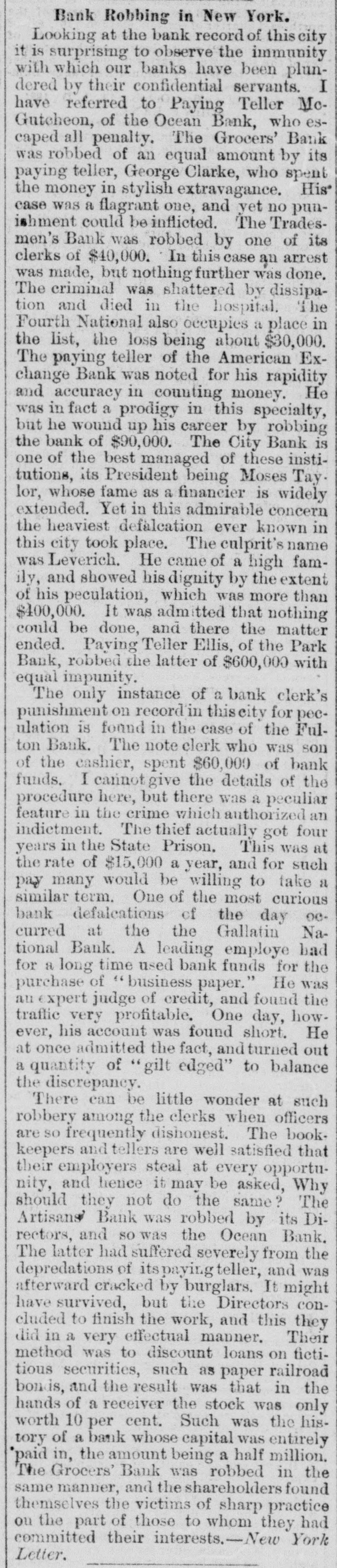 # Bank Robbing in New York. Looking at the bank record of this city it is surprising to observe the immunity with which our banks have been plundered by their confidential servants. I have referred to Paying Teller McGutcheon, of the Ocean Bank, who escaped all penalty. The Grocers' Bank was robbed of an equal amount by its paying teller, George Clarke, who spent the money in stylish extravagance. His case was a flagrant one, and yet no punishment could be inflicted. The Tradesmen's Bank was robbed by one of its clerks of $40,000. In this case an arrest was made, but nothing further was done. The criminal was shattered by dissipation and died in the hospital. The Fourth National also occupies a place in the list, the loss being about $30,000. The paying teller of the American Exchange Bank was noted for his rapidity and accuracy in counting money. He was in fact a prodigy in this specialty, but he wound up his career by robbing the bank of $90,000. The City Bank is one of the best managed of these institutions, its President being Moses Taylor, whose fame as a financier is widely extended. Yet in this admirable concern the heaviest defalcation ever known in this city took place. The culprit's name was Leverich. He came of a high family, and showed his dignity by the extent of his peculation, which was more than $400,000. It was admitted that nothing could be done, and there the matter ended. Paying Teller Ellis, of the Park Bank, robbed the latter of $600,000 with equal impunity. The only instance of a bank clerk's punishment on record in this city for peculation is found in the case of the Fulton Bank. The note clerk who was son of the cashier, spent $60,000 of bank funds. I cannot give the details of the procedure here, but there was a peculiar feature in the crime which authorized an indictment. The thief actually got four years in the State Prison, This was at the rate of $15,000 a year, and for such pay many would be willing to take a similar term. One of the most curious bank defalcations of the day occurred at the Gallatin National Bank. A leading employe had for a long time used bank funds for the purchase of "business paper." He was an expert judge of credit, and found the traffic very profitable. One day, however, his account was found short. He at once admitted the fact, and turned out a quantity of "gilt edged" to balance the discrepancy. There can be little wonder at such robbery among the clerks when officers are so frequently dishonest. The bookkeepers and tellers are well satisfied that their employers steal at every opportunity, and hence it may be asked, Why should they not do the same? The Artisans' Bank was robbed by its Directors, and so was the Ocean Bank. The latter had suffered severely from the depredations of its paying teller, and was afterward cracked by burglars. It might have survived, but the Directors concluded to finish the work, and this they did in a very effectual manner. Their method was to discount loans on fictitious securities, such as paper railroad bonds, and the result was that in the hands of a receiver the stock was only worth 10 per cent. Such was the history of a bank whose capital was entirely paid in, the amount being a half million. The Grocers' Bank was robbed in the same manner, and the shareholders found themselves the victims of sharp practice on the part of those to whom they had committed their interests. - New York Letter.