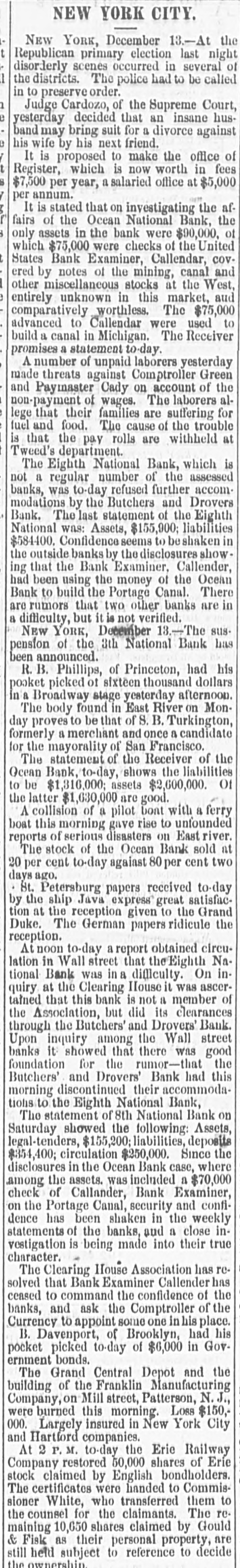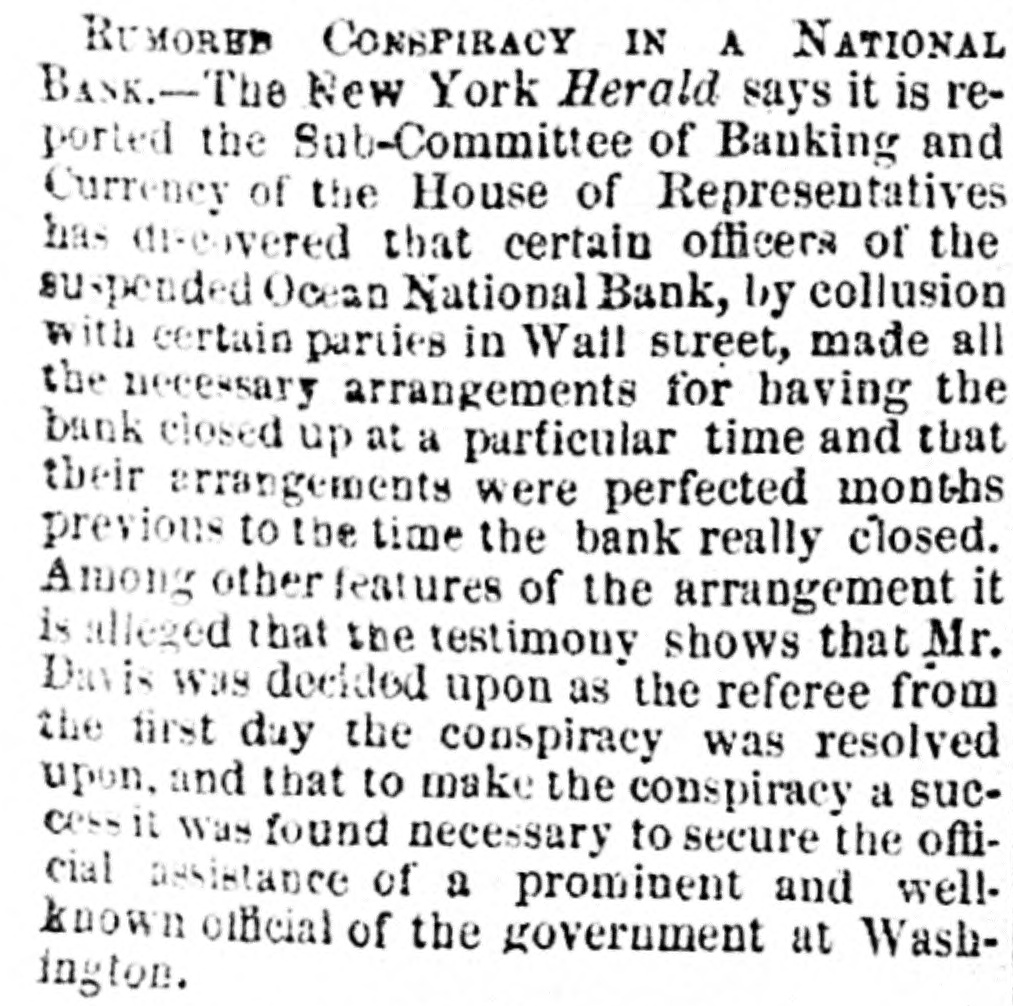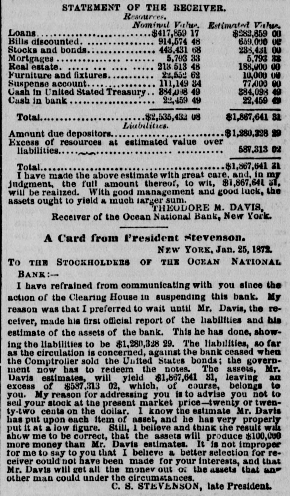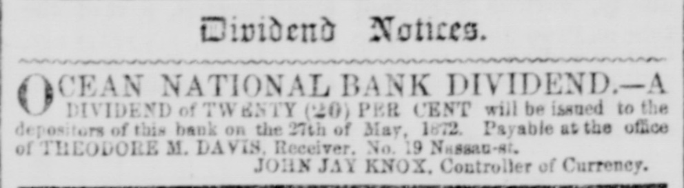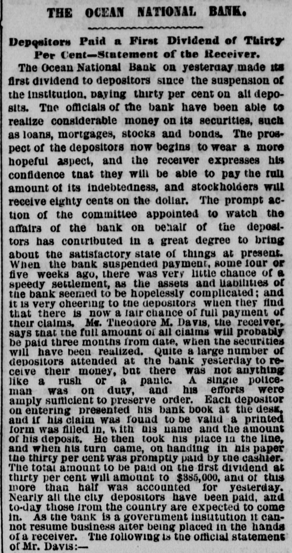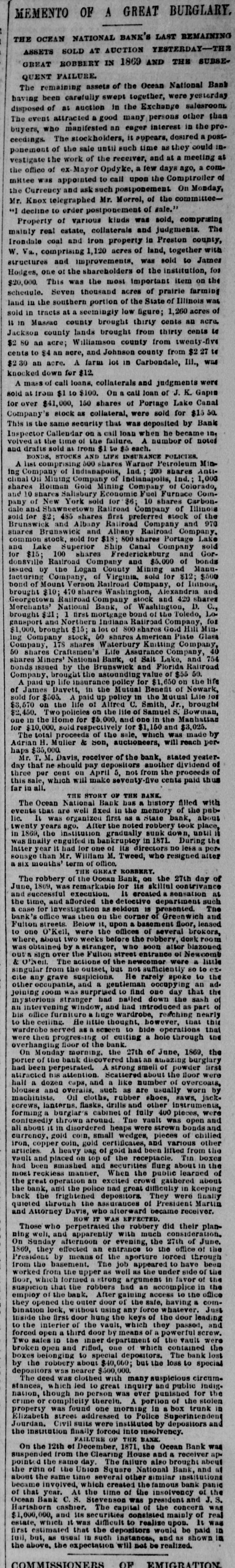 MEMENTO OF A GREAT BURGLARY. THE OCEAN NATIONAL BANK'S LAST REMAINING ASSETS SOLD AT AUCTION YESTERDAY-THE GREAT ROBBERY IN 1869 AND THE SUBSEQUENT FAILURE. The remaining assets of the Ocean National Bank having been carefully swept together, were yesterday disposed of at auction in the Exchange salesroom The event attracted a good many persons other than buyers, who manifested an eager interest in the proceedings. The stockholders, it supears, desired post ponement of the sale until such time as they could investigate the work of the receiver, and at meeting at the office of ex Mayor Opdyke, a few days ago, a committee was appointed to call upon the Comptroller of the Currency and ask such postponement On Monday, Mr. Knox telegraphed Mr. Morrel, of the committee**I decline to order postponement of sale." Property of various kinds was sold, comprising mainly real estate, collaterals and judgments. The Irondale coal and iron property in Preston county, W. Va. comprising 1,120 acres of land, together with structures and improvements, was sold to James Hodges, one of the shareholders of the institution, for $20,000. This was the most Important item on the schedule. Seven thousand acres of prairie farming land in the southern portion of the State of Illinois was sold in tracts at seemingly low figure; 1,260 acres of 11 in Massac county brought thirty cents an acre, Jackson county lands brought from thirty cents to $2 80 an acre; Williamson county from twenty five cents to $4 acre, and Johnson county from $2.27 to $2.30 an acre. A farm lot in Carbondale, III., was knocked down for $12. mass of call loans, collaterals and judgments were sold at from $1 10 $100. On call loan of J. K. Gapin for over $41,000, 150 shares of Portage Lake Canal Company stock as collateral, were sold for $15 50. This is the same security that was deposited by Bank Inspector Callendar on call loan when he became in, the time the failure, A number of notes and drafts sold from $1 $5 each. BONDS, STOCKS AND LIFE INSURANCE POLICIES. A list comprising 500 shares Warner Petroleum Min ing Company of Indianapolis, Ind 200 shares Anticlinal Oil Mining Company of Indianapolis, Ind. 1,000 shares Houman Gold Mining Company of Colorado, and 10 shares Salisbury Economic Fuel Furnace Company New York sold for $6 10 shares CarbonRailroad Company of Illinois $2: 485 shares first preferred stock of the Brunswic and Albany Railroad Company and 970 shares Brunsw and Albany Railroad Company. common stock, sold for $18 SOU shares Portage Lake and Lake Superior Ship Canal Company sold for 100 shares and Gordonsville Railroad Company and $5,000 of bonds issued by the Logan County Mining and Manufacturing Company, of Virginia, sold for $12; $500 bond of Mount Vernon Railroad Company, of Immois brought $10 470 shares Washington, Alexandria Georgetown Railroad Company stock and 420 shares Merchants National Bank, of Washington, D. brought $21 first mortgage bond the Toledo, Lo gansport and Northern Indiana Railroad Company for $1,000 brought $15 lot 800 shares Gold Hill Min ing Company stock, 50 shares American Plate Glass Company, 178 shares Waterbury Kuitting Company, 50 shares Craftsmen's Life Assurance Company shares Miners National Bank, of Salt Lake, and 754 bonds issued by the Brunswick and Florida Railroad Company, brought the astounding value of $55 50. paid up policy for 1.650 on the life Mutual Benefit of Newark, James the Davett, sold for $505. paid up policy in the Mutual Lile of Alfred Jr Smith, brought life $3,570 on the $2,450. policies on the life of Samuel S. Bowman one the Home for $5,000, and one the Manhattan for $10,000, sold respectively for $1,150 and $3,025. The total proceeds of the sale. which was made by Adrian Muller & Son, auctioneers, will reach per haps $35,000 Mr M. Davis, receiver of the bank, stated yeater day that ne should pay deposito another dividend of three per cent on April 5. not from the proceeds of this sale, which will make seventy-five cents paid thus far in all. BANK STORY THE THK OF with The Ocean National Bank has history filled events that are well fixed the memory of the pub lic. It was organized first State bank. about twenty years ago. After the noted robbery took place, in 1869, the institution gradually Bunk dow until was finally enguifed in bankruptcy in 1871 During the latter year had for one its directors no less a per Bouage than Mr William M. Tweed, who resigned alter a months term of office, RORBERT. GREAT THE The robbery of the Ocean Bank, on the 27th day of June, 1869, was remarkable for its skillal contrivance and successful execution. It created sensation at the time, and afforded the detective epartment such case for vestigation as seldom presented. The bank's office was then ou the corner of Greenw ich and Fulton streets. Below upon nent floor, leased to one O'Kell. were the offices of brokors, where, about two weeks before the robbery. desk room was obtained by stranger. who soon altor blazoned out sign over the Fulton street entrance of Newcomt & O'Neil. The actions of the newcomor were little singular from the outset. but not sufficiently 80 to cite any grave suspicions. He rarely spoke to other occupants, and gentleman occupying an Joining room was surprised to find one day that the systerious stranger had pailed down the sash intervening window. and had introduced as part his office furniture huge wardrobe, reaching nearly to the celling. He little thought, however, that this wardrobe served screen bide operations that were then progressing of cutting a hole through the overhanging floor the bank On Monday morning. the 27th of June, 1869, the porter of the bank discovered that an amazing burglary had been perpetrated. A strong smell of powder lirst attracted his attention. Scattered about the floor were half dozen caps, and a like number of overcoats, blouses and overalls, such as are usually worn by machinists. Oil cloths, rubber shoes, saws. jack screws, lanterns flasks