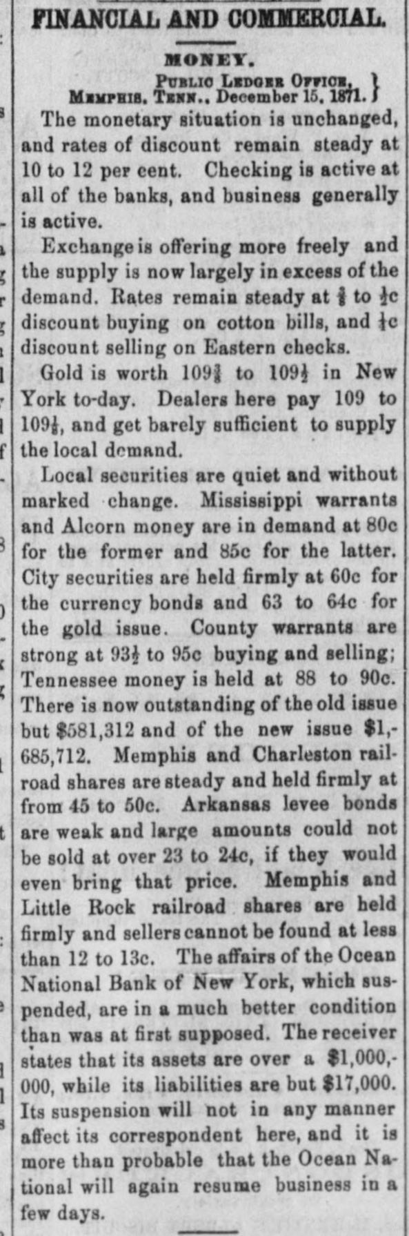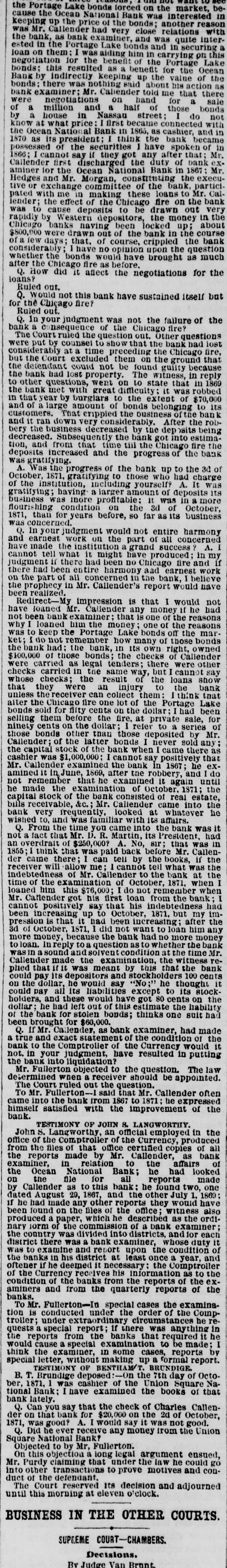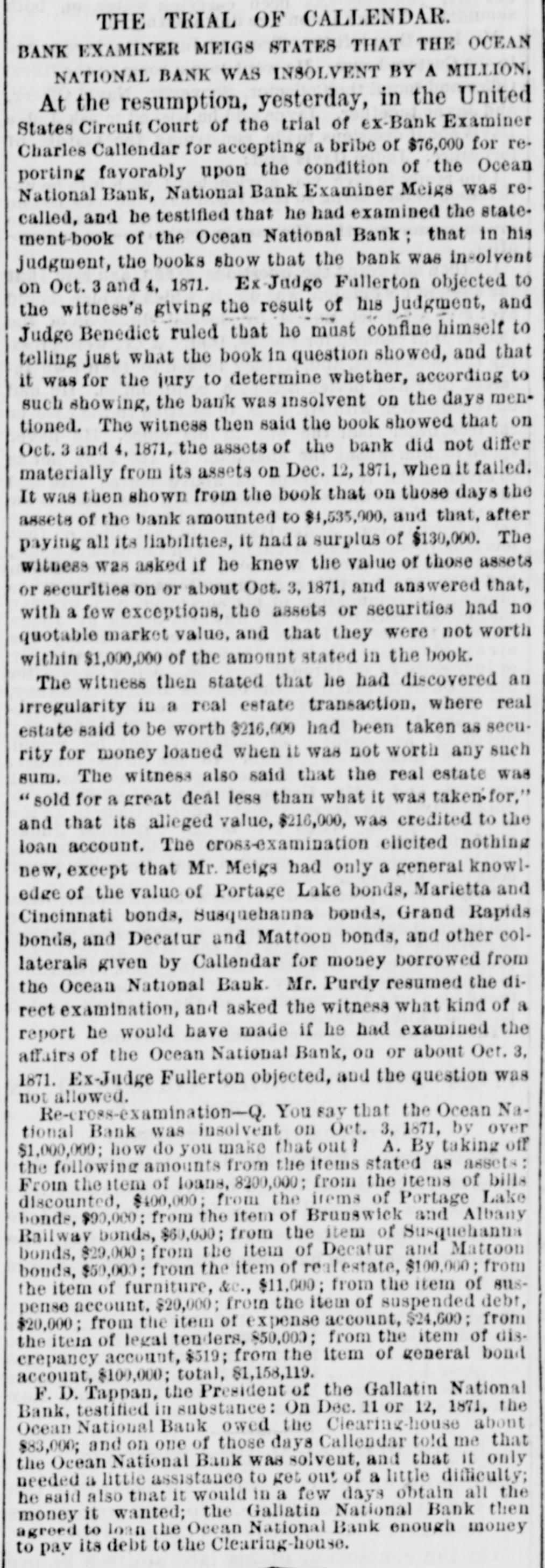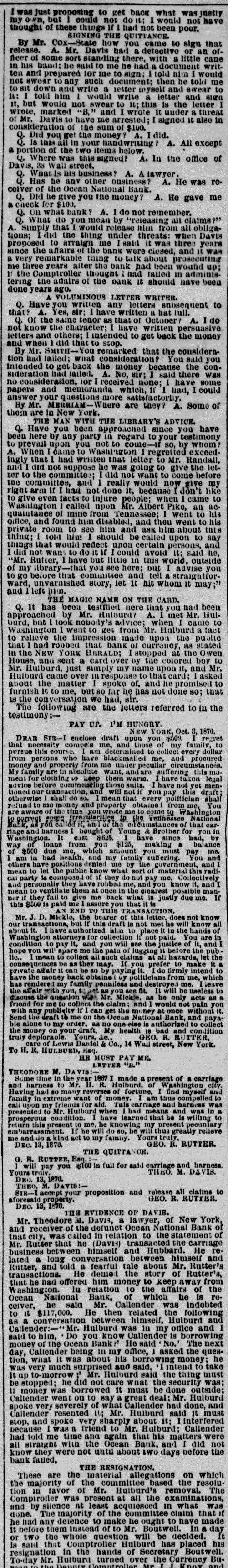 MEMENTO OF A GREAT BURGLARY. THE OCEAN NATIONAL BANK'S LAST REMAINING ASSETS SOLD AT AUCTION YESTERDAY-THE GREAT ROBBERY IN 1869 AND THE SUBSEQUENT FAILURE. The remaining assets of the Ocean National Bank having been carefully swept together, were yesterday disposed of at auction in the Exchange salesroom The event attracted a good many persons other than buyers, who manifested an eager interest in the proceedings. The stockholders, it supears, desired post ponement of the sale until such time as they could investigate the work of the receiver, and at meeting at the office of ex Mayor Opdyke, a few days ago, a committee was appointed to call upon the Comptroller of the Currency and ask such postponement On Monday, Mr. Knox telegraphed Mr. Morrel, of the committee**I decline to order postponement of sale." Property of various kinds was sold, comprising mainly real estate, collaterals and judgments. The Irondale coal and iron property in Preston county, W. Va. comprising 1,120 acres of land, together with structures and improvements, was sold to James Hodges, one of the shareholders of the institution, for $20,000. This was the most Important item on the schedule. Seven thousand acres of prairie farming land in the southern portion of the State of Illinois was sold in tracts at seemingly low figure; 1,260 acres of 11 in Massac county brought thirty cents an acre, Jackson county lands brought from thirty cents to $2 80 an acre; Williamson county from twenty five cents to $4 acre, and Johnson county from $2.27 to $2.30 an acre. A farm lot in Carbondale, III., was knocked down for $12. mass of call loans, collaterals and judgments were sold at from $1 10 $100. On call loan of J. K. Gapin for over $41,000, 150 shares of Portage Lake Canal Company stock as collateral, were sold for $15 50. This is the same security that was deposited by Bank Inspector Callendar on call loan when he became in, the time the failure, A number of notes and drafts sold from $1 $5 each. BONDS, STOCKS AND LIFE INSURANCE POLICIES. A list comprising 500 shares Warner Petroleum Min ing Company of Indianapolis, Ind 200 shares Anticlinal Oil Mining Company of Indianapolis, Ind. 1,000 shares Houman Gold Mining Company of Colorado, and 10 shares Salisbury Economic Fuel Furnace Company New York sold for $6 10 shares CarbonRailroad Company of Illinois $2: 485 shares first preferred stock of the Brunswic and Albany Railroad Company and 970 shares Brunsw and Albany Railroad Company. common stock, sold for $18 SOU shares Portage Lake and Lake Superior Ship Canal Company sold for 100 shares and Gordonsville Railroad Company and $5,000 of bonds issued by the Logan County Mining and Manufacturing Company, of Virginia, sold for $12; $500 bond of Mount Vernon Railroad Company, of Immois brought $10 470 shares Washington, Alexandria Georgetown Railroad Company stock and 420 shares Merchants National Bank, of Washington, D. brought $21 first mortgage bond the Toledo, Lo gansport and Northern Indiana Railroad Company for $1,000 brought $15 lot 800 shares Gold Hill Min ing Company stock, 50 shares American Plate Glass Company, 178 shares Waterbury Kuitting Company, 50 shares Craftsmen's Life Assurance Company shares Miners National Bank, of Salt Lake, and 754 bonds issued by the Brunswick and Florida Railroad Company, brought the astounding value of $55 50. paid up policy for 1.650 on the life Mutual Benefit of Newark, James the Davett, sold for $505. paid up policy in the Mutual Lile of Alfred Jr Smith, brought life $3,570 on the $2,450. policies on the life of Samuel S. Bowman one the Home for $5,000, and one the Manhattan for $10,000, sold respectively for $1,150 and $3,025. The total proceeds of the sale. which was made by Adrian Muller & Son, auctioneers, will reach per haps $35,000 Mr M. Davis, receiver of the bank, stated yeater day that ne should pay deposito another dividend of three per cent on April 5. not from the proceeds of this sale, which will make seventy-five cents paid thus far in all. BANK STORY THE THK OF with The Ocean National Bank has history filled events that are well fixed the memory of the pub lic. It was organized first State bank. about twenty years ago. After the noted robbery took place, in 1869, the institution gradually Bunk dow until was finally enguifed in bankruptcy in 1871 During the latter year had for one its directors no less a per Bouage than Mr William M. Tweed, who resigned alter a months term of office, RORBERT. GREAT THE The robbery of the Ocean Bank, on the 27th day of June, 1869, was remarkable for its skillal contrivance and successful execution. It created sensation at the time, and afforded the detective epartment such case for vestigation as seldom presented. The bank's office was then ou the corner of Greenw ich and Fulton streets. Below upon nent floor, leased to one O'Kell. were the offices of brokors, where, about two weeks before the robbery. desk room was obtained by stranger. who soon altor blazoned out sign over the Fulton street entrance of Newcomt & O'Neil. The actions of the newcomor were little singular from the outset. but not sufficiently 80 to cite any grave suspicions. He rarely spoke to other occupants, and gentleman occupying an Joining room was surprised to find one day that the systerious stranger had pailed down the sash intervening window. and had introduced as part his office furniture huge wardrobe, reaching nearly to the celling. He little thought, however, that this wardrobe served screen bide operations that were then progressing of cutting a hole through the overhanging floor the bank On Monday morning. the 27th of June, 1869, the porter of the bank discovered that an amazing burglary had been perpetrated. A strong smell of powder lirst attracted his attention. Scattered about the floor were half dozen caps, and a like number of overcoats, blouses and overalls, such as are usually worn by machinists. Oil cloths, rubber shoes, saws. jack screws, lanterns flasks