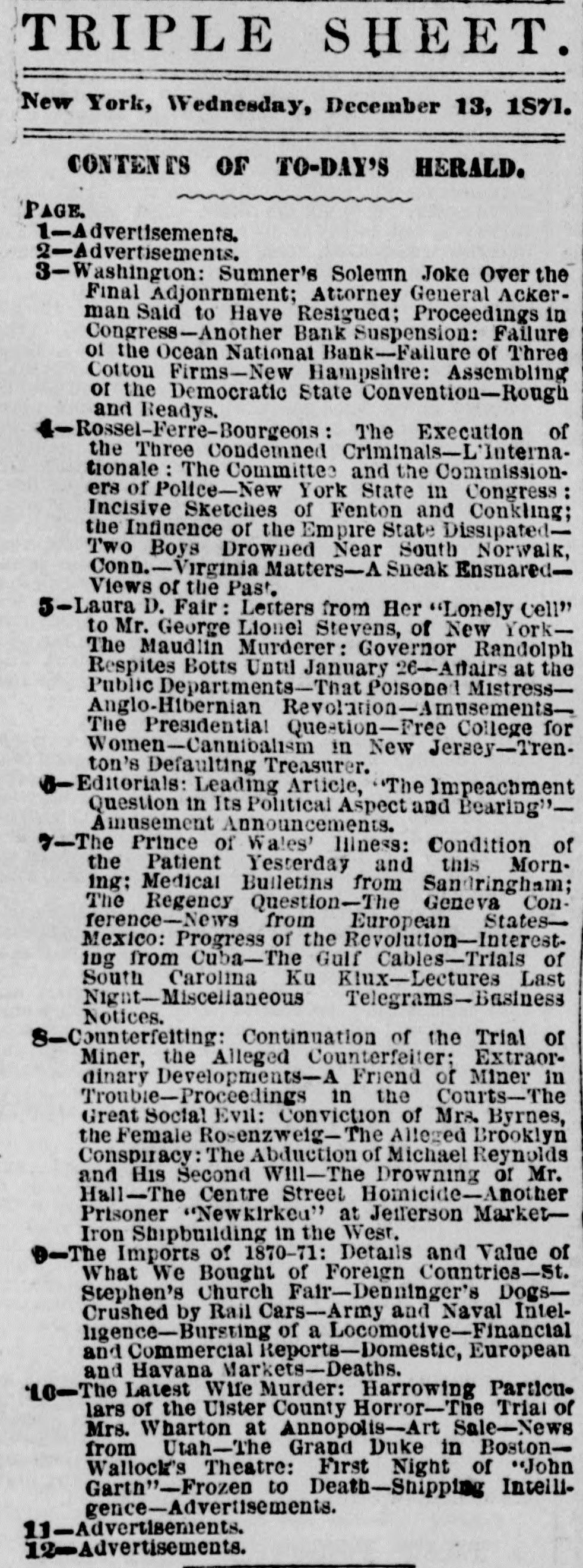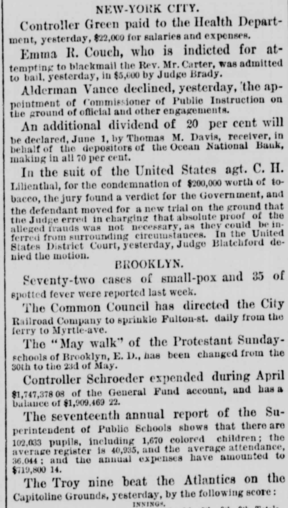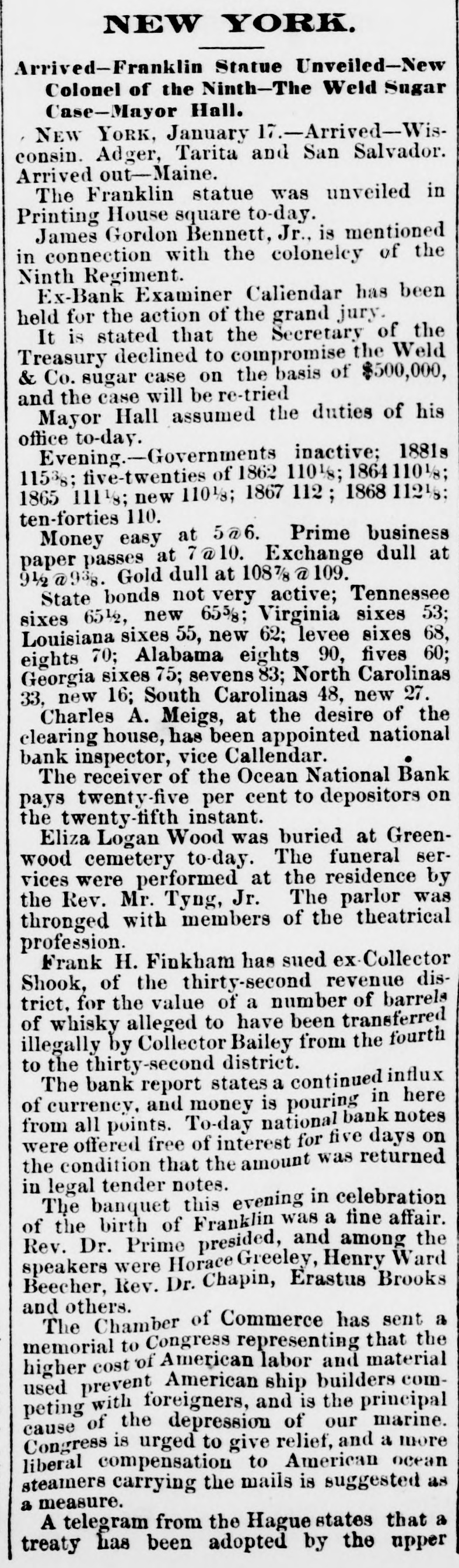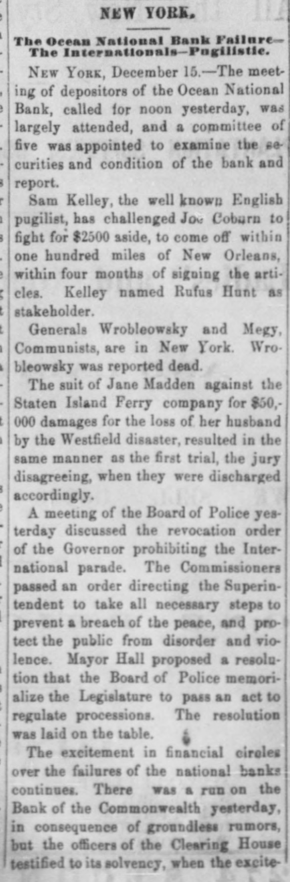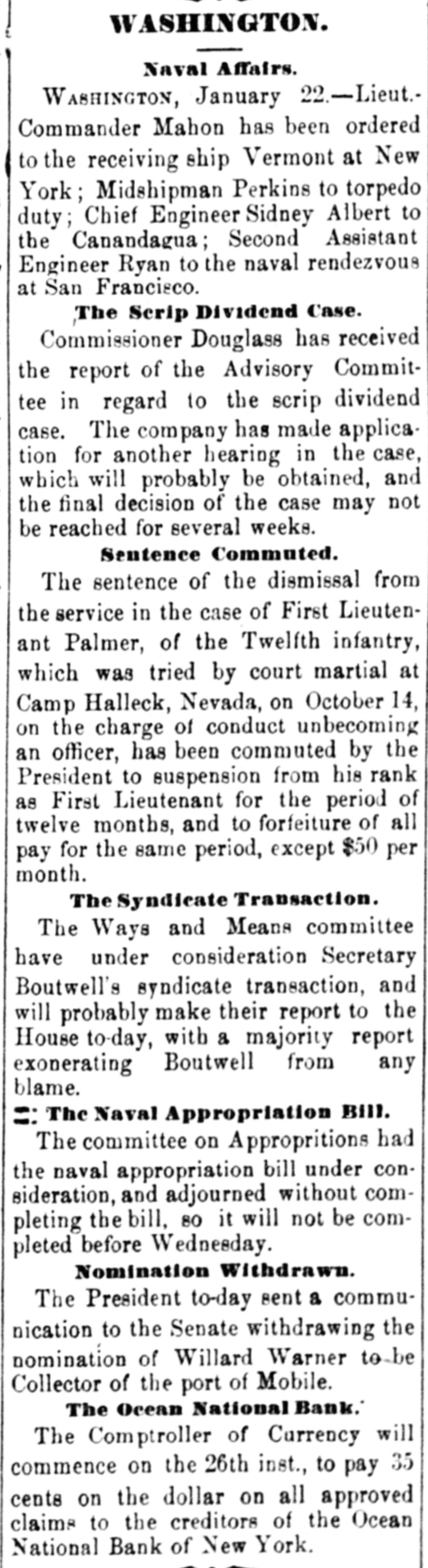 MEMENTO OF A GREAT BURGLARY. THE OCEAN NATIONAL BANK'S LAST REMAINING ASSETS SOLD AT AUCTION YESTERDAY-THE GREAT ROBBERY IN 1869 AND THE SUBSEQUENT FAILURE. The remaining assets of the Ocean National Bank having been carefully swept together, were yesterday disposed of at auction in the Exchange salesroom The event attracted a good many persons other than buyers, who manifested an eager interest in the proceedings. The stockholders, it supears, desired post ponement of the sale until such time as they could investigate the work of the receiver, and at meeting at the office of ex Mayor Opdyke, a few days ago, a committee was appointed to call upon the Comptroller of the Currency and ask such postponement On Monday, Mr. Knox telegraphed Mr. Morrel, of the committee**I decline to order postponement of sale." Property of various kinds was sold, comprising mainly real estate, collaterals and judgments. The Irondale coal and iron property in Preston county, W. Va. comprising 1,120 acres of land, together with structures and improvements, was sold to James Hodges, one of the shareholders of the institution, for $20,000. This was the most Important item on the schedule. Seven thousand acres of prairie farming land in the southern portion of the State of Illinois was sold in tracts at seemingly low figure; 1,260 acres of 11 in Massac county brought thirty cents an acre, Jackson county lands brought from thirty cents to $2 80 an acre; Williamson county from twenty five cents to $4 acre, and Johnson county from $2.27 to $2.30 an acre. A farm lot in Carbondale, III., was knocked down for $12. mass of call loans, collaterals and judgments were sold at from $1 10 $100. On call loan of J. K. Gapin for over $41,000, 150 shares of Portage Lake Canal Company stock as collateral, were sold for $15 50. This is the same security that was deposited by Bank Inspector Callendar on call loan when he became in, the time the failure, A number of notes and drafts sold from $1 $5 each. BONDS, STOCKS AND LIFE INSURANCE POLICIES. A list comprising 500 shares Warner Petroleum Min ing Company of Indianapolis, Ind 200 shares Anticlinal Oil Mining Company of Indianapolis, Ind. 1,000 shares Houman Gold Mining Company of Colorado, and 10 shares Salisbury Economic Fuel Furnace Company New York sold for $6 10 shares CarbonRailroad Company of Illinois $2: 485 shares first preferred stock of the Brunswic and Albany Railroad Company and 970 shares Brunsw and Albany Railroad Company. common stock, sold for $18 SOU shares Portage Lake and Lake Superior Ship Canal Company sold for 100 shares and Gordonsville Railroad Company and $5,000 of bonds issued by the Logan County Mining and Manufacturing Company, of Virginia, sold for $12; $500 bond of Mount Vernon Railroad Company, of Immois brought $10 470 shares Washington, Alexandria Georgetown Railroad Company stock and 420 shares Merchants National Bank, of Washington, D. brought $21 first mortgage bond the Toledo, Lo gansport and Northern Indiana Railroad Company for $1,000 brought $15 lot 800 shares Gold Hill Min ing Company stock, 50 shares American Plate Glass Company, 178 shares Waterbury Kuitting Company, 50 shares Craftsmen's Life Assurance Company shares Miners National Bank, of Salt Lake, and 754 bonds issued by the Brunswick and Florida Railroad Company, brought the astounding value of $55 50. paid up policy for 1.650 on the life Mutual Benefit of Newark, James the Davett, sold for $505. paid up policy in the Mutual Lile of Alfred Jr Smith, brought life $3,570 on the $2,450. policies on the life of Samuel S. Bowman one the Home for $5,000, and one the Manhattan for $10,000, sold respectively for $1,150 and $3,025. The total proceeds of the sale. which was made by Adrian Muller & Son, auctioneers, will reach per haps $35,000 Mr M. Davis, receiver of the bank, stated yeater day that ne should pay deposito another dividend of three per cent on April 5. not from the proceeds of this sale, which will make seventy-five cents paid thus far in all. BANK STORY THE THK OF with The Ocean National Bank has history filled events that are well fixed the memory of the pub lic. It was organized first State bank. about twenty years ago. After the noted robbery took place, in 1869, the institution gradually Bunk dow until was finally enguifed in bankruptcy in 1871 During the latter year had for one its directors no less a per Bouage than Mr William M. Tweed, who resigned alter a months term of office, RORBERT. GREAT THE The robbery of the Ocean Bank, on the 27th day of June, 1869, was remarkable for its skillal contrivance and successful execution. It created sensation at the time, and afforded the detective epartment such case for vestigation as seldom presented. The bank's office was then ou the corner of Greenw ich and Fulton streets. Below upon nent floor, leased to one O'Kell. were the offices of brokors, where, about two weeks before the robbery. desk room was obtained by stranger. who soon altor blazoned out sign over the Fulton street entrance of Newcomt & O'Neil. The actions of the newcomor were little singular from the outset. but not sufficiently 80 to cite any grave suspicions. He rarely spoke to other occupants, and gentleman occupying an Joining room was surprised to find one day that the systerious stranger had pailed down the sash intervening window. and had introduced as part his office furniture huge wardrobe, reaching nearly to the celling. He little thought, however, that this wardrobe served screen bide operations that were then progressing of cutting a hole through the overhanging floor the bank On Monday morning. the 27th of June, 1869, the porter of the bank discovered that an amazing burglary had been perpetrated. A strong smell of powder lirst attracted his attention. Scattered about the floor were half dozen caps, and a like number of overcoats, blouses and overalls, such as are usually worn by machinists. Oil cloths, rubber shoes, saws. jack screws, lanterns flasks