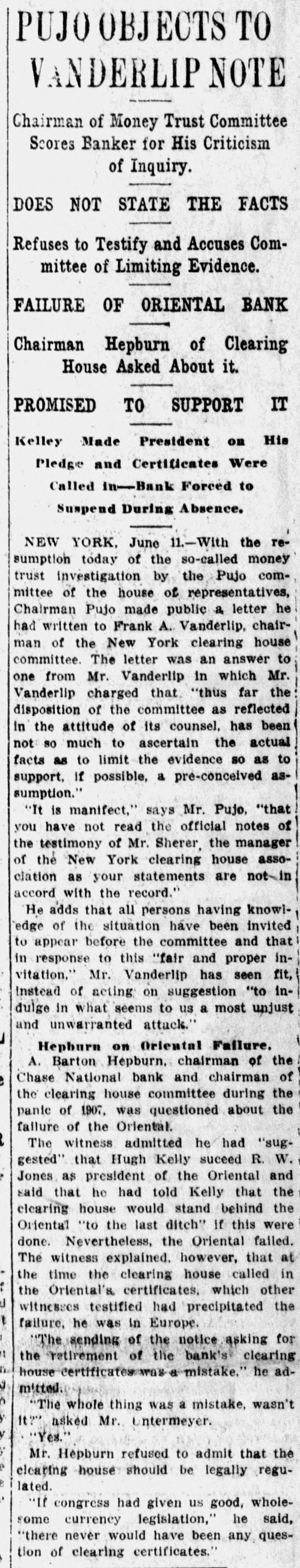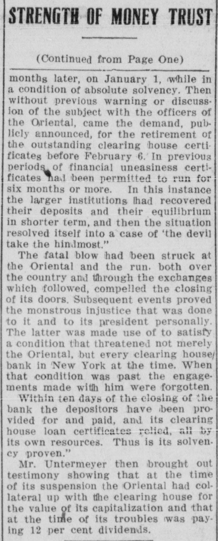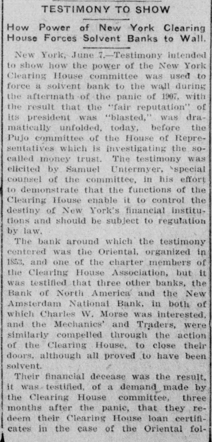 TESTIMONY TO SHOW How Power of New York Clearing House Forces Solvent Banks to Wall. New York, June 7.-Testimony intended to show how the power of the New York Clearing House committee was used to force a solvent bank to the wall during the aftermath of the panic of 1907, with the result that the "fair reputation" of its president was "blasted," was dramatically unfolded, today, before the Pujo committee of the House of Representatives which is investigating the socalled money trust. The testimony was elicited by Samuel Untermyer, `special counsel of the committee, in his effort to demonstrate that the functions of the Clearing House enable it to control the destiny of New York's financial institutions and should be subject to regulation by law. The bank around which the testimony centered was the Oriental, organized in 1853, and one of the charter members of the Clearing House Association, but it was testified that three other banks, the Bank of North America and the New Amsterdam National Bank, in both of which Charles W. Morse was interested, and the Mechanics' and Traders, were similarly compelled through the action of the Clearing House, to close their doors, although all proved to have been solvent. Their financial decease was the result, it was testified, of a demand made by the Clearing House committee, three months after the panie, that they redeem their Clearing House loan certificates in the case of the Oriental fol-