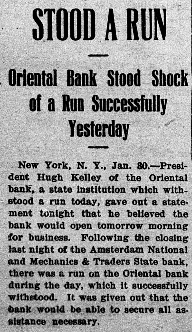 STOOD A RUN I Oriental Bank Stood Shock of a Run Successfully Yesterday I New York, N. Y., Jan. 30.-President Hugh Kelley of the Oriental bank, a state institution which withstood a run today, gave out a statement tonight that he believed the bank would open tomorrow morning for business. Following the closing last night of the Amsterdam National and Mechanics & Traders State bank, there was a run on the Oriental bank during the day, which it successfully withstood. It was given out that the bank would be able to secure all assistance necessary.