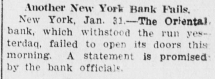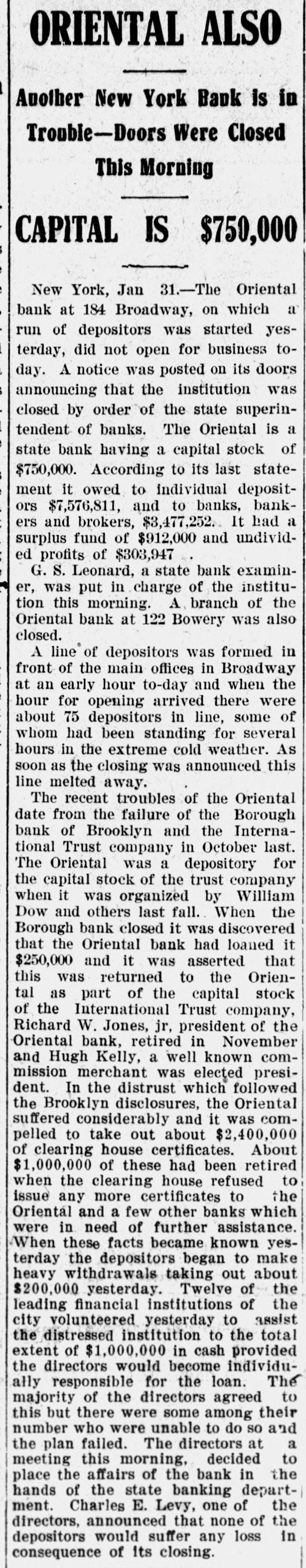 ORIENTAL ALSO Another New York Bank is in Trouble-Doors Were Closed This Morning CAPITAL IS $750,000 New York, Jan 31.-The Oriental bank at 184 Broadway, on which a run of depositors was started yesI terday, did not open for business today. A notice was posted on its doors announcing that the institution was closed by order of the state superintendent of banks. The Oriental is a state bank having a capital stock of $750,000. According to its last statement it owed to individual depositors $7,576,811, and to banks, bankers and brokers, $3,477,252. It had a surplus fund of $912,000 and undivided profits of $303,947 G. S. Leonard, a state bank examiner, was put in charge of the institution this morning. A. branch of the Oriental bank at 122 Bowery was also closed. A line of depositors was formed in front of the main offices in Broadway at an early hour to-day and when the hour for opening arrived there were about 75 depositors in line, some of whom had been standing for several hours in the extreme cold weather. As soon as the closing was announced this line melted away. The recent troubles of the Oriental date from the failure of the Borough bank of Brooklyn and the International Trust company in October last. The Oriental was a depository for the capital stock of the trust company when it was organized by William Dow and others last fall. When the Borough bank closed it was discovered that the Oriental bank had loaned it $250,000 and it was asserted that this was returned to the Oriental as part of the capital stock of the International Trust company, Richard W. Jones, jr, president of the Oriental bank, retired in November and Hugh Kelly, a well known commission merchant was elected president. In the distrust which followed the Brooklyn disclosures, the Oriental suffered considerably and it was compelled to take out about $2,400,000 of clearing house certificates. About $1,000,000 of these had been retired when the clearing house refused to issue any more certificates to the Oriental and a few other banks which were in need of further assistance. When these facts became known yesterday the depositors began to make heavy withdrawals taking out about $200,000 yesterday. Twelve of the leading financial institutions of the city volunteered yesterday to assist the distressed institution to the total extent of $1,000,000 in cash provided the directors would become individually responsible for the loan. The majority of the directors agreed to this but there were some among their number who were unable to do SO and a the plan failed. The directors at meeting this morning, decided to place the affairs of the bank in the hands of the state banking department. Charles E. Levy, one of the directors, announced that none of the depositors would suffer any loss in consequence of its closing.