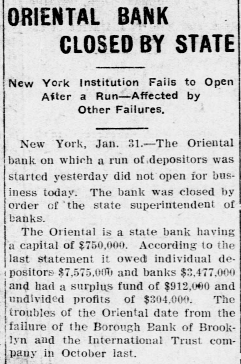 ORIENTAL BANK CLOSED BY STATE New York Institution Fails to Open After a Run-Affected by Other Failures, New York, Jan. 31.-The Oriental bank on which a run of depositors was started yesterday did not open for business today. The bank was closed by order of the state superintendent of banks. The Oriental is a state bank having a capital of $750,000. According to the last statement it owed individual depositors $7,575,000 and banks $3,477,000 and had a surplus fund of $912,000 and undivided profits of $304,000. The troubles of the Oriental date from the failure of the Borough Bank of Brooklyn and the International Trust company in October last.