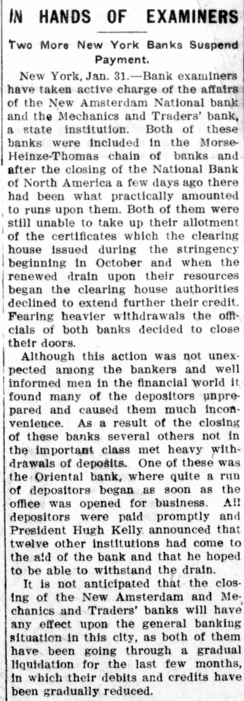 IN HANDS OF EXAMINERS Two More New York Banks Suspend Payment. New York, Jan. 31.-Bank examiners have taken active charge of the affairs of the New Amsterdam National bank and the Mechanics and Traders' bank, a state institution. Both of these banks were included in the MorseHeinze-Thomas chain of banks and after the closing of the National Bank of North America a few days ago there had been what practically amounted to runs upon them. Both of them were still unable to take up their allotment of the certificates which the clearing house issued during the stringency beginning in October and when the renewed drain upon their resources began the clearing house authorities declined to extend further their credit. Fearing heavier withdrawals the officials of both banks decided to close their doors. Although this action was not unexpected among the bankers and well informed men in the financial world it found many of the depositors unprepared and caused them much inconvenience. As a result of the closing of these banks several others not in the important class met heavy withdrawals of deposits. One of these was the Oriental bank, where quite a run of depositors began as soon as the office was opened for business. All depositors were paid promptly and President Hugh Kelly announced that twelve other institutions had come to the aid of the bank and that he hoped to be able to withstand the drain. It is not anticipated that the closing of the New Amsterdam and Mechanics and Traders' banks will have any effect upon the general banking situation in this city, as both of them have been going through a gradual liquidation for the last few months, in which their debits and credits have been gradually reduced.