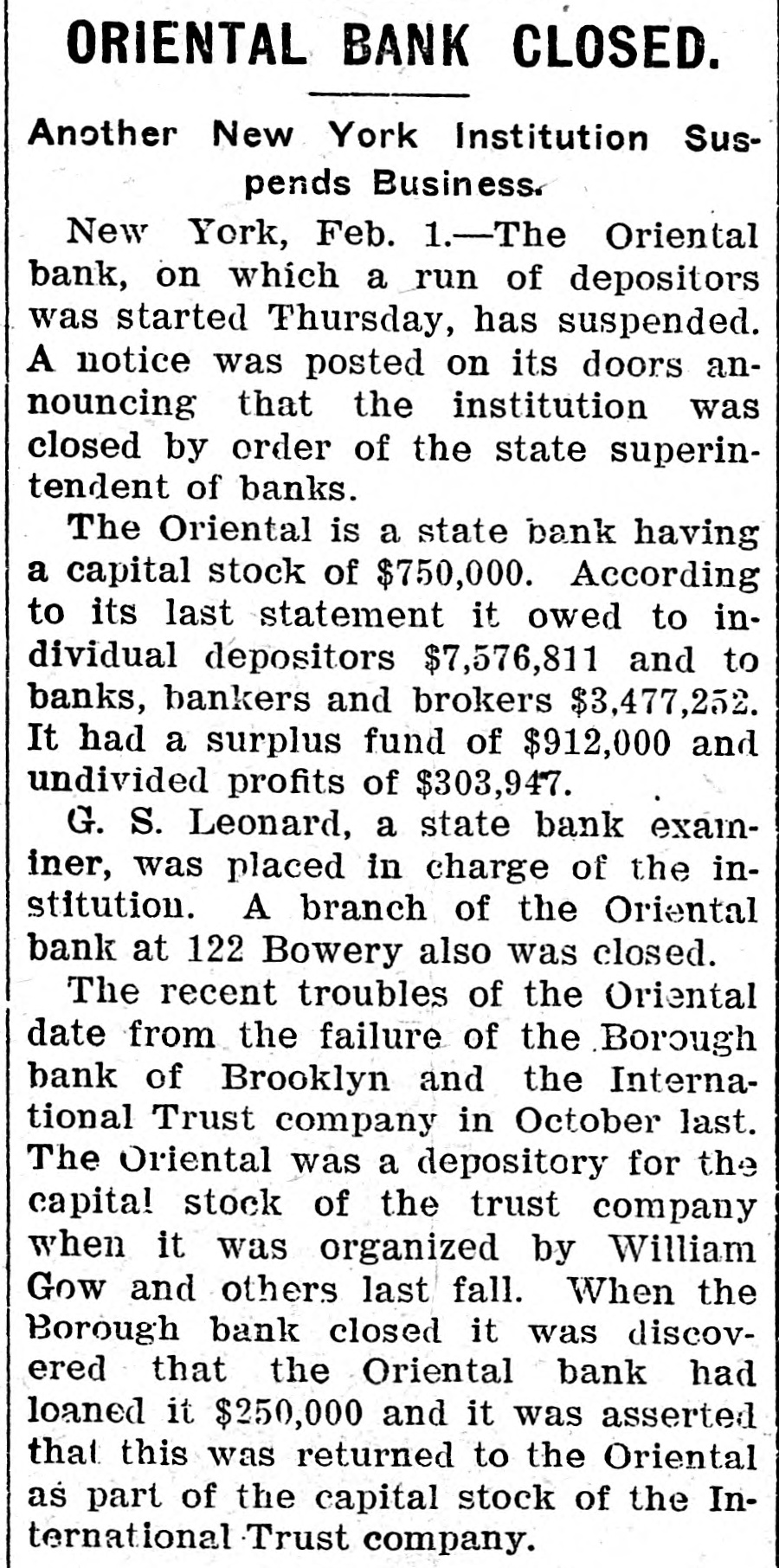 ORIENTAL BANK CLOSED. Another New York Institution Suspends Business. New York, Feb. 1.-The Oriental bank, on which a run of depositors was started Thursday, has suspended. A notice was posted on its doors announcing that the institution was closed by order of the state superintendent of banks. The Oriental is a state bank having a capital stock of $750,000. According to its last statement it owed to individual depositors $7,576,811 and to banks, bankers and brokers $3,477,252. It had a surplus fund of $912,000 and undivided profits of $303,947. G. S. Leonard, a state bank exaininer, was placed in charge of the institution. A branch of the Oriental bank at 122 Bowery also was closed. The recent troubles of the Oriental date from the failure of the Borough bank of Brooklyn and the International Trust company in October last. The Oriental was a depository for the capital stock of the trust company when it was organized by William Gow and others last fall. When the Borough bank closed it was discovered that the Oriental bank had loaned it $250,000 and it was asserted that this was returned to the Oriental as part of the capital stock of the International Trust company.
