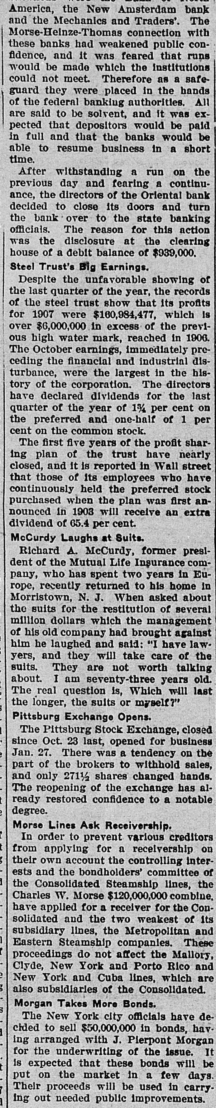 America, the New Amsterdam bank and the Mechanics and Traders'. The Morse-Heinze-Thomas connection with these banks had weakened public confidence, and it was feared that runs would be made which the institutions could not meet. Therefore as a safeguard they were placed in the hands of the federal banking authorities. All are said to be solvent, and it was expected that depositors would be paid in full and that the banks would be able to resume business in a short time. After withstanding a run on the previous day and fearing a continuance, the directors of the Oriental bank decided to close its doors and turn the bank over to the state banking officials. The reason for this action was the disclosure at the clearing house of a debit balance of $939,000. # Steel Trust's Big Earnings. Despite the unfavorable showing of the last quarter of the year, the records of the steel trust show that its profits for 1907 were $160,984,477, which is over $6,000,000 in excess of the previous high water mark, reached in 1906. The October earnings, immediately preceding the financial and industrial disturbance, were the largest in the history of the corporation. The directors have declared dividends for the last quarter of the year of 1¼ per cent on the preferred and one-half of 1 per cent on the common stock. The first five years of the profit sharing plan of the trust have nearly closed, and it is reported in Wall street that those of its employees who have continuously held the preferred stock purchased when the plan was first announced in 1903 will receive an extra dividend of 65.4 per cent. # McCurdy Laughs at Suits. Richard A. McCurdy, former president of the Mutual Life Insurance company, who has spent two years in Europe, recently returned to his home in Morristown, N. J. When asked about the suits for the restitution of several million dollars which the management of his old company had brought against him he laughed and said: "I have lawyers, and they will take care of the suits. They are not worth talking about. I am seventy-three years old. The real question is, Which will last the longer, the suits or myself?" # Pittsburg Exchange Opens. The Pittsburg Stock Exchange, closed since Oct. 23 last, opened for business Jan. 27. There was a tendency on the part of the brokers to withhold sales, and only 271½ shares changed hands. The reopening of the exchange has already restored confidence to a notable degree. # Morse Lines Ask Receivership. In order to prevent various creditors from applying for a receivership on their own account the controlling interests and the bondholders' committee of the Consolidated Steamship lines, the Charles W. Morse $120,000,000 combine, have applied for a receiver for the Consolidated and the two weakest of its subsidiary lines, the Metropolitan and Eastern Steamship companies. These proceedings do not affect the Mallory, Clyde, New York and Porto Rico and New York and Cuba lines, which are also subsidiaries of the Consolidated. # Morgan Takes More Bonds. The New York city officials have decided to sell $50,000,000 in bonds, having arranged with J. Pierpont Morgan for the underwriting of the issue. It is expected that these bonds will be put on the market in a few days. Their proceeds will be used in carrying out needed public improvements.