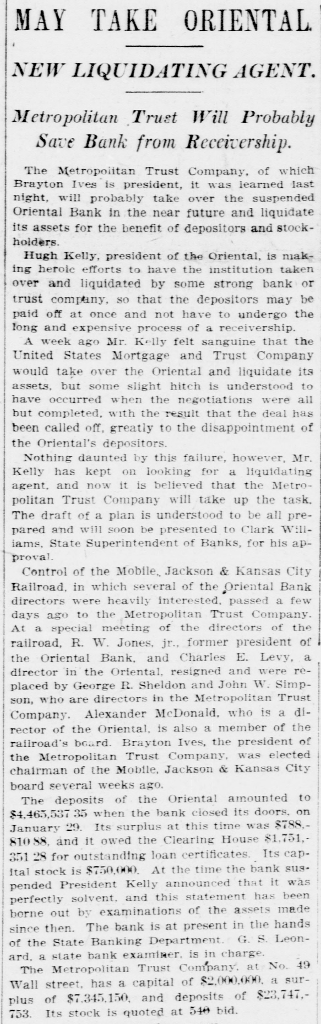 MAY TAKE ORIENTAL NEW LIQUIDATING AGENT. Metropolitan Trust Will Probably Save Bank from Receivership. The Metropolitan Trust Company, of which Brayton Ives is president, it was learned last night, will probably take over the suspended Oriental Bank in the near future and liquidate its assets for the benefit of depositors and stockholders. Hugh Kelly, president of the Oriental, is making heroic efforts to have the institution taken over and liquidated by some strong bank or trust company, so that the depositors may be paid off at once and not have to undergo the long and expensive process of a receivership. A week ago Mr. Kelly felt sanguine that the United States Mortgage and Trust Company would take over the Oriental and liquidate its assets. but some slight hitch is understood to have occurred when the negotiations were all but completed, with the result that the deal has been called off, greatly to the disappointment of the Oriental's depositors. Nothing daunted by this failure, however, Mr. Kelly has kept on looking for a liquidating agent, and now it is believed that the Metropolitan Trust Company will take up the task. The draft of a plan is understood to be all prepared and will soon be presented to Clark Williams, State Superintendent of Banks, for his approval. Control of the Mobile, Jackson & Kansas City Railroad, in which several of the Oriental Bank directors were heavily interested, passed a few days ago to the Metropolitan Trust Company. At a special meeting of the directors of the railroad, R. W. Jones, jr., former president of the Oriental Bank, and Charles E. Levy, a director in the Oriental, resigned and were replaced by George R. Sheldon and John W. Simpson, who are directors in the Metropolitan Trust Company. Alexander McDonald, who is a director of the Oriental, is also a member of the railroad's board. Brayton Ives, the president of the Metropolitan Trust Company, was elected chairman of the Mobile, Jackson & Kansas City board several weeks ago. The deposits of the Oriental amounted to $4,465,537.33 when the bank closed its doors. on January 29. Its surplus at this time was $788.81088, and it owed the Clearing House $1.751,351 28 for outstanding loan certificates. Its capital stock is $750,000. At the time the bank suspended President Kelly announced that it was perfectly solvent. and this statement has been borne out by examinations of the assets made since then. The bank is at present in the hands of the State Banking Department. G. S. Leonard. a state bank examiner. is in charge. The Metropolitan Trust Company, at No. 49 Wall street, has a capital of $2,000,000. a surplus of $7,345,150. and deposits of $23,747,753. Its stock is quoted at 540 bid.
