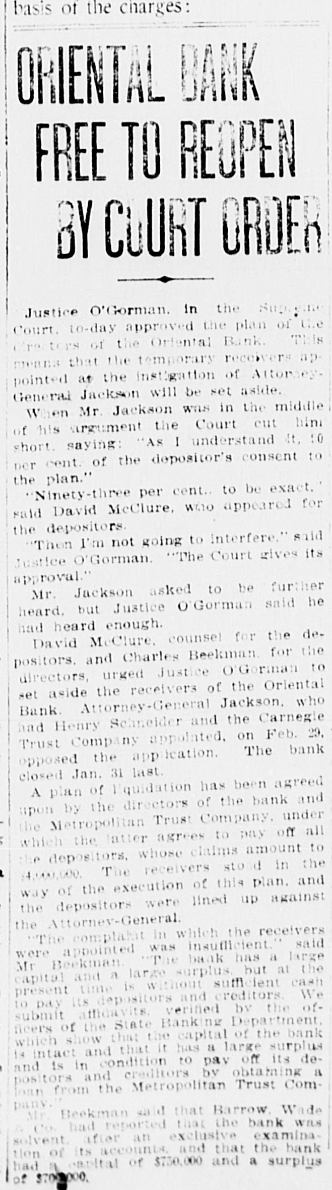 basis of the charges: ORIENTAL BANK FREE TO REOPEN BY COURT ORDER Justice O'Gorman. in the Supreme Court. to-day approved the plan of the Creators of the Oriental Bank. This means that the temporary receivers appointed at the instigation of AttorneyGeneral Jackson will be set aside. When Mr. Jackson WILS in the middle of his argument the Court cut him short. saying: "As I understand it, :0 per cent. of the depositor's consent to the plan." "Ninety-three per cent. to be exact." said David McClure, who appeared for the depositors. "Then I'm not going to interfere." said Justice O'Gorman. "The Court gives its approval." Mr. Jackson asked to be further heard. but Justice O'Gorman said he had heard enough. David McClure. counsel for the depositors. and Charles Beekman. for the directors, urged Justice O'Gorman to set aside the receivers of the Oriental Bank. Attorney-General Jackson. who had Henry Schneider and the Carnegie Trust Company appointed, on Feb. 29, opposed the application. The bank closed Jan. 31 last. A plan of l'quidation has been agreed upon by the directors of the bank and the Metropolitan Trust Company. under which the latter agrees to pay off all the depositors, whose claims amount to $4,000,000. The receivers sto di in the way of the execution of this plan. and the depositors were lined up against the Attorney-General. "The complaint in which the receivers were appointed was insuflicient." said Mr Beekman. The bank has a large capital and a large surplus. but at the present time is without sufficient cash to pay its depositors and creditors. We submit affidavits. verified by the officers of the State Banking Department. which show that the capital of the bank is intact and that it has a large surplus and is in condition to pay off its depositors and creditors by obtaining a loan from the Metropolitan Trust Company. Mr. Beekman said that Barrow. Wade & Co. had reported that the bank was solvent. after an exclusive examination of its accounts, and that the bank had & capital of $750,000 and a surplus