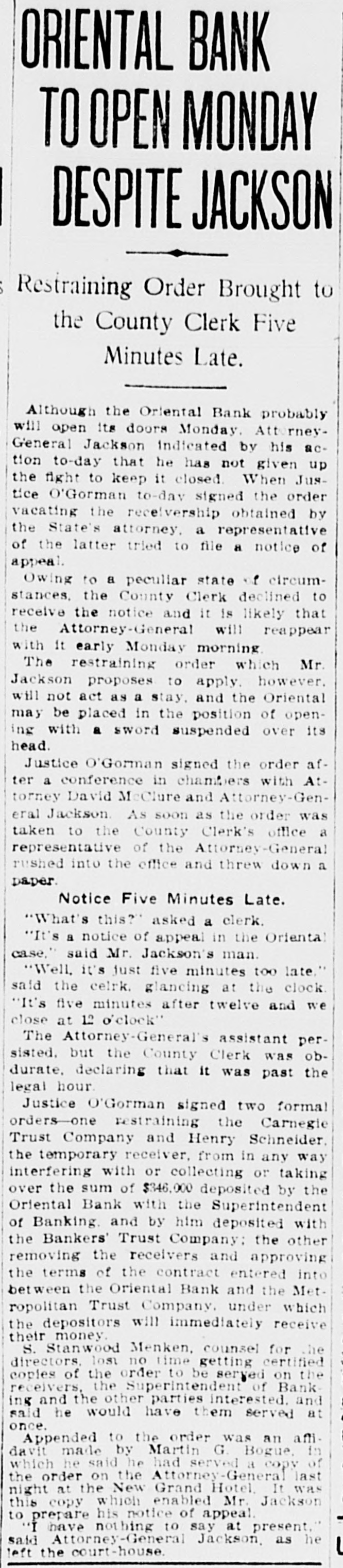ORIENTAL BANK TO OPEN MONDAY DESPITE JACKSON Restraining Order Brought to the County Clerk Five Minutes Late. Although the Oriental Bank probably will open its doors Monday. AttorneyGeneral Jackson indicated by his action to-day that he has not given up the fight to keep it closed. When Justice O'Gorman to-day signed the order vacating the receivership obtained by the State's attorney. a representative of the latter tried to file a notice of appeal. Owing to a peculiar state of circumstances. the County Clerk declined to receive the notice and it is likely that the Attorney-General will reappear with it early Monday morning. The restraining order which Mr. Jackson proposes to apply. however. will not act as a stay, and the Oriental may be placed in the position of opening with a sword suspended over its head. Justice O'Gorman signed the order after a conference in chambers with Attorney David McClure and Attorney-General Jackson As soon as the order was taken to the County Clerk's office a representative of the Attorney-General rushed into the office and threw down a paper. Notice Five Minutes Late. "What's this?" asked a clerk. "It's a notice of appeal in the Oriental case," said Mr. Jackson's man. "Well, it's just five minutes too late." said the celrk. glancing at the clock "It's five minutes after twelve and we close at 12 o'clock" The Attorney-General's assistant persisted. but the County Clerk was obdurate, declaring that it was past the legal hour. Justice O'Gorman signed two formal orders-one restraining the Carnegie Trust Company and Henry Schneider. the temporary receiver, from in any way interfering with or collecting or taking over the sum of $346,000 deposited by the Oriental Bank with the Superintendent of Banking and by him deposited with the Bankers' Trust Company: the other removing the receivers and approving the terms of the contract entered into between the Oriental Bank and the Metropolitan Trust Company. under which the depositors will immediately receive their money. S. Stanwood Menken, counsel for the directors, lost no time getting certified copies of the order to be served on the receivers, the Superintendent of Bank ing and the other parties interested. and said he would have them served at once. Appended to the order was an affidavit made by Martin G Bogue, in which he said he had served a copy of the order on the Attorney-General last night at the New Grand Hotel It was this copy which enabled Mr. Jackson to prepare his notice of appeal. "I have nothing to say at present," said Attorney-General Jackson, as he left the court-house.