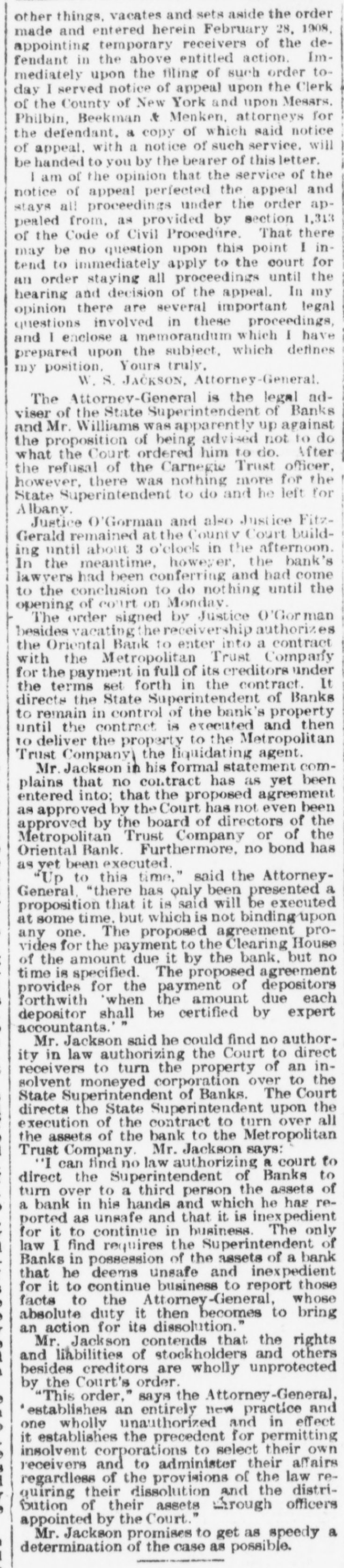 other things. vacates and sets aside the order made and entered herein February 28, 1908. appointing temporary receivers of the defendant in the above entitled action. Immediately upon the filing of such order today I served notice of appeal upon the Clerk of the County of New York and upon Messrs. Philbin, Beekman x Menken, attorneys for the defendant. a copy of which said notice of appeal. with a notice of such service. will be handed to you by the bearer of this letter. I am of the opinion that the service of the notice of appeal perfected the appeal and stays all proceedings under the order appealed from. as provided by section 1,313 of the Code of Civil Procedure. That there may be no question upon this point I intend to immediately apply to the court for an order staying all proceedings until the hearing and decision of the appeal. In my opinion there are several important legal questions involved in these proceedings, and I enclose a memorandum which I have prepared upon the subject, which defines my position. Yours truly. W. S. JACKSON, Attorney-General. The Attornev-General is the legal adviser of the State Superintendent of Banks and Mr. Williams was apparently up against the proposition of being advised not to do what the Court ordered him to do. After the refusal of the Carnegie Trust officer. however, there was nothing more for the State Superintendent to do and he left for Albany. Justice O'Gorman and also Justice FitzGerald remained at the County Court building until about 3 o'clock in the afternoon. In the meantime, however, the bank's lawyers had been conferring and had come to the conclusion to do nothing until the opening of court on Monday. The order signed by Justice O'Gorman besides vacating the receivership authorizes the Oriental Bank to enter into a contract with the Metropolitan Trust Company for the payment in full of its creditors under the terms set forth in the contract. It directs the State Superintendent of Banks to remain in control of the bank's property until the contract is executed and then to deliver the property to the Metropolitan Trust Company the liquidating agent. Mr. Jackson in his formal statement complains that no contract has as yet been entered into: that the proposed agreement as approved by the Court has not even been approved by the board of directors of the Metropolitan Trust Company or of the Oriental Bank. Furthermore, no bond has as yet been executed. "Up to this time." said the AttorneyGeneral "there has only been presented a proposition that it is said will be executed at some time. but which is not binding upon any one. The proposed agreement provides for the payment to the Clearing House of the amount due it by the bank. but no time is specified. The proposed agreement provides for the payment of depositors forthwith 'when the amount due each depositor shall be certified by expert accountants.'' Mr. Jackson said he could find no authority in law authorizing the Court to direct receivers to turn the property of an insolvent moneyed corporation over to the State Superintendent of Banks. The Court directs the State Superintendent upon the execution of the contract to turn over all the assets of the bank to the Metropolitan Trust Company. Mr. Jackson says: "I can find no law authorizing a court to direct the Superintendent of Banks to turn over to a third person the assets of a bank in his hands and which he has reported as unsafe and that it is inexpedient for it to continue in business. The only law I find requires the Superintendent of Banks in possession of the assets of a bank that he deems unsafe and inexpedient for it to continue business to report those facts to the Attorney -General, whose absolute duty it then becomes to bring an action for its dissolution." Mr. Jackson contends that the rights and liabilities of stockholders and others besides creditors are wholly unprotected by the Court's order. "This order," says the Attorney-General, 'establishes an entirely new practice and one wholly unauthorized and in effect it establishes the precedent for permitting insolvent corporations to select their own receivers and to administer their affairs regardless of the provisions of the law reQuiring their dissolution and the distriDution of their assets through officers appointed by the Court." Mr. Jackson promises to get as speedy a determination of the case as possible.