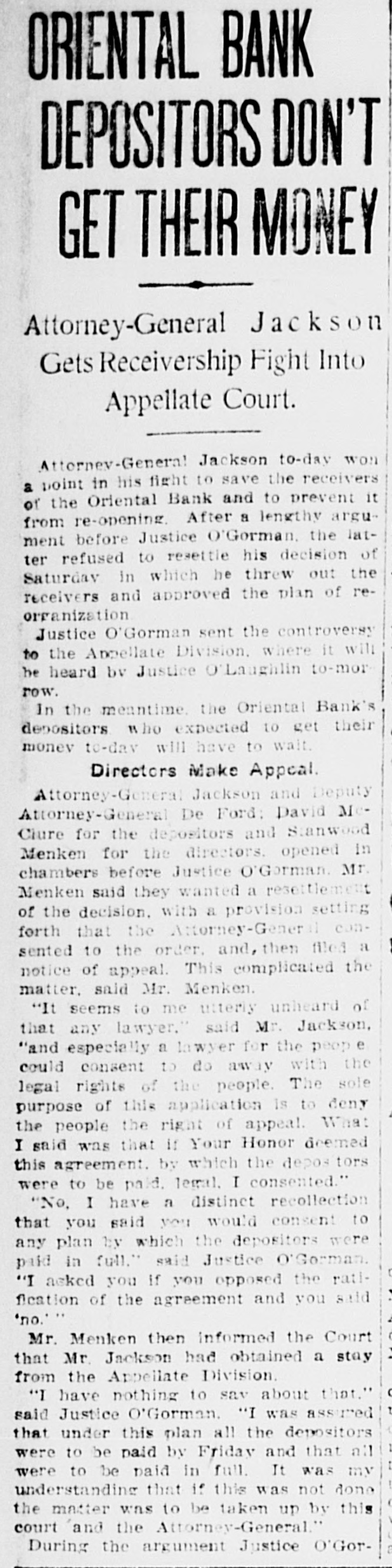 ORIENTAL BANK DEPOSITORS DON'T GET THEIR MONEY Attorney-General Jackson Gets Receivership Fight Into Appellate Court. Attorney-General Jackson to-day won point in his fight to save the receivers a of the Oriental Bank and to prevent it from re-opening. After a lengthy argument before Justice O'Gorman. the latter refused to resettle his decision of Saturday in which he threw out the receivers and approved the plan of reorganization Justice O'Gorman sent the controversy to the Appellate Division. where it will he heard bv Justice O'Laughlin to-mor row. In the meantime the Oriental Bank's depositors who expected to get their money to-day will have to wait. Directors Make Appeal. Attorney-General Jackson and Deputy Attorney-General De Ford: David MeClure for the depositors and Stanwood Menken for the directors. opened in chambers before Justice O'Gorman. Mr. Menken said they wanted a resettlement of the decision. with a provision setting forth that the Attorney-General consented to the order. and, then filed a notice of appeal. This complicated the matter. said Mr. Menken. "It seems to me utterly unheard of that any lawyer." said Mr. Jackson, "and especially a lawyer for the peop could consent to do away with the legal rights of the people. The sole purpose of this application is to deny the people the right of appeal. What I said was that If Your Honor deemed this agreement. by which the depos tors were to be paid. legal. I consented." "No. I have a distinct recollection that you said you would consent to any plan by which the depositors were paid in full." said Justice O'German. "I asked you If you opposed the ratifleation of the agreement and you said 'no.''' Mr. Menken then informed the Court .. that Mr. Jackson had obtained a stay from the Appellate Division. o "I have nothing to sav about that." 1 said Justice O'Gorman. "I was assured that under this plan all the depositors were to be paid by Friday and that all were to be paid in full. It was my understanding that if this was not done the matter was to be taken up by this court and the Attorney-General." During the argument Justice O'Gor-