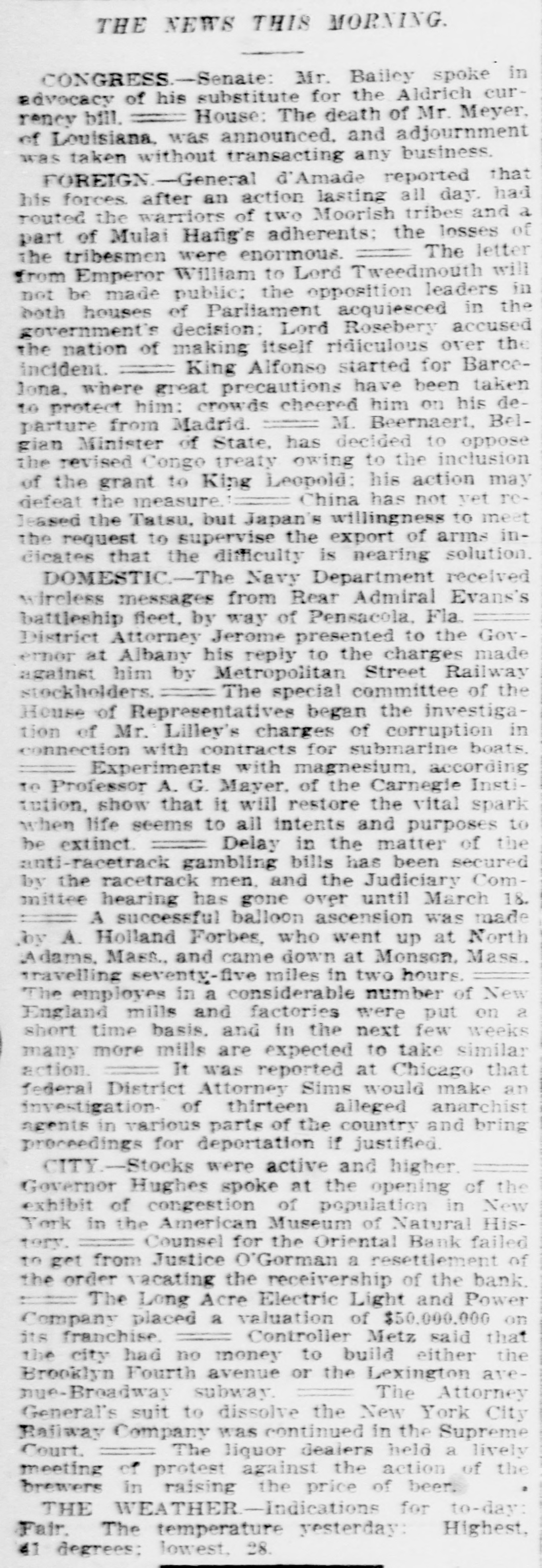 THE NEWS THIS MORNING. CONGRESS.-Senate: Mr. Bailey spoke in advocacy of his substitute for the Aldrich currency bill. House: The death of Mr. Meyer, of Louisiana, was announced. and adjournment was taken without transacting any business. FOREIGN-General d'Amade reported that his forces. after an action lasting all day. had routed the warriors of two Moorish tribes and a part of Mulai Hafig's adherents: the losses of the tribesmen were enormous. The letter from Emperor William to Lord Tweedmouth will not be made public: the opposition leaders in both houses of Parliament acquiesced in the government's decision: Lord Rosebery accused the nation of making itself ridiculous over the incident. King Alfonso started for Barcelona, where great precautions have been taken to protect him: crowds cheered him on his departure from Madrid. M. Beernaert, Belgian Minister of State, has decided to oppose the revised Congo treaty owing to the inclusion of the grant to King Leopold: his action may China has not yet redefeat the measure. leased the Tatsu, but Japan's willingness to meet the request to supervise the export of arms indicates that the difficulty is nearing solution. DOMESTIC-The Navy Department received wireless messages from Rear Admiral Evans's battleship fleet, by way of Pensacola, Fla. District Attorney Jerome presented to the Governor at Albany his reply to the charges made against him by Metropolitan Street Railway stockholders. The special committee of the House of Representatives began the investigation of Mr. Lilley's charges of corruption in connection with contracts for submarine boats. Experiments with magnesium, according to Professor A. G. Mayer. of the Carnegie Institution. show that it will restore the vital spark when life seems to all intents and purposes to be extinct. Delay in the matter of the anti-racetrack gambling bills has been secured by the racetrack men, and the Judiciary Committee hearing has gone over until March 18. A successful balloon ascension was made Joy A. Holland Forbes, who went up at North Adams. Mass., and came down at Monson. Mass. travelling seventy-five miles in two hours. The employes in a considerable number of New England mills and factories were put on a short time basis. and in the next few weeks many more mills are expected to take similar action. It was reported at Chicago that federal District Attorney Sims would make an investigation- of thirteen alleged anarchist agents in various parts of the country and bring proceedings for deportation if justified. CITY.-Stocks were active and higher. Governor Hughes spoke at the opening of the exhibit of congestion of population in New York in the American Museum of Natural HisCounsel for the Oriental Bank failed tory. to get from Justice O'Gorman a resettlement of the order vacating the receivership of the bank. The Long Acre Electric Light and Power Company placed a valuation of $50,000,000 on its franchise. Controller Metz said that the city had no money to build either the Brooklyn Fourth avenue or the Lexington arenue-Broadway subway. The Attorney General's suit to dissolve the New York City Rajiway Company was continued in the Supreme Court. The liquor dealers held a lively meeting of protest against the action of the brewers in raising the price of been THE WEATHER-Indications for to-day: Fair. The temperature yesterday: Highest, 41 degrees: lowest. 28.
