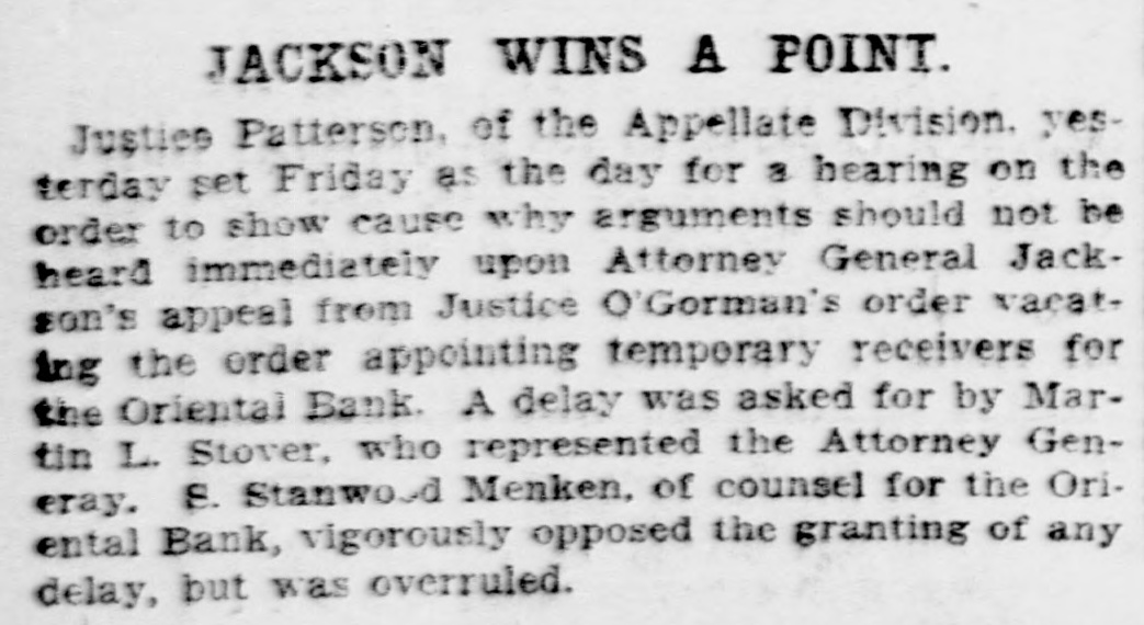 JACKSON WINS A POINT. Justice Patterson, of the Appellate Division. yesterday set Friday as the day for a hearing on the order to show cause why arguments should not be heard immediately upon Atterney General Jackson's appeal from Justice O'Gorman's order vacating the order appointing temporary receivers for the Oriental Bank A delay was asked for by Martin L. Stover, who represented the Attorney Generay. E. Stanwood Menken, of counsel for the Oriental Bank, vigorously opposed the granting of any delay, but was overruled.