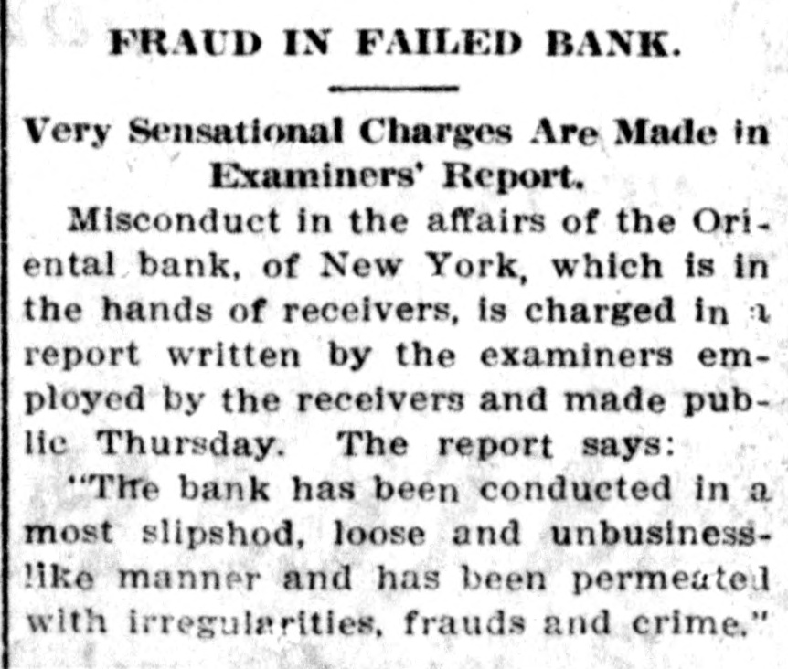 # FRAUD IN FAILED BANK. Very Sensational Charges Are Made in Examiners' Report. Misconduct in the affairs of the Oriental bank, of New York, which is in the hands of receivers, is charged in a report written by the examiners employed by the receivers and made public Thursday. The report says: "The bank has been conducted in a most slipshod, loose and unbusiness-like manner and has been permeated with irregularities, frauds and crime."
