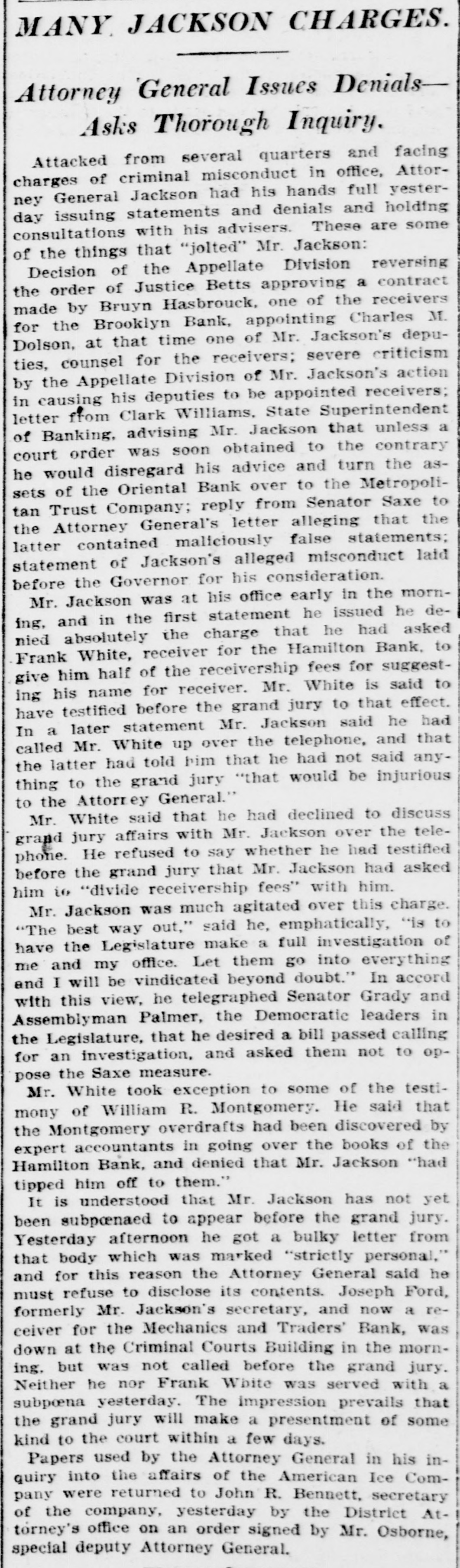 MANY JACKSON CHARGES. Attorney General Issues DenialsAsks Thorough Inquiry. Attacked from several quarters and facing charges of criminal misconduct in office, Attorney General Jackson had his hands full yesterday issuing statements and denials and holding consultations with his advisers. These are some of the things that "jolted" Mr. Jackson: Decision of the Appellate Division reversing the order of Justice Betts approving a contract made by Bruyn Hasbrouck, one of the receivers for the Brooklyn Bank, appointing Charles M. Dolson, at that time one of Mr. Jackson's deputies, counsel for the receivers; severe criticism by the Appellate Division of Mr. Jackson's action in causing his deputies to be appointed receivers; letter from Clark Williams, State Superintendent of Banking, advising Mr. Jackson that unless a court order was soon obtained to the contrary he would disregard his advice and turn the assets of the Oriental Bank over to the Metropolitan Trust Company; reply from Senator Saxe to the Attorney General's letter alleging that the latter contained maliciously false statements; statement of Jackson's alleged misconduct laid before the Governor for his consideration. Mr. Jackson was at his office early in the morning, and in the first statement he issued he denied absolutely the charge that he had asked Frank White, receiver for the Hamilton Bank, to give him half of the receivership fees for suggesting his name for receiver. Mr. White is said to have testified before the grand jury to that effect. In a later statement Mr. Jackson said he had called Mr. White up over the telephone, and that the latter had told pim that he had not said anything to the grand jury "that would be injurious to the Attorney General." Mr. White said that he had declined to discuss grand jury affairs with Mr. Jackson over the telephone. He refused to say whether he had testified before the grand jury that Mr. Jackson had asked him to "divide receivership fees" with him. Mr. Jackson was much agitated over this charge. "The best way out," said he, emphatically, "is to have the Legislature make a full investigation of me and my office. Let them go into everything and I will be vindicated beyond doubt." In accord with this view, he telegraphed Senator Grady and Assemblyman Palmer, the Democratic leaders in the Legislature, that he desired a bill passed calling for an investigation, and asked them not to oppose the Saxe measure. Mr. White took exception to some of the testimony of William R. Montgomery. He said that the Montgomery overdrafts had been discovered by expert accountants in going over the books of the Hamilton Bank, and denied that Mr. Jackson "had tipped him off to them." It is understood that Mr. Jackson has not yet been subpoenaed to appear before the grand jury. Yesterday afternoon he got a bulky letter from that body which was marked "strictly personal," and for this reason the Attorney General said he must refuse to disclose its contents. Joseph Ford, formerly Mr. Jackson's secretary, and now a receiver for the Mechanics and Traders' Bank, was down at the Criminal Courts Building in the morning. but was not the grand Neither he nor was served with subpoena that yesterday. Frank called The White impression before prevails jury. a the grand jury will make a presentment of some kind to the court within a few days. Papers used by the Attorney General in his inquiry into the affairs of the American Ice Company were returned to John R. Bennett, secretary of the company, yesterday by the District Attorney's office on an order signed by Mr. Osborne, special deputy Attorney General.