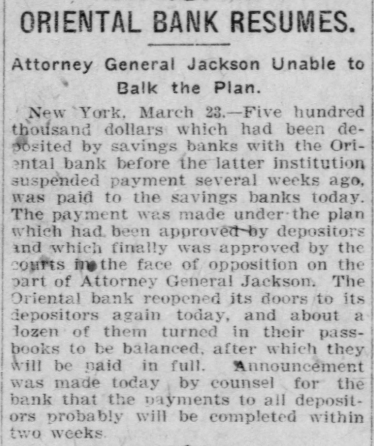 ORIENTAL BANK RESUMES. Attorney General Jackson Unable to Balk the Plan. New York, March 23.-Five hundred thousand dollars which had been deposited by savings banks with the Oriental bank before the latter institution suspended payment several weeks ago, was paid to the savings banks today. The payment was made under the plan which had. been approved by depositors and which finally was approved by the courts in the face of opposition on the part of Attorney General Jackson. The Oriental bank reopened its doors to its depositors again today, and about a dozen of them turned in their passbooks to be balanced, after which they will be paid in full. Announcement was made today by counsel for the bank that the payments to all depositors probably will be completed within two weeks.