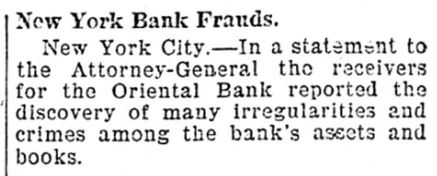 # New York Bank Frauds. New York City. —In a statement to the Attorney-General the receivers for the Oriental Bank reported the discovery of many irregularities and crimes among the bank's assets and books.
