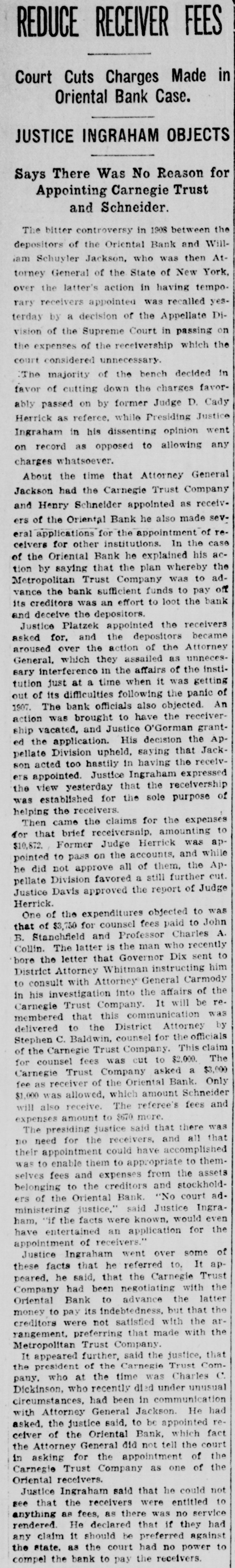JUSTICE INGRAHAM OBJECTS Says There Was No Reason for Appointing Carnegie Trust and Schneider. The bitter controversy in 1908 between the depositors of the Oriental Bank and William Schuyler Jackson, who was then Attorney General of the State of New York, over the latter's action in having temporary receivers appointed was recalled yes. terday by a decision of the Appellate Division of the Supreme Court in passing on the expenses of the receivership which the court considered unnecessary. The majority of the bench decided in favor of cutting down the charges favorably passed on by former Judge D. Cady Herrick as referee. while Presiding Justice Ingraham in his dissenting opinion went on record as opposed to allowing any charges whatsoever. About the time that Attorney General Jackson had the Carnegie Trust Company and Henry Schneider appointed as receivers of the Oriental Bank he also made several applications for the appointment of receivers for other institutions. In the case of the Oriental Bank he explained his action by saying that the plan whereby the Metropolitan Trust Company was to advance the bank sufficient funds to pay off its creditors was an effort to loot the bank and deceive the depositors. Justice Platzek appointed the receivers asked for. and the depositors became aroused over the action of the Attorney General. which they assailed as unnecessary interference in the affairs of the institution just at a time when it was getting of out of its difficulties following the panic 1907. The bank officials also objected. An action was brought to have the receivership vacated. and Justice O'Gorman granted the application. His decision the Appellate Division upheld, saying that Jackson acted too hastily in having the receivers appointed. Justice Ingraham expressed the view yesterday that the receivership was established for the sole purpose of helping the receivers. Then came the claims for the expenses for that brief receiversnip, amounting to Former Judge Herrick was apto pass on the accounts, not all of pointed $10,872. he did approve them. further and the while Appellate Division favored a still cut. Justice Davis approved the report of Judge Herrick. One of the expenditures objected to was that of $3,750 for counsel fees paid to John B. Stanchfield and Professor Charles A. Collin. The latter is the man who recently bore the letter that Governor Dix sent to District Attorney Whitman instructing him to consult with Attorney General Carmody in his investigation into the affairs of the Carnegie Trust Company. It will be remembered that this communication was delivered to the District Attorney by Stephen C. Baldwin, counsel for the officials of the Carnegie Trust Company. This claim for counsel fees was cut to $2,000. The Carnegie Trust Company asked a $3,000 fee as receiver of the Oriental Bank. Only $1,000 was allowed, which amount Schneider will also receive. The referee's fees and expenses amount to $670 more. The presiding justice said that there was no need for the receivers, and all that their appointment could have accomplished was to enable them to appropriate to themselves fees and expenses from the assets belonging to the creditors and stockholders of the Oriental Bank. "No court ad. ministering justice." said Justice Ingraham, "if the facts were known, would even have entertained an application for the appointment of receivers." Justice Ingraham went over some of these facts that he referred to. It appeared. he said, that the Carnegie Trust Company had been negotiating with the Oriental Bank to advance the latter money to pay its indebtedness, but that the creditors were not satisfied with the arrangement, preferring that made with the Metropolitan Trust Company. It appeared further, said the justice, that the president of the Carnegie Trust Company. who at the time was Charles C. Dickinson, who recently died under unusual circumstances, had been in communication with Attorney General Jackson. He had asked, the justice said, to be appointed recelver of the Oriental Bank, which fact the Attorney General did not tell the court in asking for the appointment of the Carnegie Trust Company as one of the Oriental receivers. Justice Ingraham said that he could not see that the receivers were entitled to anything as fees, as there was no service rendered He declared that if they had any claim it should be preferred against the state. as the court had no power to