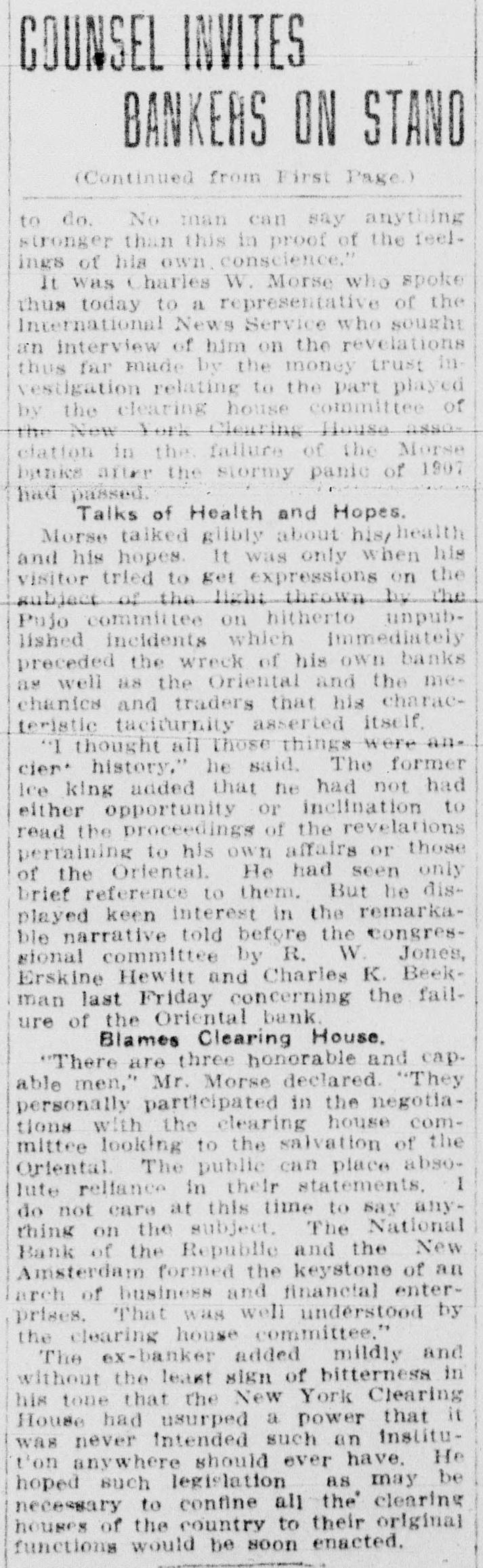 COUNSEL INVITES BANKERS ON STANO (Continued from First Page.) to do. No man can say anything stronger than this in proof of the feelings of his own. conscience." It was Charles W. Morse who spoke thus today to a representative of the International News Service who sought an interview of him on the revelations thus far made by the money trust investigation relating to the part played by the clearing house committee of the New York Clearing House assoclation in the failure of the Morse bunics after the stormy panic of 1907 had passed. Talks of Health and Hopes. Morse talked glibly about his/ health and his hopes. It was only when his visitor tried to get expressions on the subject of the light thrown by the Pujo committee on hitherto unpublished incidents which immediately preceded the wreck of his own banks as well as the Oriental and the mechanics and traders that his characteristic taciturnity asserted itself, "I thought all those things were ancier* history." he said. The former Ice king added that he had not had either opportunity or inclination to read the proceedings of the revelations pertaining to his own affairs or those of the Oriental. He had seen only brief reference to them. But he displayed keen interest in the remarkable narrative told before the congressional committee by R. W. Jones, Erskine Hewitt and Charles K. Beekman last Friday concerning the failure of the Oriental bank. Blames Clearing House, "There are three honorable and cap. able men," Mr. Morse declared. "They personally participated in the negotiations with the clearing house committee looking to the salvation of the Oriental. The public can place absolute reliance in their statements. 1 do not care at this time to say anything on the subject. The National Bank of the Republic and the New Amsterdam formed the keystone of an arch of business and financial enterprises. That was well understood by the clearing house committee." The ex-banker added mildly and without the least sign of bitterness in his tone that the New York Clearing House had usurped a power that it was never intended such an institut'on anywhere should ever have. He hoped such legislation as may be necessary to confine all the clearing houses of the country to their original functions would be soon enacted.