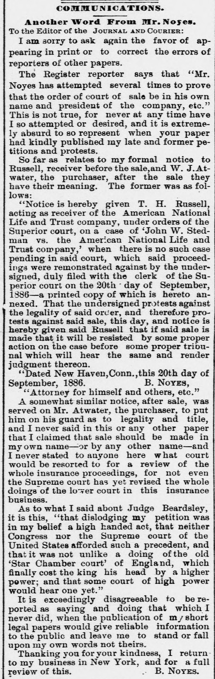 COMMUNICATIONS. Another Word From Mr. Nojes. To the Editor of the JOURNAL AND COURIER: I am sorry to ask again the favor of appearing in print or to correct the errors of reporters of other papers. The Register reporter says that "Mr. Noyes has attempted several times to prove that the order of court of sale be in his own name and president of the company, etc." This is not true, for never at any time have I so attempted or desired, and it is extremely absurd to so represent when your paper had kindly published my late and former petitions and protests. So far as relates to my formal notice to Russell, receiver before the sale, and W. J.Atwater, the purchaser, after the sale they have their meaning. The former was as follows: "Notice is hereby given T. H. Russell, acting as receiver of the American National Life and Trust company, under orders of the Superior court, on a case of 'John W. Stedman vs. the American National Life and Trust company,' when there is no such case pending in said court, which said proceedings were remonstrated against by the undersigned, duly filed with the clerk of the Superior court on the 20th day of September, 1886-a printed copy of which is hereto annexed. That the undersigned protests against the legality of said order, and therefore protests against said sale, this day, and notice is hereby given said Russell that if said sale is made that it will be resisted by some proper action on the case before some proper tribunal which will hear the same and render judgment thereon. "Dated New Haven, Conn., this 20th day of B. NOYES, September, 1886. "Attorney for himself and others, etc." A somewhat similar notice, after sale, was served on Mr. Atwater, the purchaser, to put him on his guard as to legality and title, and I never said in this or any other paper that I claimed that sale should be made in my own name-or by any other name-and I never stated to anyone here what court would be resorted to for a review of the whole insurance proceedings, for not even the Supreme court has yet revised the whole doings of the lower court in this insurance business. As to what I said about Judge Beardsley, it is this, "that dislodging my petition was in my belief a high handed act, that neither Congress nor the Supreme court of the United States afforded such a precedent, and that it was not unlike a doing of the old 'Star Chamber court' of England, which finally cost the king his head by a higher power; and that some court of high power would hear one yet." It is exceedingly disagreeable to be reported as saying and doing that which I never did, when the publication of m/ short legal papers would give reliable information to the public and leave me to stand or fall upon my own words not theirs. Thanking you for your kindness, I return to my business in New York, and for a full B. NOYES. review of this.