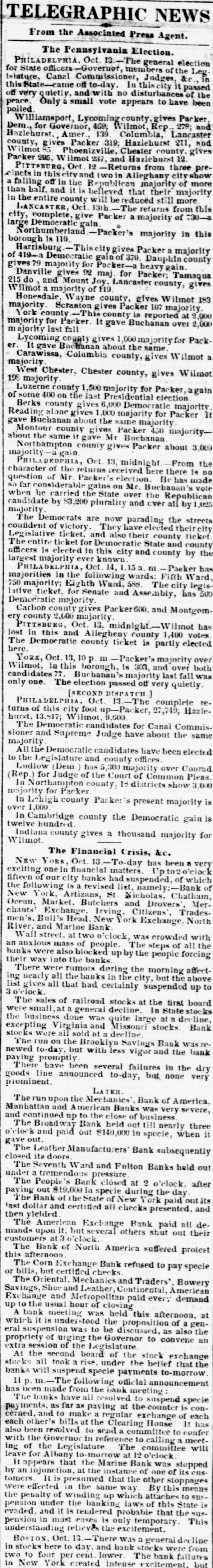 From the Associated Press Agent. The Pennsylvania Election. PHILADELPHIA, Oct. 13.-The general elect for State officers -Governor, members of the L islature, Canal Commissioner, Judges, &c his State-came off to-day. In this city it pas off very quietly, and with no disturbances of peace. Only a small vote appears to have b polled Williamsport, Lycoming county, gives Pack Dem., for Governor, 469; Wilmot, Rep., 278; Hazlehurst, Amer., 139 Columbia, Lancas county, gives Packer 319; Hazlehurst 211, Wilmot 85. Phoenizville, Chester county. gi Packer 295, W ilmot 237, and Hazlehurst 12. PITTSBURG, Oct. 12 -Returns from three I cinets in and two in Alleghany city sh a falling off in the Republican majority of m than half, and it is believed that their major in the entire county will bereduced still more LANCASTER, Oct. 13th.-The returns from city, complete, give Packer a majority of 730 large Democratic gain Northumberland-Packer's majority in t borough is 110. Harrisburg -Thiscitygives Packer a major of 419-a Democratic gain of 370. Dauphin cou gives 79 majority for Packer-a heavygain Danville gives 92 maj. for Packer; Tama 215 do and Mount Joy, Lancaster county, gi Wilmot a majority of 119. Honesdale, Wayne county, gives Wilmot majority. Scranton gives Packer 107 majority York county-This county is reported at 2 majority for Packer. It gave Buchanan over 2 majority last fall Lycoming county gives ,000 majority for Pa er. It gave Buchanan about the same. Carawissa, Columbia county, gives Wilm majority. West Chester, Chester county, gives Will 198 majority Luzerne county 1,500 majority for Packer, ag of some 400 on the last Presidential election Berks county gives 6,000 Democratic major Reading alone gives 1,000 majority for Packer gave Buchanan about the same majority Montour county gives Packer 450 majorit about the same it gave Mr Buchanan Northampton county gives Packer about 3 majority-a gain. PHILADEDPHIA, Oct. 13, midnight. From character of the returns received here there is question of Mr Packer's election. Be has m SO far considerable gains on Mr. Buchanan's when he carried the State over the Republi candidate by 83,200 plurality and over all by I majority The Democrats are now parading the str contident of victory. They have elected their Legislative ticket. and also their county tic The entire ticket for Democratic State and cou officers is elected in this city and county by largest majority ever known PHILADELPHIA, Oct. 14, 1.15 m-Paeker majorities in the following wards: Fifth WE 750 majority; Eighth Ward, 588. The city le lative ticket. for Senate and Assembly, has Democratic majority. Carbon county gives Packer600, and Montg ery county 2,000 majority. PITTSBURG, Oct. 13, midnight.-Wilmot lost in this and Allegheny county 1,400 vo The Democratic county ticket is partly elec here. YORK, Oct. 13, 10 m -Packer's majority o Wilmot, in this borough, is 303, and over I candidates 77. Buchanan's majority last fall only one. The election passed off very quietly [SECOND DISPATCH.] PHILADELPHIA, Oct. 13-The complete turns of this city foot -Packer, 27,749; Hat hurst. 13,817; Wilmot, 9,609. The Democratic candidates for Canal Comi sioner and Supreme Judge have about the si majority All the Democratic candidates have been elec to the Legislature and county offices. Ludlow (Dem ) has 5,300 majority over Con (Rep.) for Judge of the Court of Common Pl In Northampton county, 18 districts show 3 majority for Packer In Lehigh county Packer's present majorit over 1,000 In Cambridge county the Democratic gai twelve hundred Indiana county gives a thousand majority Wilmot. The Financial Crisis, &c. NEW YORK, Oct. 13-To-day has been a \ exciting one in financial matters. Up to2 fifteen of our city banks had suspended, of wh the following is a revised list, namely:-Banl New York, Artizans, St. Nicholas. Chath Ocean, Market. Butchers and Drovers', M chants' Exchange, Irving, Citizens', Trad men's. Buil's Head. New York Exchange No River, and Marine Bank. Wall street, at two o'clock, was crowded w an anxious mass of people. The steps of all banks were also blocked upby the people fore their way into the banks There were rumors during the morning aff ing nearly all the banks in the city, but the ab list gives all that had certainly suspended up 3 o'clock. The sales of railroad stocks at the first bo were small, at a general decline. In State sto the business done was quite large at a decl excepting Virginia and Missouri stocks. B stocks were all sold at a decline The run on the Brooklyn Savings Bank was newed to-day, but with less vigor and the be paying promptly There have been several failures in the goods line announced to-day, but none V prominent. LATER. The run upon the Mechanics', Bank of Ameri Manhattan and American Banks was very seve and continued up to the close of business The Broadway Bank held out till nearly th o'clock and paid out $140,000 in specie, when gave out. The Leather Manufacturers' Bank subsequer closed its doors The Seventh Ward and Fulton Banks held under a tremendous pressure The People's Bank closed at 2 o'clock. al paying out $19,000 in specie during the day The Bank of the State of New York paid out last dollar and certified all checks presented, then yielded. The American Exchange Bank paid all mands upon it. but several others shut out tb customers at o'clock The Bank of North America suffered prot this afternoon The Corn Exchange Bank refused to pay spe or bills, but certified checks. The Oriental. Mechanics and Traders', Bow Savings, Shoe and Leather, Continental, America Exchange and Metropolitan paid every dema up to the usual hour of closing A bank meeting was held this afternoon, which it is understood the proposition of age
