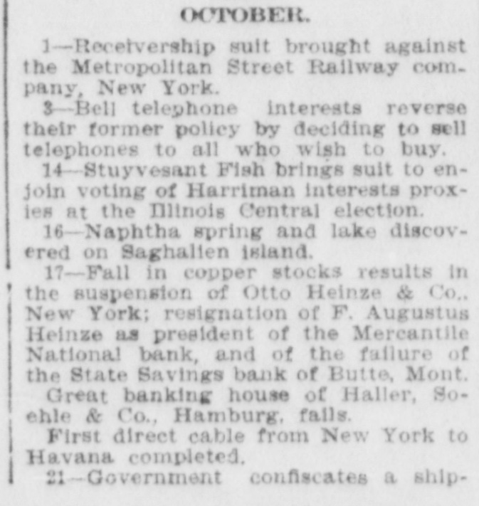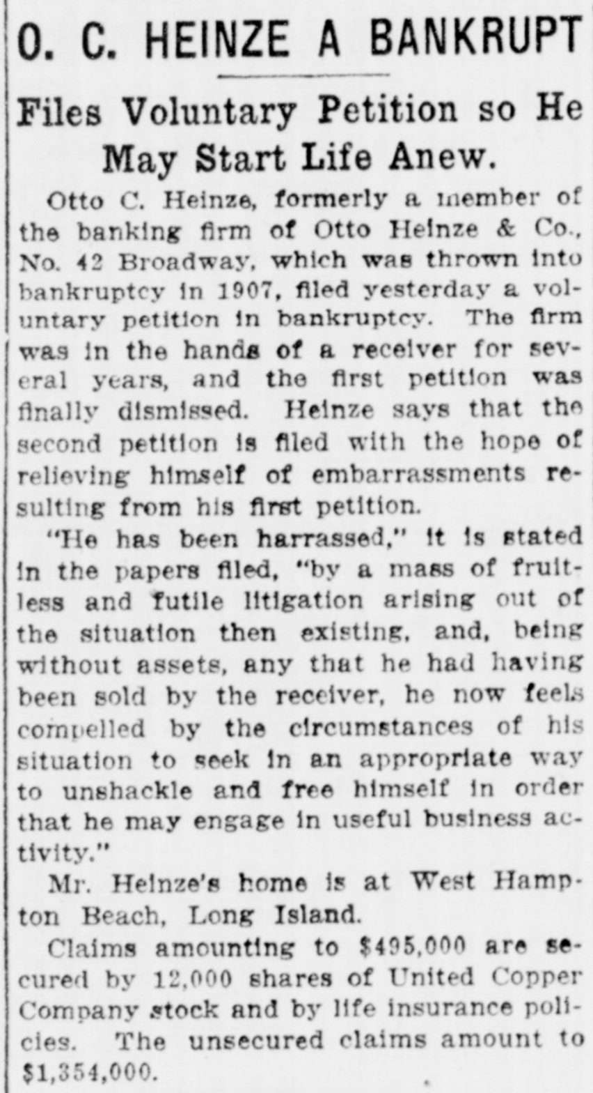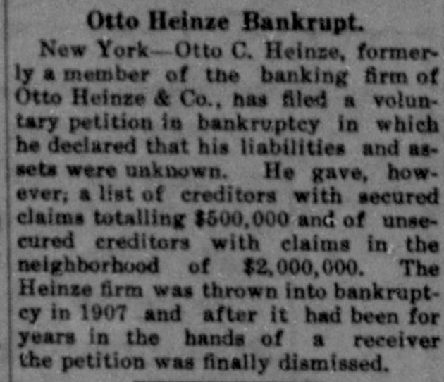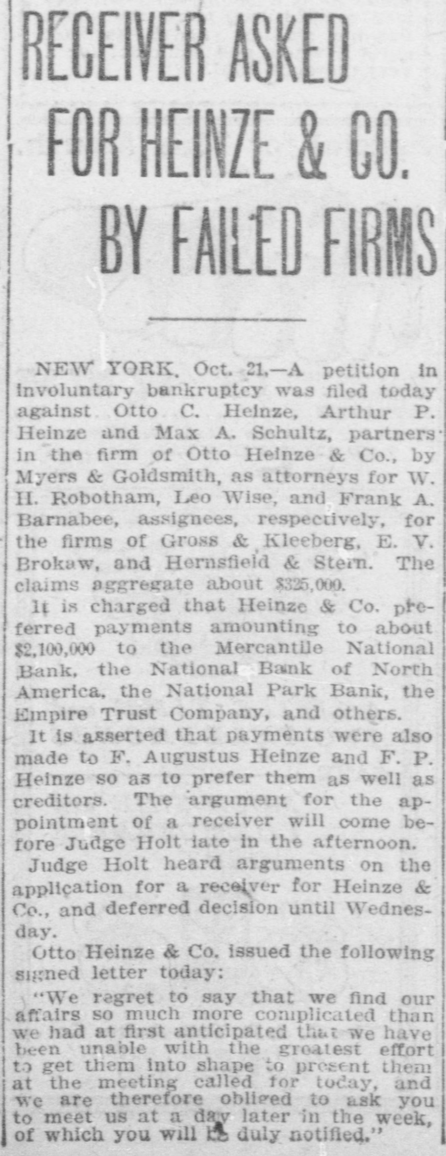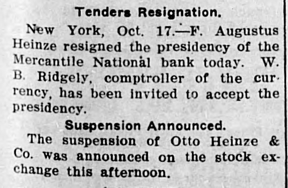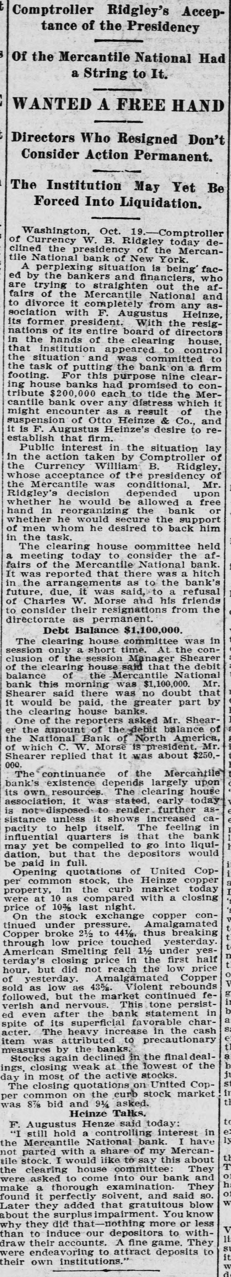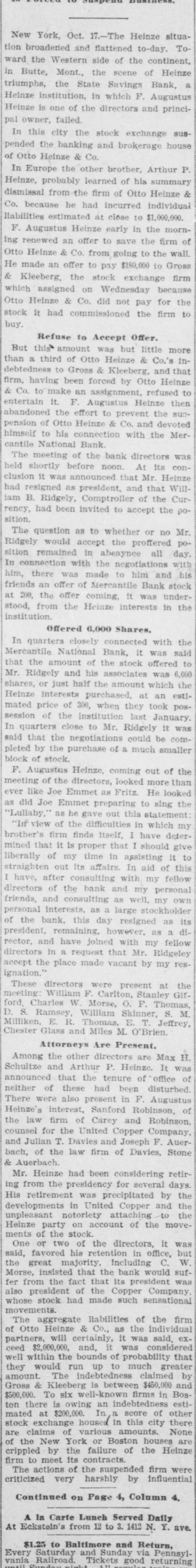 EXP suspent New York, Oct. 17.-The Heinze situation broaderied and flattened to-day. Toward the Western side of the continent, in Butte, Mont., the scene of Heinze triumphs, the State Savings Bank, a Heinze institution, in which F. Augustus Heinze is one of the directors and principal owner, failed. In this city the stock exchange suspended the banking and brokerage house of Otto Heinze & Co. In Europe the other brother, Arthur P. Heinze, probably learned of his summary dismissal from the firm of Otto Heinze & Co. because he had incurred individual liabilities estimated at close to $1,000,000. F. Augustus Heinze early in the morning renewed an offer to save the firm of Otto Heinze & Co. from going to the wall. He made an offer to pay $180,000 to Gross & Kleeberg, the stock exchange firm which assigned on Wednesday because Otto Heinze & Co. did not pay for the stock It had commissioned the firm to buy. Refuse to Accept Offer. But this amount was but little more than a third of Otto Heinze & Co.'s indebtedness to Gross & Kleeberg, and that firm, having been forced by Otto Heinze & Co. to make an assignment, refused to entertain it. F. Augustus Heinze then abandoned the effort to prevent the suspension of Otto Heinze & Co. and devoted himself to his connection with the Mercantile National Bank. The meeting of the bank directors was held shortly before noon. At its conclusion it was announced that Mr. Heinze had resigned as president, and that William B. Ridgely, Comptroller of the Currency, had been invited to accept the position. The question as to whether or no Mr. Ridgely would accept the proffered position remained in abeaynee all day. In connection with the negotiations with him, there was made to him and his friends an offer of Mercantile Bank stock at 200, the offer coming it was understood, from the Heinze interests in the institution. Offered 6.000 Shares. In quarters closely connected with the Mercantile National Bank, it was said that the amount of the stock offered to Mr. Ridgely and his associates was 6,000 shares, or just half the amount which the Heinze interests purchased, at an estimated price of 300, when they took possession of the institution last January In quarters close to Mr. Ridgely it was said that the negotiations could be completed by the purchase of a much smaller block of stock. F. Augustus Heinze, coming out of the meeting of the directors, looked more than ever like Joe Emmet as Fritz. He looked as did Joe Emmet preparing to sing the "Lullaby," as he gave out this statement "If view of the difficulties in which my brother's firm finds itself, I have determined that it is proper that I should give liberally of my time in assisting it to straighten out its affairs. In aid of this I have, after consulting with my fellow directors of the bank and my personal friends, and consulting as well, my own personal interests, as a large stockholder of the bank. this day resigned as its president, remaining, however, as a director, and have joined with my fellow directors in a request that Mr. Ridgeley accept the place made vacant by my ressignation." These directors were present at the meeting: William F. Carlton, Stanley Gif. ford. Charles W. Morse, O. F. Thomas D. S. Ramsey, William Skinner, S. M. E. T. Milliken, E. R. Thomas, Jeffrey, Chester Glass and Miles M. O'Brien. Attorneys Are Present, Among the other directors are Max H. Schultze and Arthur P. Heinze. It was announced that the tenure of office of neither of these had been disturbed. There were also present in F. Augustus Heinze's interest, Sanford Robinson, of the law firm of Carey and Robinson. counsel for the United Copper Company, and Julian T. Davies and Joseph F. Auerbach, of the law firm of Davies, Stone & Auerbach. Mr. Heinze had been considering retiring from the presidency for several days His retirement was precipitated by the developments in United Copper and the unpleasant notorlety attaching to the Heinze party on account of the movements of the stock. One or two of the directors, it was said, favored his retention in office, but the great majority, including C. W Morse, insisted that the bank would suffer from the fact that its president was also president of the Copper Company whose stock had made such sensational movements. The aggregate liabilities of the firm of Otto Heinze & Co., as the individual partners, will certainly, it was said. exceed $2,000,000, and, it was considered well within the bounds of probability that they would run up to much greater amount. The indebtedness claimed by Gross & Kleeberg is between $450,000 and $500,000. To six well-known firms in Boston there is owing an indebtedness estimated at $200,000. In,a score of other stock exchange houses in this city there are claims of various amounts. None of the New York or Boston houses are crippled by the failure of the Heinze firm to meet its contracts. The actions of the suspended firm were criticized very harshly by influential Continued on Page 4, Column 4. A la Carte Lunch Served Daily At Eckstein's from 12 to 3. 1412 N. Y. ave. $1.25 to Baltimore and Return, Every Saturday and Sunday via Pennsylvania Railroad. Tickets good returning