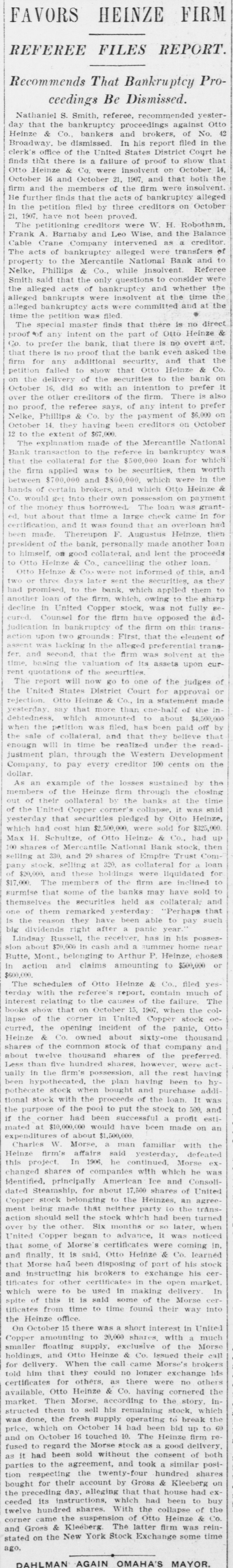 FAVORS HEINZE FIRM REFEREE FILES REPORT. Recommends That Bankruptcy Proceedings Be Dismissed. Nathaniel S. Smith, referee, recommended yesterday that the bankruptcy proceedings against Otto Heinze & Co., bankers and brokers, of No. 42 Broadway. be dismissed In his report filed in the clerk's office of the United States District Court he finds that there is a failure of proof to show that Otto Heinze & Co were insolvent on October 14, October 16 and October 21, 1907 and that both the firm and the members of the firm were insolvent. He further finds that the acts of bankruptcy alleged in the petition filed by three creditors on October 21, 1907. have not been proved. The petitioning creditors were W. H Robotham, Frank A. Barnaby and Leo Wise, and the Balance Cable Crane Company intervened as a creditor The acts of bankruptcy alleged were transfers of property to the Mercantile National Bank and to Nelke, Phillips & Co., while insolvent Referee Smith said that the only questions to consider were the alleged acts of bankruptcy and whether the alleged bankrupts were insolvent at the time the alleged bankruptcy acts were committed and at the time the petition was filed The special master finds that there is no direct proof of any intent on the part of Otto Heinze & Co. to prefer the bank. that there is no overt act, that there is no proof that the bank even asked the firm for any additional security, and that the petition failed to show that Otto Heinze & Co. on the delivery of the securities to the bank on October 16. did so with an intention to prefer it over the other creditors of the firm. There is also no proof, the referee says, of any intent to prefer Nelke, Phillips & Co. by the payment of $6,000 on October 14. they having been creditors on October 12 to the extent of $67,000 The explanation made of the Mercantile National Bank transaction to the referee in bankruptcy that the collateral for the $500.00 loan for which the firm applied was to be securities, then worth between $700,000 and $800,000. which were in the hands of certain brokers, and which Otto Heinze & Co would get into their own possession on payment of the money thus borrowed. The loan was granted, but about that time a large check came in for certification and it was found that an overloan had been made Thereupon F. Augustus Heinze, then president of the bank. personally made another loan to himself on good collateral, and lent the proceeds to Otto Heinze & Co., cancelling the other loan. Otto Heinze & not informed of this, and two or three days later sent the securities as they had promised, to the bank, which applied them to another loan of the firm. which owing to the sharp decline in United Copper stock. was not fully se cured. Counsel for the firm have opposed the ad judication in bankruptcy of the firm on this transaction upon two grounds First. that the element of assent was lacking in the alleged preferential transfer. and second, that the firm was solvent at the time basing the valuation of its assets upon current quotations of the securities The report will now go to one of the judges of the United States District Court for approval or rejection. Otto Heinze & Co., in statement made yesterday. say that more than one-half of the in debtedness, which amounted to about $4,500,000 when the petition was filed, has been paid off by the sale of collateral and that they believe that enougn will in time be realized under the readjustment plan, through the Western Development Company, to pay every creditor 100 cents on the dollar As an example of the losses sustained by the members of the Heinze firm through the closing out of their collateral by the banks at the time of the United Copper corner's collapse. it was said yesterday that securities pledged by Otto Heinze, which had cost him $2,500,000 were sold for $325,000 Max H. Schultze, of Otto Heinze & Co., had up 100 shares of Mercantile National Bank stock then selling at 330, and 20 shares of Empire Trust Comstock selling at 320. as collateral for a loan of $20,000. and these holdings were liquidated for $17,000. The members of the firm are inclined to surmise that some of the banks may have sold to themselves the securities held as collateral and one of them remarked yesterday Perhaps that is the reason they have been able to pay such big dividends right after a panic year Lindsay Russell the receiver. has in his possession about $70,000 in cash and a summer home near Butte, Mont. belonging to Arthur P Heinze, choses in action and claims amounting to $500,000 or $600,000. The schedules of Otto Heinze & Co., filed yesterday with the referee report. contain much of interest relating to the causes of the failure The books show that on October 15. 1907. when the collapse of the corner in United Copper stock occurred, the opening incident of the panic, Otto Heinze & Co. owned about sixty-one thousand shares of the common stock of that company and about twelve thousand shares of the preferred Less than five hundred shares. actually in the firm's ession, all the rest having been hypothecated, the plan having been to hy pothecate stock when bought and purchase additional stock with the proceeds of the loan. It was the purpose of the pool to put the stock to 500. and if the corner had been successful a profit estimated at $10,000,000 would have been made on an expenditures of about $1,500,000 Charles W Morse, a man familiar with the Heinze firm's affairs said yesterday, defeated this project. In 1906 he continued. Morse exchanged shares of companies with which he was identified, principally American Ice and Consolidated Steamship, for about 17,500 shares of United Copper stock belonging to the Heinzes, an agree ment being made that neither party to the transaction should sell the stock which had been turned over by the other. Six months or so later, when United Copper began to advance, it was noticed that some of Morse's certificates were coming in, and finally it is said. O