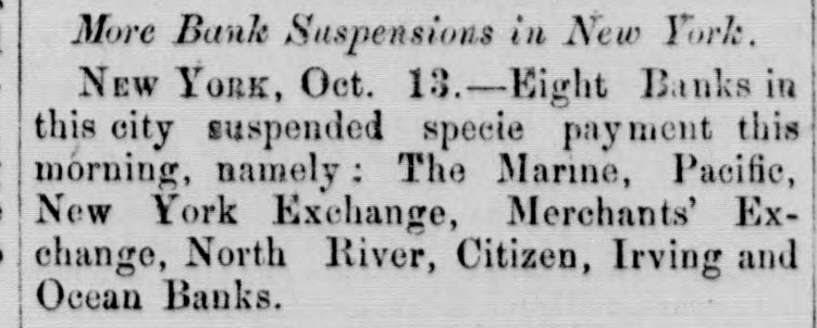The following banks of this city suspended this morning: The Marine, Pacific, Irving, Merchants' Exchange, North River, New York Exchange, Citizens, and Ocean Bankeight in all.