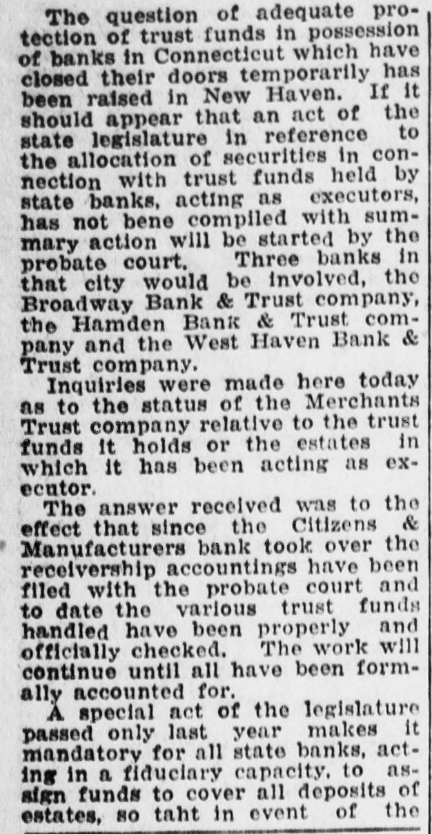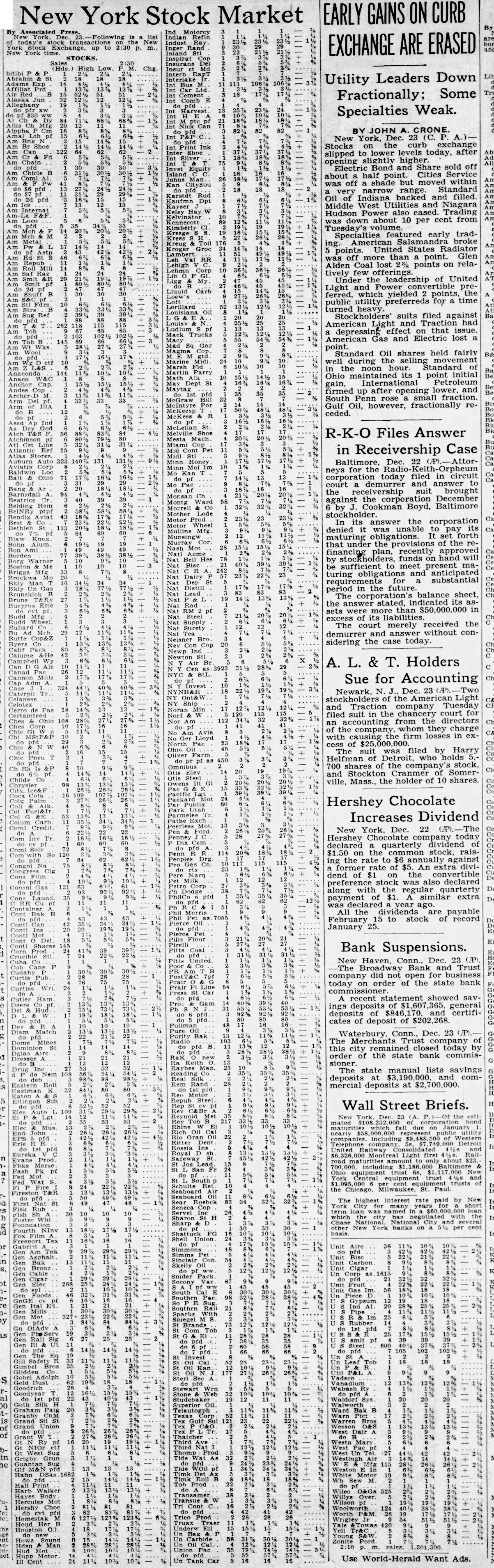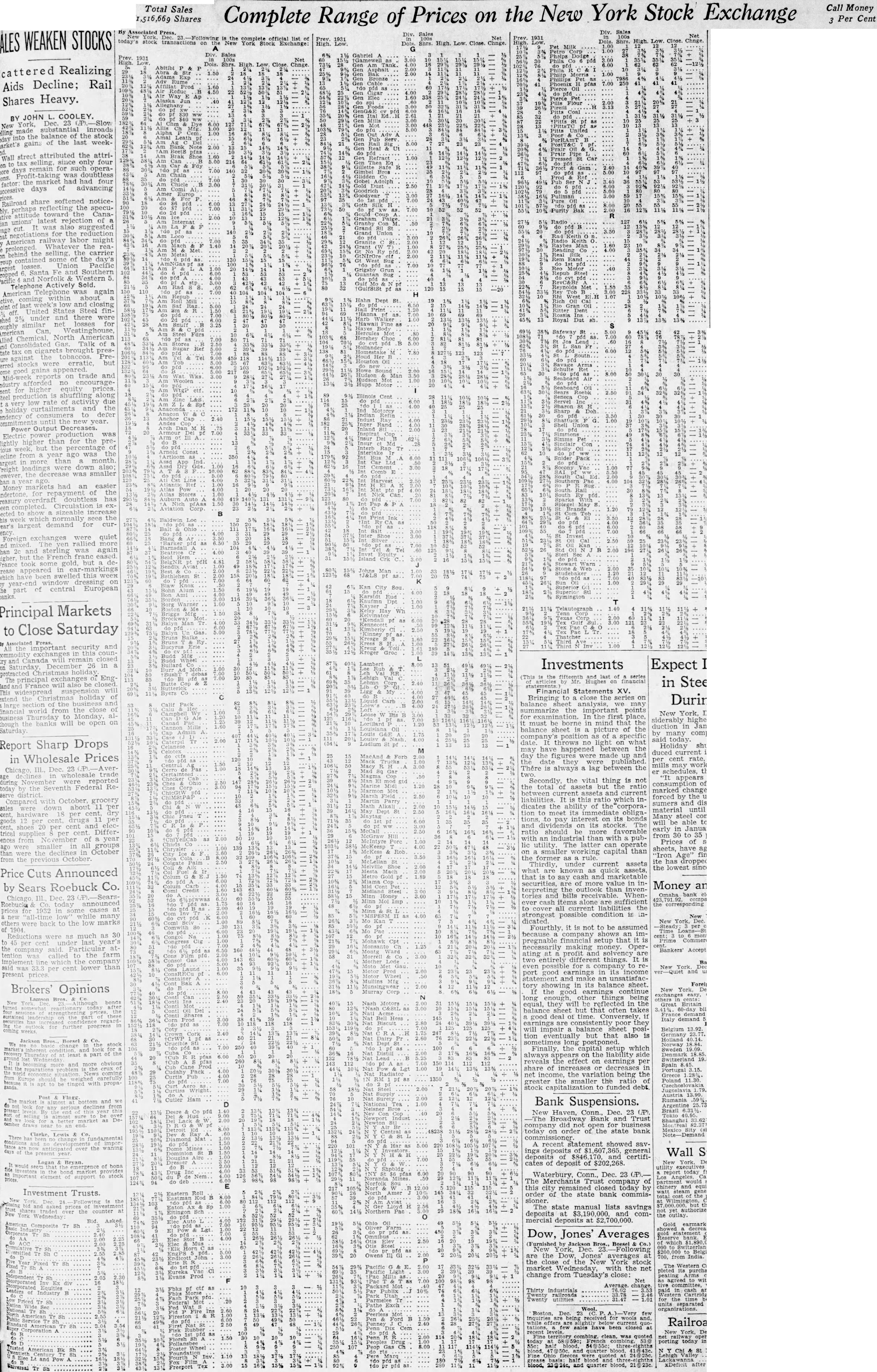 Associated complete today's stock New Close. Gabriel High Chnge Principal Markets to Close Saturday Associated Press. the important security and exchanges in this closed counand Canada try on Saturday, December 26 in Investments ristmas holiday protracted The principal exchanges of Eng- (This the fifteenth series Hughes on land and France will also be closed This widespread suspension will Financial Statements XV. extend the Christmas holiday of Bringing to close the series on section of the and balance analysis, we may financial world from the close of the important points business Thursday to Monday, for In the first place, though the banks will be open on must be borne in mind that the Saturday. balance sheet is picture of the company's position as of specific said date. It throws no light on what Report Sharp Drops may have happened between the the figures were made up and in Wholesale Prices they published. There is always a lag between the Chicago, III. Dec. 23 Aver- trade in Secondly, the vital thing is not during Novem were today the Seventh Federal Re- the total of assets but the ratio between current assets and current serve district liabilities. It is this ratio which inCompared with October, grocery sales were down about 11 dicates the ability of the corporation to meet its obligacent, hardware 18 per cent, drugs 11 tions, to pay interest on its bonds goods 12 per and dividends on its stocks. The cent, shoes 20 per cent and trical per Differ- ratio should be more favorable with an industrial than with pubences from of a year lic utility. The latter can operate ago were smaller in all groups than were the declines in October on smaller working capital than the former as rule. from the previous October under current assets what are known as quick assets, Price Cuts Announced that is to say cash and marketable securities, are of more value in inby Sears Roebuck Co. terpreting the outlook than inventories and bills receivable. WhenChicago, III. Dec. 23 Searsever cash items alone are sufficient Roebucks & today announced to cover all current liabilities the prices for 1932 in some cases at while many strongest possible condition is in- New "all-time dicated New others were back to the low marks per Fourthly it is not to be assumed of 1904 Time because company shows an imReductions were as much as 30 pregnable financial setup that it is 45 last year's necessarily making money. Operthe ating at a profit and solvency are tention called to the farm two entirely different things. It is which the company Bar even possible for a company to re- New York said was 33.3 per cent lower than port good earnings in its income and present and make an unsatisfactory showing in its balance sheet. If the earnings continue long other things being others Nash equal, they will be reflected in the Great Britain balance sheet but that often takes bills a good deal of time. Conversely, if earnings are consistently poor they will impair balance sheet posi- Belgium tion eventually but that also is Germany Holland sometimes long postponed. Norway Finally, the capital setup which Sweden always appears on the liability side Denmark 19.51. reveals the effect on earnings per share of increases or decreases in net income, the variation being the Greece Poland 11.30. greater the smaller the ratio stock capitalization to funded debt. Jugoslavia Rumania Bank Suspensions. Argentine New Haven, Conn., Dec. 23 (AP). The Broadway Bank and Trust company did not open for business today on order of the state bank A recent statement showed savings deposits of $1,607,365, general deposits of $846, and certificates of deposit of $202,268. New report today Waterbury, Conn. Dec. 23 (P) The Merchants Trust company of and this city remained closed today by steam Investment Trusts. order of the state bank commissioner. at the prices The state manual lists savings the counter deposits at $3,190,000. and comWednesday mercial deposits at $2,700,000. Gold earmarked Tr Sh Dow, Jones' Averages (Furnished Jackson Bros., Boesel & Co.) York, Dec. are the Dow, Jones' averages from India. the of the New York stock The Western market with the net its change from Tuesday's close peating Net with Average. tive industrials cash and Industry utilities the units Wool. Boston been at New York Dec. was quoted porting today quarter and quarter blood, after