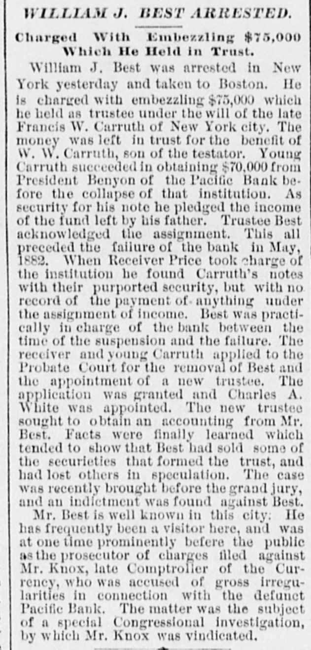 WILLIAM J. BEST ARRESTED. Charged With Embezzling $75,000 Which He Held in Trust. William J. Best was arrested in New York yesterday and taken to Boston. He is charged with embezzling $75,000 which he held as trustee under the will of the late Francis W. Carruth of New York city. The money was left in trust for the benefit of W. W. Carruth, son of the testator. Young Carruth succeeded in obtaining $70,000 from President Benyon of the Pacific Bank before the collapse of that institution. As security for his note he pledged the income of the fund left by his father. Trustee Best acknowledged the assignment. This all preceded the failure of the bank in May, 1882. When Receiver Price took charge of the institution he found Carruth's notes with their purported security, but with no record of the payment of. anything under the assignment of income. Best was practically in charge of the bank between the time of the suspension and the failure. The receiver and young Carruth applied to the Probate Court for the removal of Best and the appointment of a new trustee. The application was granted and Charles A. White was appointed. The new trustee sought to obtain an accounting from Mr. Best. Facts were finally learned which tended to show that Best had sold some of the securieties that formed the trust, and had lost others in speculation. The case was recently brought before the grand jury, and an indictment was found against Best. Mr. Best is well known in this city: He has frequently been a visitor here, and was at one time prominently befere the public as the prosecutor of charges filed against Mr. Knox, late Comptroller of the Currency, who was accused of gross irregularities in connection with the defunct Pacific Bank. The matter was the subject of a special Congressional investigation, by which Mr. Knox was vindicated.