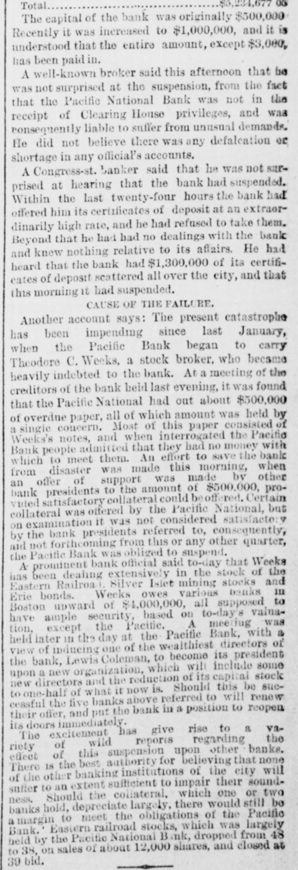 Total The capital of the bank was originally $500,000 Recently it was increased to $1,000,000, and it is understood that the entire amount, except $3,000, has been paid in. A well-known broker said this afternoon that be was not surprised at the suspension, from the fact that the Pacific National Bank was not in the receipt of Clearing House privileges, and was consequently liable to suffer from unusual demands. He did not believe there was any defalcation or shortage in any official's accounts. A Congress-st. banker said that he was not SILEprised at hearing that the bank had suspended. Within the last twenty-four hours the bank had offered him its certificates of deposit at an extraordinarily high rate, and he had refused to take them. Beyond that he had had no dealings with the bank and knew nothing relative to its affairs. He had heard that the bank had $1,300,000 of its certificates of deposit scattered all over the city, and that this morning it had suspended. CAUSE OF THE FAILURE. Another account says: The present catastrophe has been impending since last January, when the Pacific Bank began to carry Theodore C. Weeks, a stock broker, who became heavily indebted to the bank. At a meeting of the creditors of the bank held last evening, it was found that the Pacific National had out about $500,000 of overdue paper, all of which amount was held by a single concern. Most of this paper consisted of Weeks's notes, and when interrogated the Pacific Bank people admitted that they had no money with which to meet them. An effort to save the bank from disaster was made this morning, when an offer of support was made by other bank presidents to the amount of $500,000, provided satisfactory collateral could be offered. Certain collateral was offered by the Pacific National, but on examination it was not considered satisfactor by the bank presidents referred to, consequently, aid not forthcoming from this or any other quarter, the Pacific Bank was obliged to suspend. A prominent bank official said to-day that Weeks has been dealing extensively in the stock of the Eastern Railroal. Silver Islet mining stocks and Erie bonds. Weeks owes various banks in Boston upward of $4,000,000, all supposed to have ample security, based on to-day's valuawas tion, except the Pacific. A meeting held later 111 the day at the Pacific Bank, with a view of inducing one of the wealthiest directors of the bank, Lewis Coleman, to become its president upon a new organization, which will include some new directors and the reduction of its capital stock to one-half of what it now is. Should this be successful the five banks above referred to will renew their offer, and put the bank in a position to reopen its doors immediately. The excitement has give rise to a vaof wild reports regarding the effect riety of this suspension upon other banks. There IS the best authority for believing that none of the other banking institutions of the city will suffer to an extent sufficient to impair their soundShould the collateral, which one or two ness. depreciate largely, there would still be to meet the obligations a banks margin hold, of the Pacific Bank. Eastern railroad stocks, which was largely held by the Pacific National Bank, dropped from 48 to 38, on sales of about 12,000 shares, and closed at 39 bid.