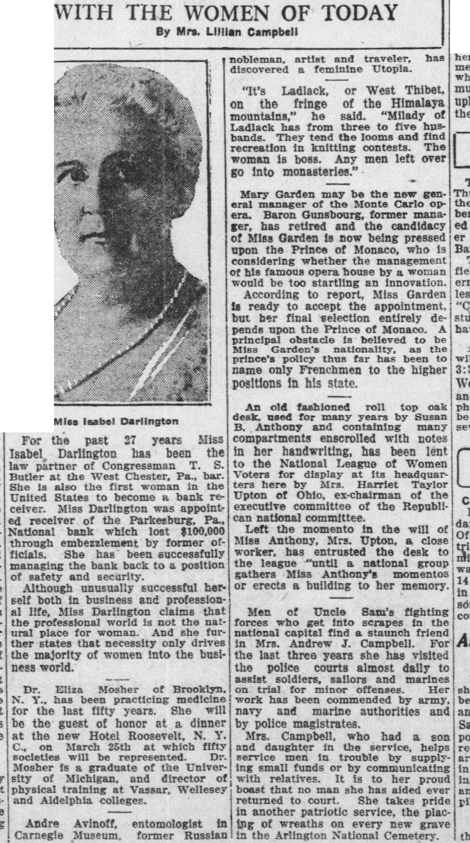 It is a shock for several reasons. In the first place, when the Parkesburg, Pa., National Bank lost $100,000 and was closed on October 4 because of alleged embezzlement and misappropriation of funds by several former officials and a New York promoter, every inhabitant of that ore-smelting locality expected Joseph W. McIntosh, Comptroller of Currency at Washington, to put a "hardfisted fnancier to the task of collecting and distributing the calem of the bank. for me to do something. and so I went to the University of Pennsylvania Law School and was graduated in 1897eleven years after finishing college." That was frank for a woman. And it was so different from hearing the old story about feeling the throb of business and just knowing that women could be as successful as men. Of course Miss Darlington is not so different from other women that she thinks women have no place in the world of money-making. In fact, she takes a natural pride in pointing out that practically all professions, especially advertising, merchandising and journalism, have women of far-spread fame, women who have proved themselves quite as capable as men. "It is hard to find a business office nowadays," she said, "that has not at least one woman in a responsible position. Women can usually be implicitly trusted; you seldom hear of one dishonest in business. And they are logical thinkers, if properly trained." "Properly trained"-that suggested a theme to her. Instead of claiming that the so-called woman's intuition works out in business life she said that women, like men, need to be trained. "More women than ever before are going to college today," she said. "The future will find many more wearing cap and gown. More women than ever before are using their college training in the business and professional world. The future will find many more behind desks, at the bar, in medicine, in politics, banking, and so on." Three factors, in Mins Darlington's opinion, influence a woman's success outside of the home. They are the same that determine a rign's success-heredity, environment, education. Because she was in a hurry to get at some accounts, she again used herself as an example. "I took this receiver's job, despite the fact that financial matters are usually confusing to women, because these three factors enabled me to do it," she said rapidly. "As my father was always engaged in finance an understanding of it was almost born in me. The environment was conducive to this work, because I heard it discussed for years. Study at college and years of practicing business law-I don't handle much criminalgave me the training." And those are the three factors, she believes, that will eventually give women a prominent place in business life, if they claim it. But even these will not necessarily enable women to overshadow men. The discussion was not over here, even though Miss Darlington was anxious to get at her job. For she hastened to put in a "but." "But," she emphasized, "women cannot expect to be successful home-makers and home-keepers and successful business women at the same time." Her view is that either of these tasks is more than enough to take all of any woman's time. As any mother knows, children and a husband make every day full. And as any business woman will vouch. business keeps one occupied all day and even after closing time.