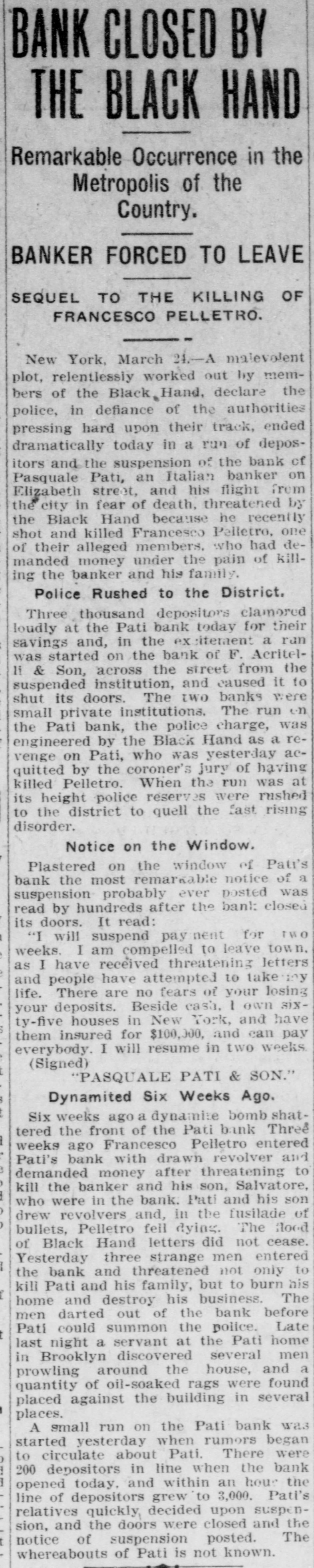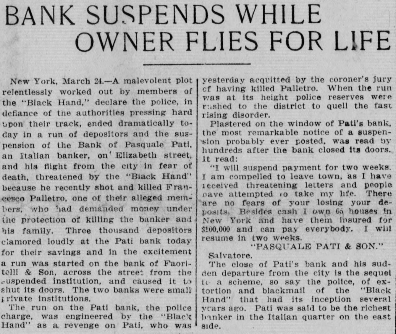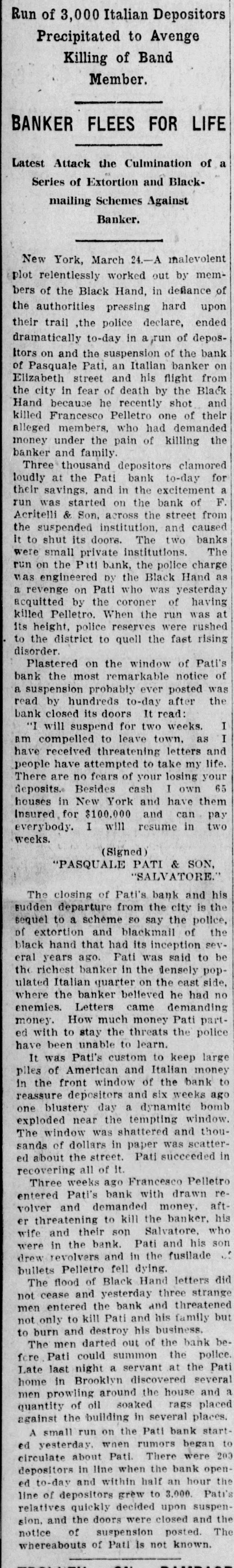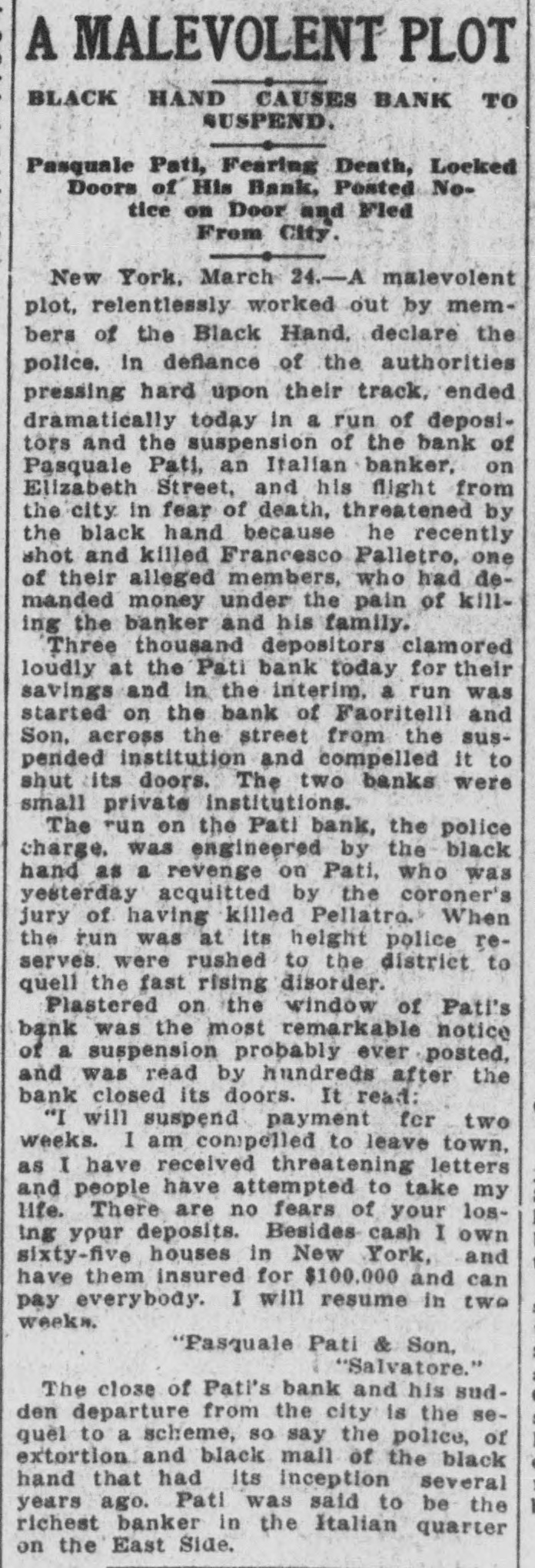 A MALEVOLENT PLOT BLACK HAND CAUSES BANK TO SUSPEND. Pasquale Pati, Fearing Death, Locked Doors of His Bank, Posted Notice on Door and Fled From City. New York, March 24.-A malevolent plot, relentlessly worked out by members of the Black Hand, declare the police. in deflance of the authorities pressing hard upon their track, ended dramatically today in a run of depositors and the suspension of the bank of Pasquale Pati, an Italian banker, on Elizabeth Street, and his flight from the city in fear of death, threatened by the black hand because he recently shot and killed Francesco Palletro, one of their alleged members, who had demanded money under the pain of killing the banker and his family. Three thousand depositors clamored loudly at the Pati bank today for their savings and in the interim. a run was started on the bank of Faoritelli and Son, across the street from the suspended institution and compelled it to shut its doors. The two banks were small private institutions. The run on the Pati bank, the police charge. was engineered by the black hand as a revenge on Pati, who was yesterday acquitted by the coroner's jury of having killed Pellatro. When the run was at its height police reserves. were rushed to the district to quell the fast rising disorder. Plastered on the window of Pati's bank was the most remarkable notice of a suspension probably ever posted, and was read by hundreds after the bank closed its doors. It read: "I will suspend payment for two weeks. I am compelled to leave town, as I have received threatening letters and people have attempted to take my life. There are no fears of your losing your deposits. Besides cash I own sixty-five houses in New York, and have them insured for $100.000 and can pay everybody. I will resume in two weeks. "Pasquale Pati & Son, "Salvatore." The close of Pati's bank and his sudden departure from the city is the sequel to a scheme, so say the police, of extortion and black mail of the black hand that had its inception several years ago. Pati was said to be the richest banker in the Italian quarter on the East Side.