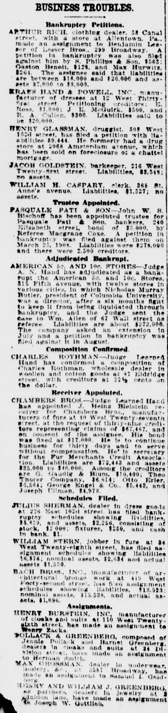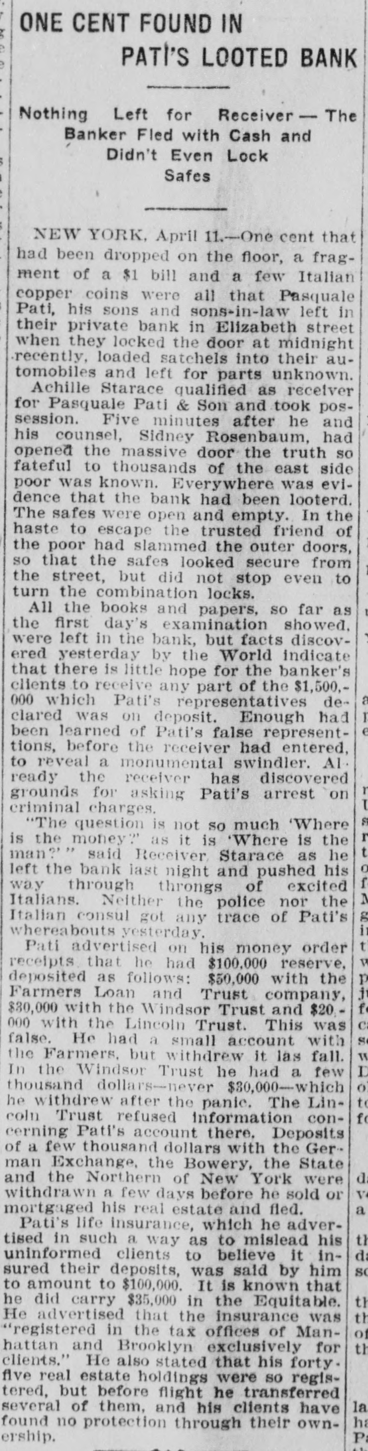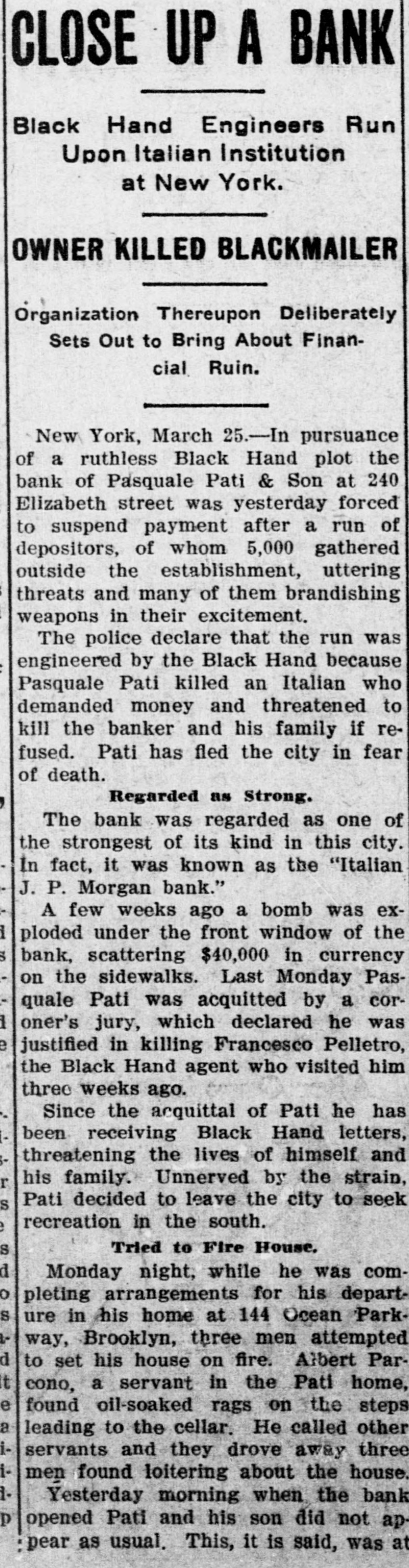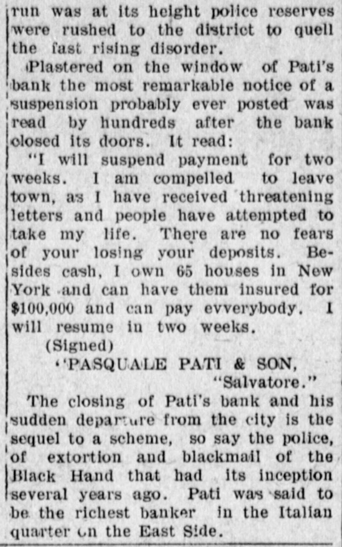 A MALEVOLENT PLOT BLACK HAND CAUSES BANK TO SUSPEND. Pasquale Pati, Fearing Death, Locked Doors of His Bank, Posted Notice on Door and Fled From City. New York, March 24.-A malevolent plot, relentlessly worked out by members of the Black Hand, declare the police. in deflance of the authorities pressing hard upon their track, ended dramatically today in a run of depositors and the suspension of the bank of Pasquale Pati, an Italian banker, on Elizabeth Street, and his flight from the city in fear of death, threatened by the black hand because he recently shot and killed Francesco Palletro, one of their alleged members, who had demanded money under the pain of killing the banker and his family. Three thousand depositors clamored loudly at the Pati bank today for their savings and in the interim. a run was started on the bank of Faoritelli and Son, across the street from the suspended institution and compelled it to shut its doors. The two banks were small private institutions. The run on the Pati bank, the police charge. was engineered by the black hand as a revenge on Pati, who was yesterday acquitted by the coroner's jury of having killed Pellatro. When the run was at its height police reserves. were rushed to the district to quell the fast rising disorder. Plastered on the window of Pati's bank was the most remarkable notice of a suspension probably ever posted, and was read by hundreds after the bank closed its doors. It read: "I will suspend payment for two weeks. I am compelled to leave town, as I have received threatening letters and people have attempted to take my life. There are no fears of your losing your deposits. Besides cash I own sixty-five houses in New York, and have them insured for $100.000 and can pay everybody. I will resume in two weeks. "Pasquale Pati & Son, "Salvatore." The close of Pati's bank and his sudden departure from the city is the sequel to a scheme, so say the police, of extortion and black mail of the black hand that had its inception several years ago. Pati was said to be the richest banker in the Italian quarter on the East Side.