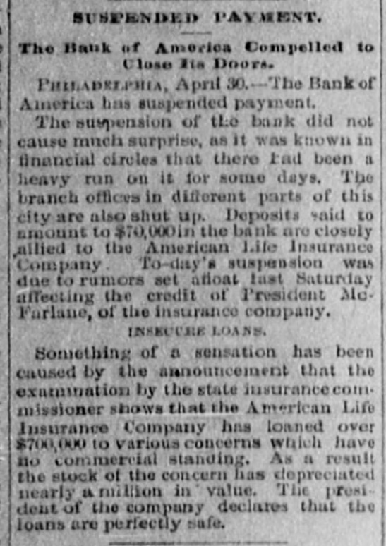 The Bank Failures. Elmer was the scene of quite a panic on Thursday last, caused by the reported unsoundness of the Elmer Bank, which was a branch of the Merchants' Bank, of Atlantic City. The excitement was started by an item in the Philadelphia Press in relation to the failure of the Bank of America, of that city, stating that the Merchants' Bank, of Atlantic, was a branch. Long before the hour of opening large numbers of anxious depositors gathered about the door, with their check and deposit books in hand. Manager Elwell's statement that the newspaper article was incorrect and that the Elmer Bank was a branch of the Merchants' Bank of Atlantic City and that neither the parent institution nor any of its branches were in any way connected with the Bank which had failed, fell as idle words upon men agitated by the fear of danger which seemed to threaten them, and for the first hour after the doors many deposits were reduced to the low water mark. At last the bottom was reached and before eleven o'clock Mr. Elwell had to admit that he had no more cash in the big safe; and finally, at a time when it required considerable courage to do so, a few firms, believers in the institution, began to make their regular daily deposits, with others waiting to take it out as fast as it came On Friday word was received that the parent bank at Atlantic City had suspended, when the rush for money was resumed with a desperation born of despair. The heavy run finally cleared the bank of all its cash, after which Cashier Elwell had to refuse all notes. A few of the many who have been caught in the crash are: Chas. S. Cotting Estate, $1,200; Rev. P. Corson, $800; Abram Cochran, $600; Jackson Clevenger, $400; Rufus W. Smith, $600; Daniel Watkins, $250; Samuel P. Baker, $220; Charles H. Morris, $268; Rev. J. G. Crate, $220; the Misses Long, $250; Thomas W. Brooks, $350. Among those whom are known have lost but have not been able to discover the amounts, are J. Frank Langley, Esq., George M. Bacon, Esq., Creamer Brothers, Drs. Woodruff and Cheesman, Chas. M. Surran, Wm. Strang, F. Wentzell & Bro., Samuel P. Foster, Hiram Nixon, A. M. Seabrook, S. Y. Townsend, R. T. Studimund, S. M. Vanmeter, Barber Collins, Jesse Garrison, Jesse Sordin, Thomas Edmonds, Samuel Christy, Aubery Reed, and a host of others. THE MULLICA HILL BRANCH. The Mullica Hill Bank, another branch of the Merchants', also closed its doors on Friday, caused by the suspension of the parent bank at Atlantic City. The suspension of the Bank of America in Philadelphia on Wednesday set in motion influences which bore too heavily on the branch and it was forced to yield to the stress. The management express the belief that the creditors will be paid dollar for dollar. The earnest hope is that the prediction will be fulfilled. The Mullica Hill branch of the Merchants' Bank at Atlantic City was organized April 30th, 1888. The directors elected at the last annual meeting were Charles W. Elkinton, Albert Parker, J. H. Mounce, William M. Colson, Robert McKeighan. Mr. Elkinton resigned the latter part of March. At the time of closing on Friday last, there was due depositors $16, 024.17; bills receivable, 716.91; cash on hand, $7.92. This paper, bills receivable, is first class. The depositors number 125, from 81 to $1000. William Bunning is the manager. He is a capable and painstaking official, and feels very sad over the misfortune to the bank. The depositors are not willing that the bank should continue. This Bank has done about one-third of the business, and at not more than one-third of the expense. Each director had taken $100 in stock, giving his note. Colson and McKeighan have paid theirs in cash. Among the business portion of the people, there is a feeling of insecurity about the matter, and while the losses, if any, may fall heavily upon some of the poorer classes, generally speaking, a majority will not be hurt very badly. Among the depositors are the following: Wm. Mankin, clerk, $175; John Yeager and wife, $200; Roger E. Costello, farmer, $300; Frye Hopkins, hotel keeper, $900; Amy Murphy, $100; John Garwood, $500; Edward Bunning, butcher, $40; Wm. H. Bunning, livery stable, $300; Jonathan Colson, farmer, $300; Wm. Colson, $300; Mrs. Debbie Smith, $300; Edward Ireland, conductor, $500; Jacob Ware, brakeman, $100; Mrs. Cornelia Thomas, $140; Mrs. Mary Huseback, $50; Rev. Dr. Brown and wife, $100; Rev. B. R. Black, $100; Mrs. With. Howery, $50; Jas. Ecret, $60; Chas.