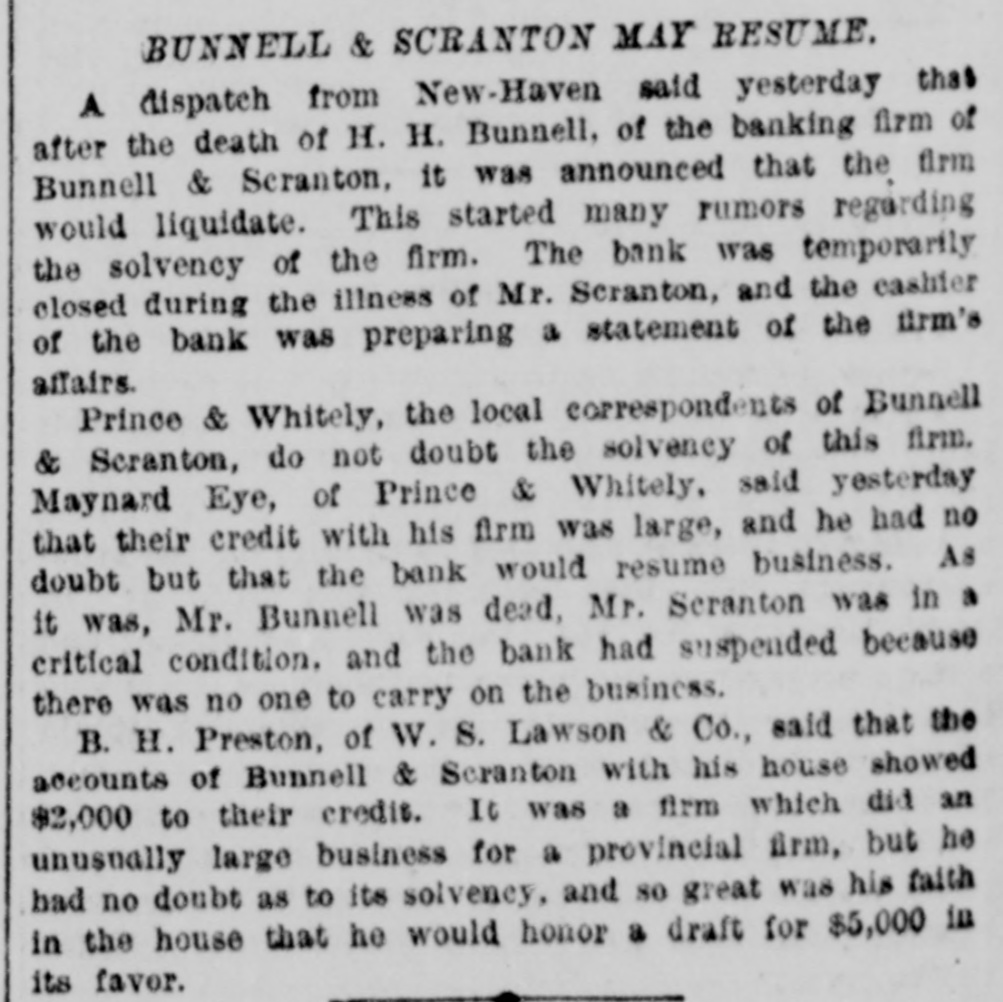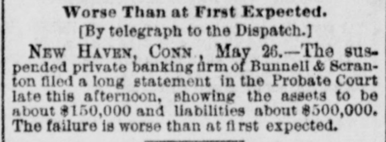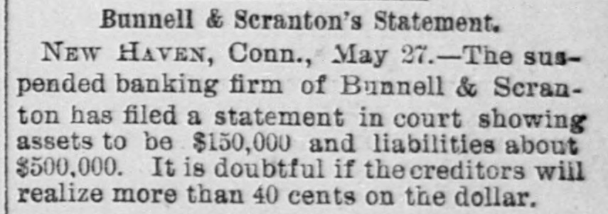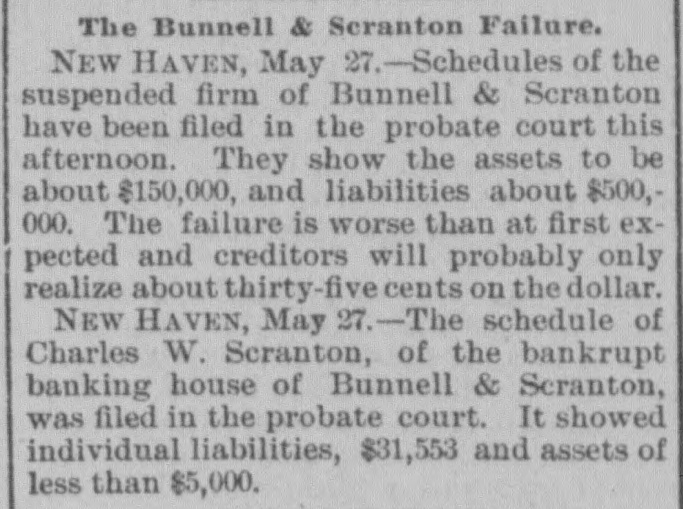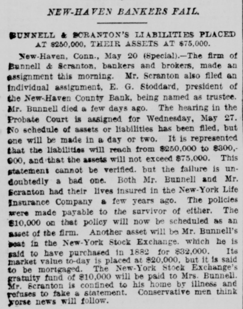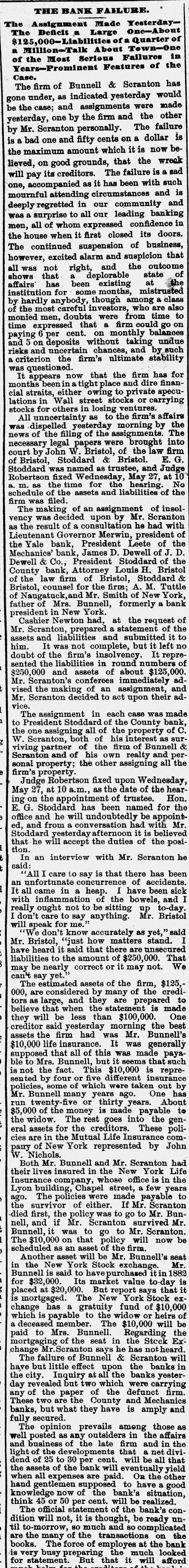 THE BANK FAILURE. The Assignment Made YesterdayThe Deficit a Large One-About $125,000-Liabilities of a Quarter a Million-Talk About Town-One of the Most Serious Failures in Years-Prominent Features of the Case. The firm of Bunnell & Scranton has gone under, as indicated yesterday would be the case; and assignments were made yesterday, one by the firm and the other by Mr. Scranton personally The failure is bad one and fifty cents on a dollar is the maximum amount which it is now believed, on good grounds, that the wreck will pay its creditors. The failure is sad one, accompanied as it has been with such mournful attending circumstances and is deeply regretted in our community and was surprise to all our leading banking men, all of whom expressed confidence in the house when it first closed its doors. The continued suspension of business, however, excited alarm and suspicion that all was not right, and the outcome shows that a deplorable state of affairs has been existing at the institution for some months, mistrusted by hardly anybody, though among class of the most careful investors, who are also monied men, doubts were from time to time expressed that firm could go on paying 6 per cent. on monthly balances and on deposits without taking undue risks and uncertain chances and by such a criterion the firm's ultimate stability was questioned It appears now that the firm has for months been in tight place and dire finan cial straits, either owing to private speculations in Wall street stocks or carrying stocks for others in losing ventures All unncertainty as to the firm's affairs was dispelled yesterday morning by the news of the filing of the assignments. The necessary legal papers were brought into court by John W. Bristol, of the law firm of Bristol, Stoddard & Bristol E. G. Stoddard was named as trustee, and Judge Robertson fixed Wedn day May 27, at 10 a.m.as the time for the hearing No schedule of the assets and liabilities of the filed was firm The making of an assignment of insolvency was decided upon by Mr Scranton as the result of a consultation he had with Lientenant Governor Merwin, president of the Yale bank, President Leete of the Mechanics bank. James D. Dewell of J. D. Dewell & Co. President Stoddard of the County bank Attorney Louis H. Bristol of the law firm of Bristol. Stoddard & Bristol, counsel for the firm: A. M. Tuttle of Naugatuck, and Mr. Smith of New York, father of Mrs. Bunnell, formerly a bank president in New York Cashier Newton had, at the request of Mr Scranton, prepared statement of the assets and liabilities and submitted it to him. It was not complete, but left no doubt of the firm's insolvency It represented the liabilities in round numbers of $250,000 and assets of about $125,000 Mr Scrant ton's conferees immediately advised the making of an assignment, and Mr Scranton decided to act upon their advice. The assignment in each case was made to President Stoddard of the County bank, the one assigning all of the property of C. W Scranton, both of his interest as surg viving partner of the firm of Bunnell & Scranton and of his own realty and personal property; the other assigning all the firm's property e Judge Robertson fixed upon Wednesday May 27. at 10 a.m. as the date of the hearing on the appointment of trustee Hon E. G. Stoddard has been named for the office and he will undoubtedly be appointed, and from conversation had with Mr. Stoddard yesterday afternoon it is believed that he will accept the duties of the position In an interview with Mr. Scranton he said All care to say is that there has been an unfortunate concurrence of accidents It all came in a heap [ have been sick with inflammat tion of the bowels. and I really ought not to be sitting up to-day T don't care to say anything Mr Bristol will speak for me. 'We don't know ccurately as yet," said I Mr Bristol, just how matters stand. have heard it said that there are unsecured liabilities to the amount of $250,000. That may be nearly correct or it may not. We can't say yet The estimated assets of the firm, $125 000, are considered by many of the credi tors as large, and they are prepared to believe that when the statement is made they will be less than $100,000 One creditor said yesterday morning the best assets the firm had was Mr. Bunnell's $10,000 life insurance. It was generally supposed that all of this was made payable to Mrs. Bunnell. but it seems that such not the fact. This $10,000 is represented by four or five different insurance policies, some of which were taken out by Mr Bunnell many years ago One has run twenty- or thirty years About $5,000 of the money is made payable to the widow The rest goes into the general assets for the creditors. These policies are in the Mutual Life Insurance comparry of New York represented by John W. Nichols Both Mr Bunnell and Mr Scranton had their lives insured in the New York Life Insurance company, whose office is in the Lyon building, Chapel street, a few years ago. The policies were made payable to the survivor of either If Mr. Scranton died first, the policy was to go to Mr. Bunnell, and if Mr Scranton survived Mr. Bunnell, it was to go to Mr Scranton. The $10,000 on that policy will now be scheduled as an asset of the firm Another asset will be Mr. Bunnell 's seat in the New York Stock exchange Mr. Bunnell said have purchased it in 1882 for $32,000. Its market value -day is placed at $20,000 But report says that it is mortgaged. The New York Stock exchange has a gratuity fund of $10,000 which is payable to the widow or heirs of a deceased membe The $10,000 will be paid to Mrs. Bunnell Regarding the mortgaging of the seat in the Stcck Exchange Mr.Scranton says he has not heard. The failure of Bunnell & Scranton will have but little effect upon the banks in the city Inquiry at all the banks yester day revealed but two which were carrying any of the paper of the defunct firm. These two are the County and Mechanics banks, but what they have is amply and