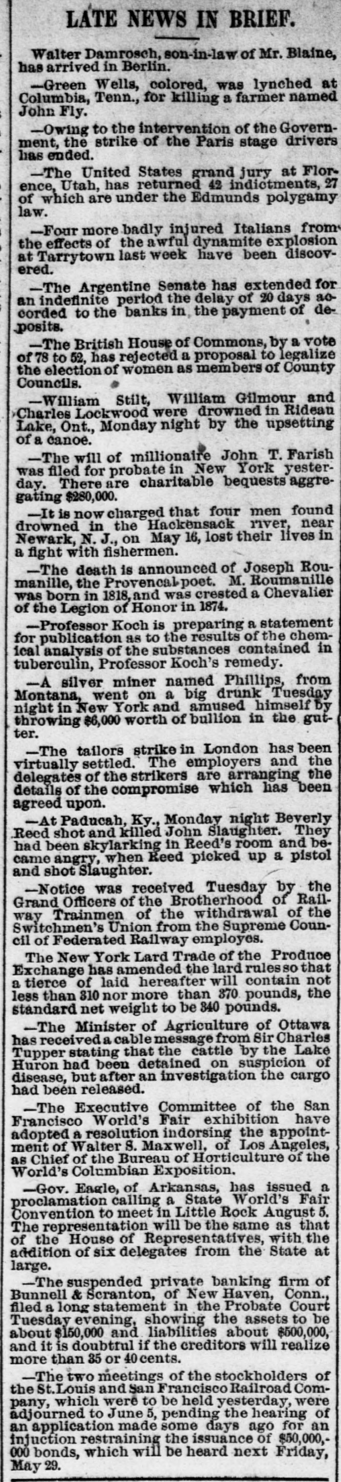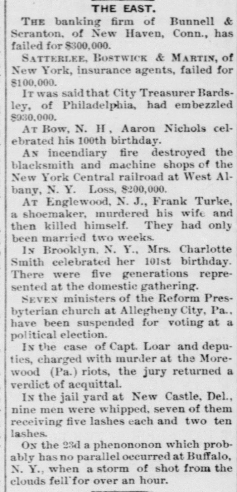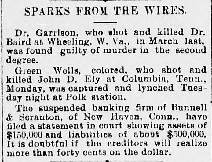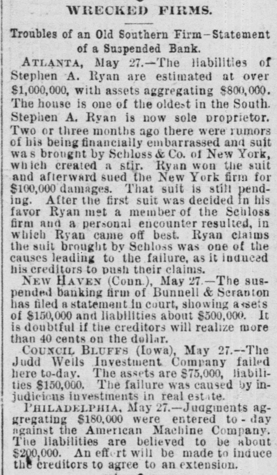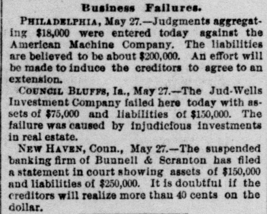 THE BANK FAILURE. The Assignment Made YesterdayThe Deficit a Large One-About $125,000-Liabilities of a Quarter a Million-Talk About Town-One of the Most Serious Failures in Years-Prominent Features of the Case. The firm of Bunnell & Scranton has gone under, as indicated yesterday would be the case; and assignments were made yesterday, one by the firm and the other by Mr. Scranton personally The failure is bad one and fifty cents on a dollar is the maximum amount which it is now believed, on good grounds, that the wreck will pay its creditors. The failure is sad one, accompanied as it has been with such mournful attending circumstances and is deeply regretted in our community and was surprise to all our leading banking men, all of whom expressed confidence in the house when it first closed its doors. The continued suspension of business, however, excited alarm and suspicion that all was not right, and the outcome shows that a deplorable state of affairs has been existing at the institution for some months, mistrusted by hardly anybody, though among class of the most careful investors, who are also monied men, doubts were from time to time expressed that firm could go on paying 6 per cent. on monthly balances and on deposits without taking undue risks and uncertain chances and by such a criterion the firm's ultimate stability was questioned It appears now that the firm has for months been in tight place and dire finan cial straits, either owing to private speculations in Wall street stocks or carrying stocks for others in losing ventures All unncertainty as to the firm's affairs was dispelled yesterday morning by the news of the filing of the assignments. The necessary legal papers were brought into court by John W. Bristol, of the law firm of Bristol, Stoddard & Bristol E. G. Stoddard was named as trustee, and Judge Robertson fixed Wedn day May 27, at 10 a.m.as the time for the hearing No schedule of the assets and liabilities of the filed was firm The making of an assignment of insolvency was decided upon by Mr Scranton as the result of a consultation he had with Lientenant Governor Merwin, president of the Yale bank, President Leete of the Mechanics bank. James D. Dewell of J. D. Dewell & Co. President Stoddard of the County bank Attorney Louis H. Bristol of the law firm of Bristol. Stoddard & Bristol, counsel for the firm: A. M. Tuttle of Naugatuck, and Mr. Smith of New York, father of Mrs. Bunnell, formerly a bank president in New York Cashier Newton had, at the request of Mr Scranton, prepared statement of the assets and liabilities and submitted it to him. It was not complete, but left no doubt of the firm's insolvency It represented the liabilities in round numbers of $250,000 and assets of about $125,000 Mr Scrant ton's conferees immediately advised the making of an assignment, and Mr Scranton decided to act upon their advice. The assignment in each case was made to President Stoddard of the County bank, the one assigning all of the property of C. W Scranton, both of his interest as surg viving partner of the firm of Bunnell & Scranton and of his own realty and personal property; the other assigning all the firm's property e Judge Robertson fixed upon Wednesday May 27. at 10 a.m. as the date of the hearing on the appointment of trustee Hon E. G. Stoddard has been named for the office and he will undoubtedly be appointed, and from conversation had with Mr. Stoddard yesterday afternoon it is believed that he will accept the duties of the position In an interview with Mr. Scranton he said All care to say is that there has been an unfortunate concurrence of accidents It all came in a heap [ have been sick with inflammat tion of the bowels. and I really ought not to be sitting up to-day T don't care to say anything Mr Bristol will speak for me. 'We don't know ccurately as yet," said I Mr Bristol, just how matters stand. have heard it said that there are unsecured liabilities to the amount of $250,000. That may be nearly correct or it may not. We can't say yet The estimated assets of the firm, $125 000, are considered by many of the credi tors as large, and they are prepared to believe that when the statement is made they will be less than $100,000 One creditor said yesterday morning the best assets the firm had was Mr. Bunnell's $10,000 life insurance. It was generally supposed that all of this was made payable to Mrs. Bunnell. but it seems that such not the fact. This $10,000 is represented by four or five different insurance policies, some of which were taken out by Mr Bunnell many years ago One has run twenty- or thirty years About $5,000 of the money is made payable to the widow The rest goes into the general assets for the creditors. These policies are in the Mutual Life Insurance comparry of New York represented by John W. Nichols Both Mr Bunnell and Mr Scranton had their lives insured in the New York Life Insurance company, whose office is in the Lyon building, Chapel street, a few years ago. The policies were made payable to the survivor of either If Mr. Scranton died first, the policy was to go to Mr. Bunnell, and if Mr Scranton survived Mr. Bunnell, it was to go to Mr Scranton. The $10,000 on that policy will now be scheduled as an asset of the firm Another asset will be Mr. Bunnell 's seat in the New York Stock exchange Mr. Bunnell said have purchased it in 1882 for $32,000. Its market value -day is placed at $20,000 But report says that it is mortgaged. The New York Stock exchange has a gratuity fund of $10,000 which is payable to the widow or heirs of a deceased membe The $10,000 will be paid to Mrs. Bunnell Regarding the mortgaging of the seat in the Stcck Exchange Mr.Scranton says he has not heard. The failure of Bunnell & Scranton will have but little effect upon the banks in the city Inquiry at all the banks yester day revealed but two which were carrying any of the paper of the defunct firm. These two are the County and Mechanics banks, but what they have is amply and