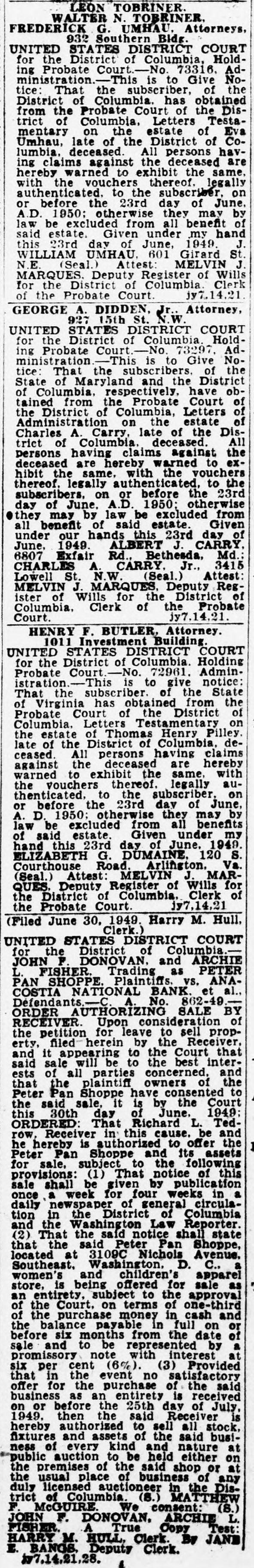 LEON TOBRINER WALTER N TOBRINER. FREDERICK G UMHAU Attorneys 932 Southern Bldg UNITED STATES DISTRICT COURT for the District of Columbia Hold ing Probate Court No 73316 Administration This is to Give No tice That the subscriber. of the District of Columbia has obtained from the Probate Court of the Dis trict of Columbia Letters Testamentary on the estate of Eva Umhau, late of the District of Columbia deceased All persons having claims against the deceased are hereby warned to exhibit the same, with the vouchers thereof egally authenticated. to the subscriber on or before the 23rd day of June, A.D 1950: otherwise they may by law be excluded from all benefit of said estate Given under my hand this 23rd day of June. 1949 WILLIAM UMHAU 601 Girard St N.E (Sea Attest MELVIN MARQUES Deputy Register of Wills for the District of Columbia Clerk of the Probate Court jy7.14.21 GEORGE A. DIDDEN Attorney N.W St. 927 15th UNITED STATES DISTRICT COURT for the District of Columbia Hold Ad ing Probate Court No ministration This is to Give No. tice That the subscribers of the State of Maryland and the District of Columbia respectively have obtained from the Probate Court of the District of Columbia, Letters of Administration on the estate of Charles A Carry late of the DisAll trict of Columbia deceased. persons having claims against the deceased are hereby warned to exhibit the same. with the vouchers thereof legally authenticated. to the subscribers, on or before the 23rd day of June A.D 1950 otherwise they may by law be excluded from all benefit of said estate Given under our hands this 23rd day of June 1949 ALBERT CARRY 6807 Exfair Rd Bethesda Md. CHARLES A CARRY Jr. 3415 Attest Lowell St. N.W (Seal. MELVIN J MARQUES Deputy Reg ister of Wills for the District of Columbia. Clerk of the Probate jy7.14.21 Court HENRY F. BUTLER Attorney 1011 Investment Building UNITED STATES DISTRICT COURT for the District of Columbia Holding Probate Court No. 72961. Admin istration This is to give notice That the subscriber of the State of Virginia has obtained from the Probate Court of the District of Columbia, Letters Testamentar: on the estate of Thomas Henry Pilley late of the District of Columbia, deceased All persons having claims against the deceased are hereby warned to exhibit the same with the vouchers thereof legally authenticated to the subscriber on or before the 23rd day of June. A D. 1950 otherwise they may by law be excluded from all benefits of said estate Given under my hand this 23rd day of June. 1949 ELIZABETH G. DUMAINE. 120 S Va Courthouse Road Arlington (Seal. Attest MELVIN J. MARQUES. Deputy Register of Wills for the District of Columbia Clerk of jy7,14,21 the Probate Court (Filed June 30, 1949. Harry M. Hull, Clerk.) UNITED STATES DISTRICT COURT for the District of Columbia JOHN DONOVAN and ARCHIE FISHER Trading as PETER PAN SHOPPE Plaintiffs vs. ANACOSTIA NATIONAL BANK et al. Défendant No 862-49 ORDER AUTHORIZING SALE BY RECEIVER Upon consideration of the petition for leave to sell property, filed herein by the Receiver. and it appearing to the Court that said sale will be to the best interests of all parties concerned. and that the plaintiff owners of the Peter Pan Shoppe have consented to the said sale. it is by the Court this 30th day of June, 1949 ORDERED That Richard L Tedrow Receiver in this cause be and he hereby is authorized to offer the Peter Pan Shoppe and its assets for sale. subject to the following provisions (1) That notice of this sale shall be given by publication a once a week for four weeks in daily newspaper of general circula. tion in the District of Columbia and the Washington Law Reporter. (2) That the said notice shall state that the said Peter Pan Shoppe, located at 3109C Nichols Avenue. a Southeast, Washington, D. C. women's and children's apparel store, is being offered for sale as an entirety subject to the approval of the Court, on terms of ne-third of the purchase money in cash and the balance payable in full on or before six months from the date of sale and to be represented by a at promissory note with interest six per cent (6%) (3) Provided that in the event no satisfactory offer for the purchase of the said business as an entirety is received on or before the 25th day of July, is 1949, then the said Receiver hereby authorized to sell all stock. fixtures and assets of the said business of every kind and nature at public auction to be held either on the premises of the said shop or at the usual place of business of any duly licensed auctioneer in the District of Columbia (8.) We McGUIRE consent (8.) JOHN F. DONOVAN. ARCHIE L. FISHER A True Copy Test HARRY M HULL, Clerk By JANE BANGS Deputy Clerk. 177.14.21.28 &
