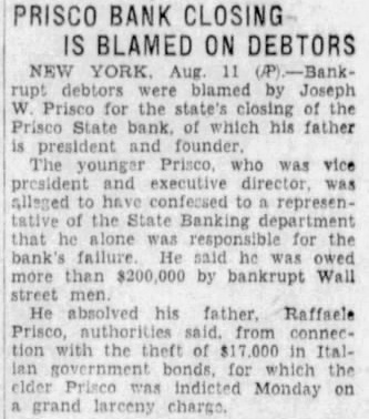 PRISCO BANK CLOSING IS BLAMED ON DEBTORS NEW YORK. 11 (P).-Bankrupt debtors were blamed by Joseph W Prisco for the state's closing the Prisco State bank of which his father is The younger Prisco, who was vice and executive director was alleged confessed to representative of the State Banking that he alone was responsible for the bank's failure. He said he was owed more than $200,000 by bankrupt Wall street He absolved his Raffaele from connection with the theft of $17,000 in Itallan bonds, for which the elder Prisco was indicted Monday on a grand larceny charge.