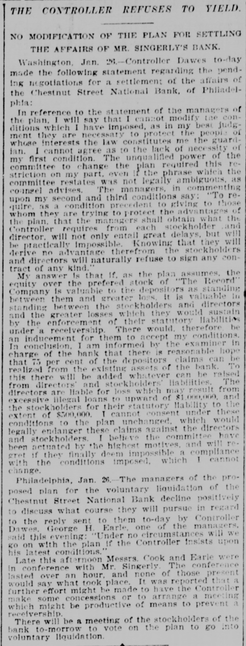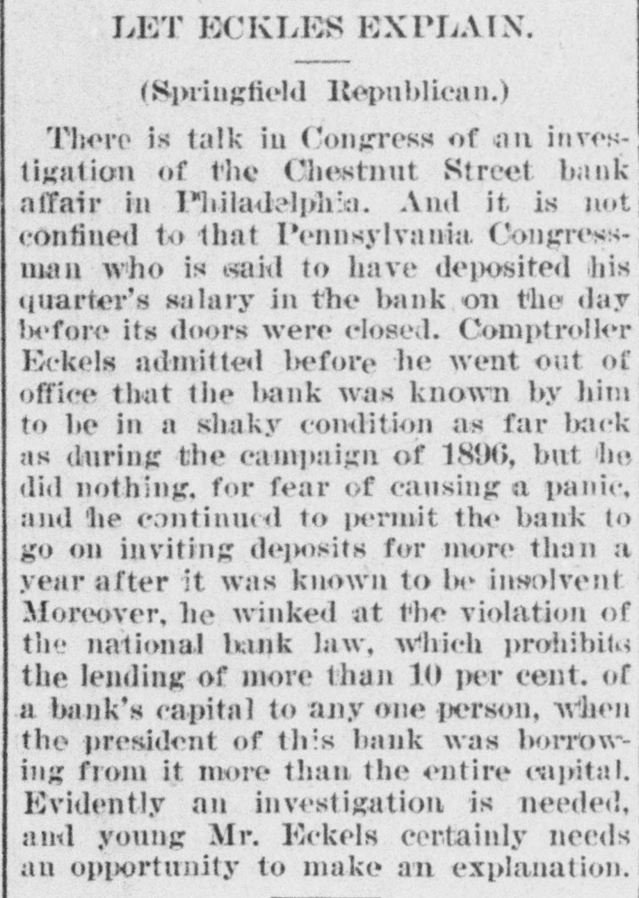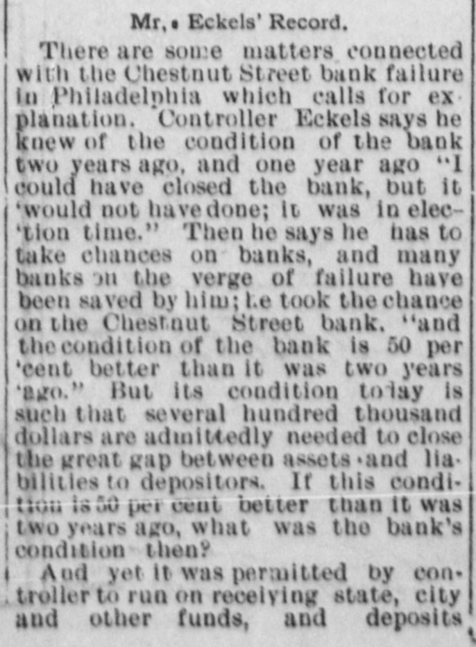 The Controller's Statement. WASHINGTON, Dec. 23.-Mr. Eckels, the controller of the currency, said to-day, in regard to the failure of the Chestnut-street National Bank of Philadelphia, that the suspension was primarily due to the shrinkage in the value of the bonds and notes of the Singerly pulp and paper mills, located at Elkton, Md. The capital of the bank is $500,000, and at the present time its deposits aggregate about $1,700,000 and its surplus about $150,000. Mr. Eckels has been in Philadelphia several times recently, trying to make arrangements by which the pulp and paper mill's securities could be taken cut by the assets of the bank and preferred stock of the Philadelphia Record Company substituted. By this and certain other changes, Mr. Eckels hoped to put the bank in first-class condition. Up to 5 o'clock last night it was thought that the plan would be adopted, but at that time a hitch curred which rendered suspension necessary. When the pulp and paper mill's securities were taken by the bank they were regarded by every one as first-class, but since that time paper has fallen in price from 10 cents a pound to less than 2 cents, and the securities have depreciated in proportion. Mr. Eckels said there was not the least suspicion of any wrong-doing on the part of any one connected with the bank, and he still had strong hopes of arranging for the voluntary liquidation of the bank's affairs without the expense incident to the appointment of a receiver. Mr. Eckels expressed the belief that the bank ultimately would pay every dollar it owes. The Philadelphia Record. which is owned by President Singerly, Mr. Eckels said, is a very valuable property, paying about 5 per cent. annually on about $5,000,000. Controller Eckels said this afternoon that no other banks were involved and that in his judgment none would be affected by the failures. Mr. Eckels and Mr. Hart, the bank examiner in charge, had a conversation late this afternoon over the long-distance telephone. Mr. Hart said that a joint meeting of the directors of the two failed concerns, with Mr. John C. Bullitt, who is acting as counsel for the department, Mr. Coffin, the deputy controller, and himself. was then in progress. and that they were working on a plan to bring about voluntary liquidation, with reasonable hope of success. Among the directors present were several men of large means and it was hoped that a final settlement on this basis ultimately would be secured.