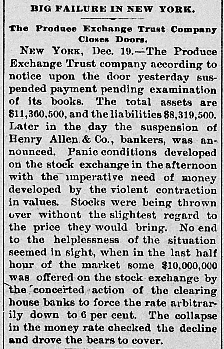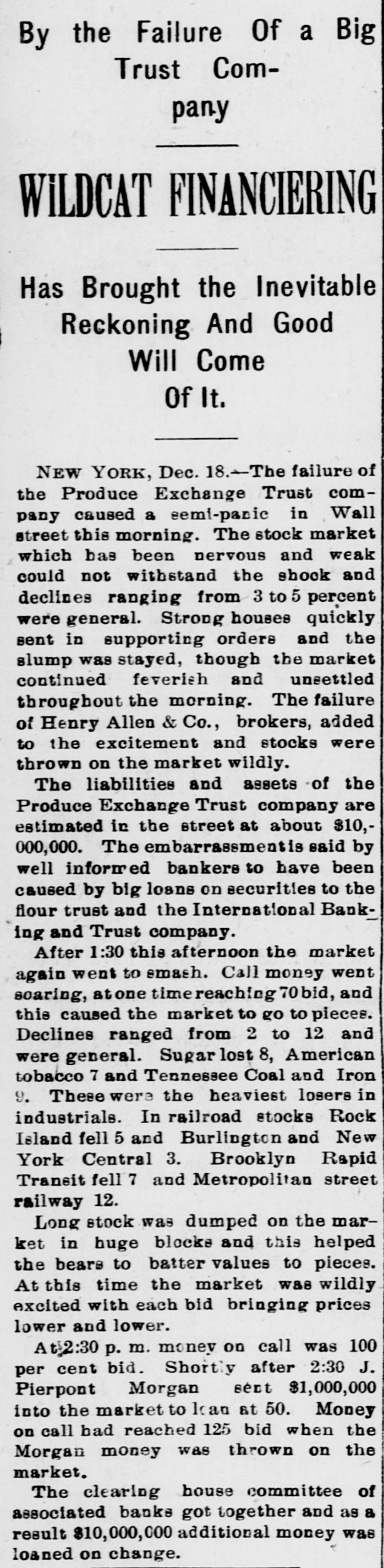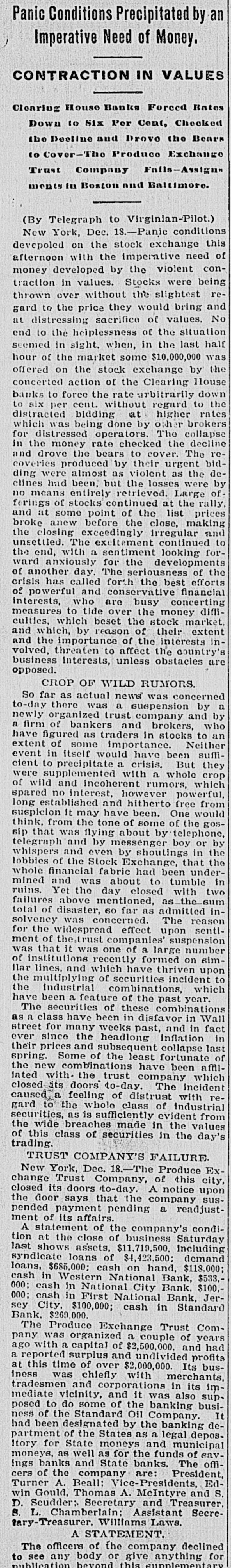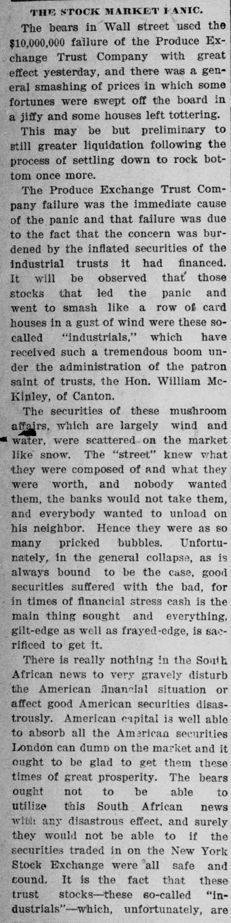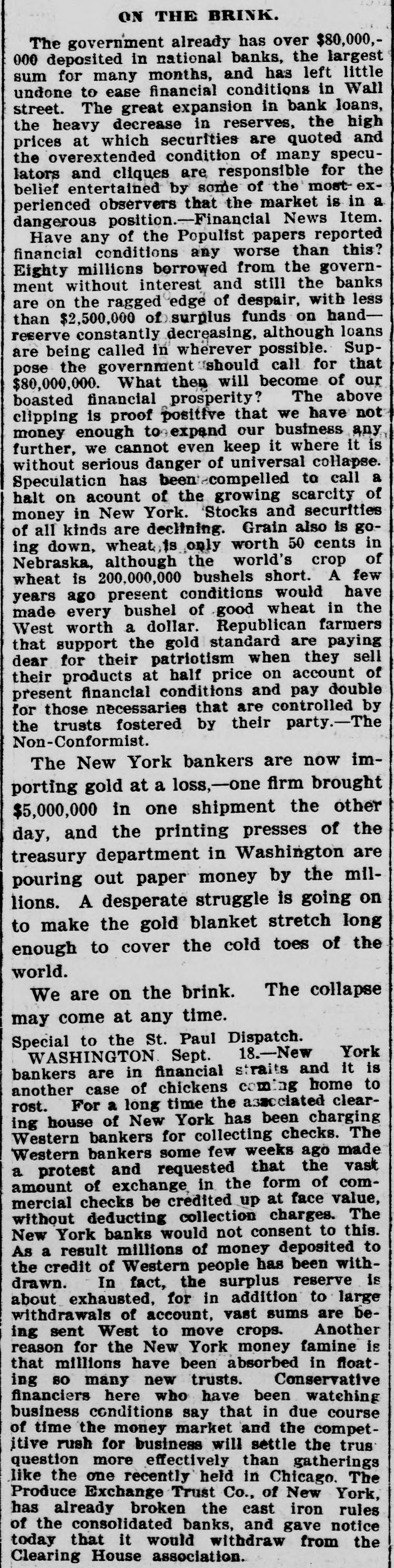 # ON THE BRINK. The government already has over $80,000,000 deposited in national banks, the largest sum for many months, and has left little undone to ease financial conditions in Wall street. The great expansion in bank loans, the heavy decrease in reserves, the high prices at which securities are quoted and the overextended condition of many specu-lators and cliques are responsible for the belief entertained by some of the most ex-perienced observers that the market is in a dangerous position.-Financial News Item. Have any of the Populist papers reported financial conditions any worse than this? Eighty millions borrowed from the govern-ment without interest and still the banks are on the ragged edge of despair, with less than $2,500,000 of surplus funds on hand-reserve constantly decreasing, although loans are being called in wherever possible. Suppose the government should call for that $80,000,000. What then will become of our boasted financial prosperity? The above clipping is proof positive that we have not money enough to expand our business any further, we cannot even keep it where it is without serious danger of universal collapse. Speculation has been compelled to call a halt on acount of the growing scarcity of money in New York. Stocks and securities of all kinds are declining. Grain also is going down, wheat is only worth 50 cents in Nebraska, although the world's crop of wheat is 200,000,000 bushels short. A few years ago present conditions would have made every bushel of good wheat in the West worth a dollar. Republican farmers that support the gold standard are paying dear for their patriotism when they sell their products at half price on account of present financial conditions and pay double for those necessaries that are controlled by the trusts fostered by their party. The Non-Conformist. The New York bankers are now im-porting gold at a loss, -one firm brought $5,000,000 in one shipment the other day, and the printing presses of the treasury department in Washington are pouring out paper money by the mil-lions. A desperate struggle is going on to make the gold blanket stretch long enough to cover the cold toes of the world. We are on the brink. The collapse may come at any time. Special to the St. Paul Dispatch. WASHINGTON. Sept. 18.-New York bankers are in financial straits and it is another case of chickens coming home to rost. For a long time the asacciated clearing house of New York has been charging Western bankers for collecting checks. The Western bankers some few weeks ago made a protest and requested that the vast amount of exchange in the form of com-mercial checks be credited up at face value, without deducting collection charges. The New York banks would not consent to this. As a result millions of money deposited to the credit of Western people has been with-drawn. In fact, the surplus reserve is about exhausted, for in addition to large withdrawals of account, vast sums are being sent West to move crops. Another reason for the New York money famine is that millions have been absorbed in floating so many new trusts. Conservative financiers here who have been watching business conditions say that in due course of time the money market and the compet-itive rush for business will settle the trus question more effectively than gatherings like the one recently held in Chicago. The Produce Exchange Trust Co., of New York, has already broken the cast iron rules of the consolidated banks, and gave notice today that it would withdraw from the Clearing House association.