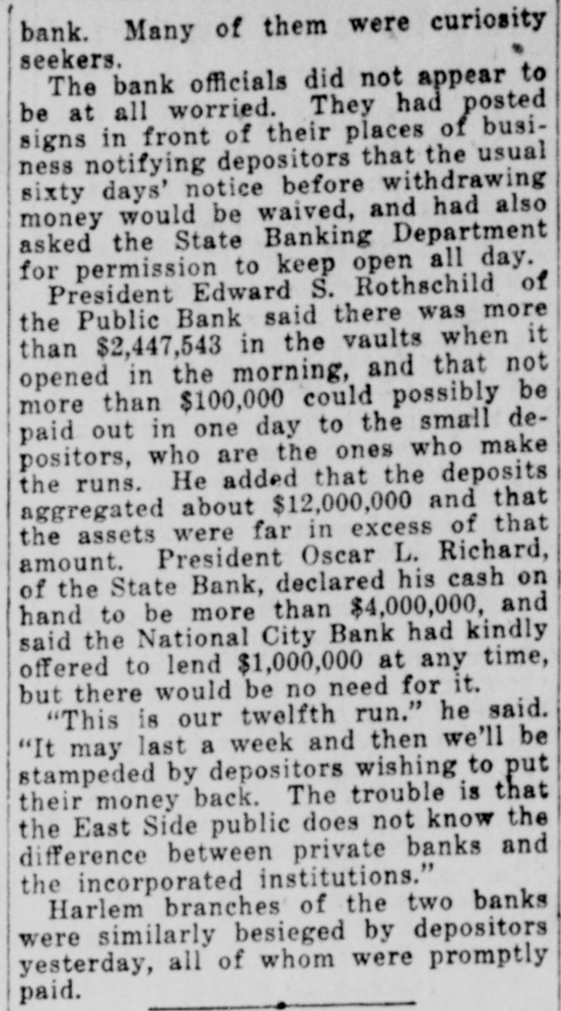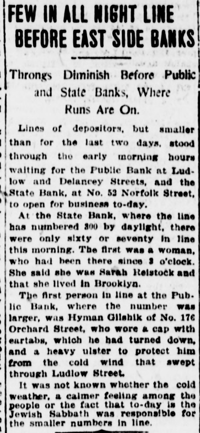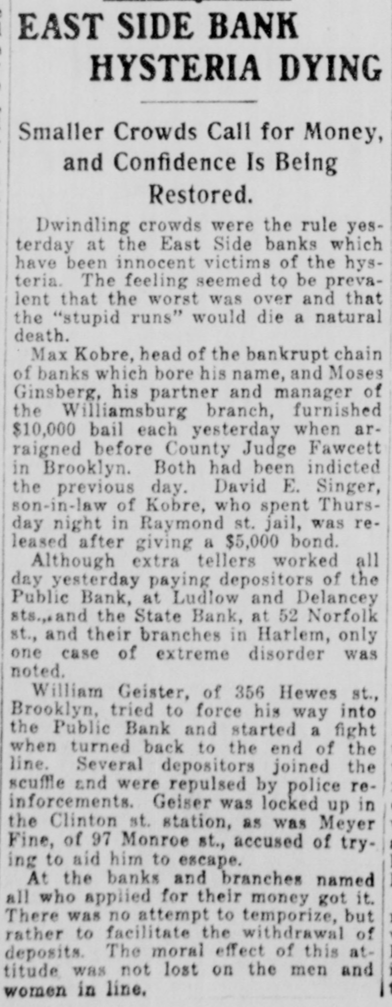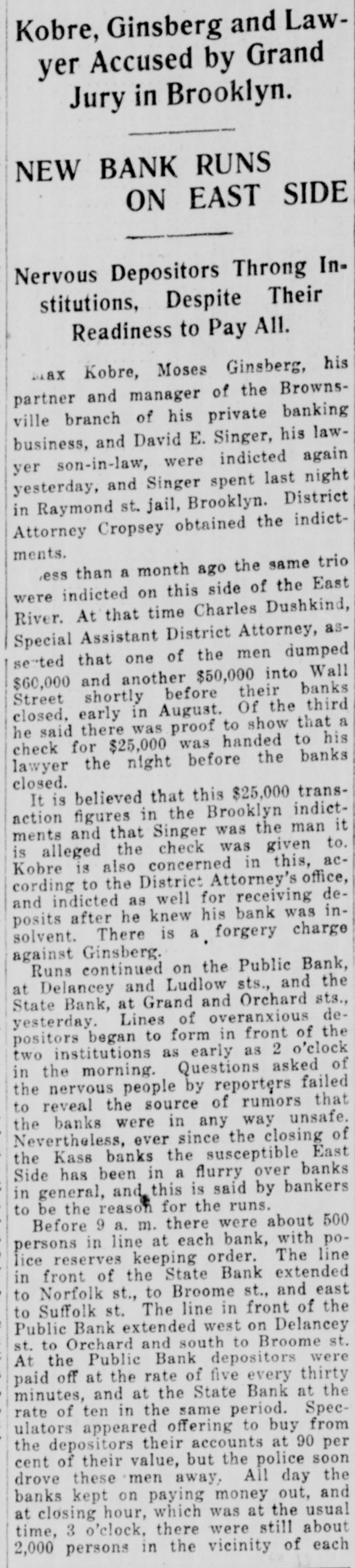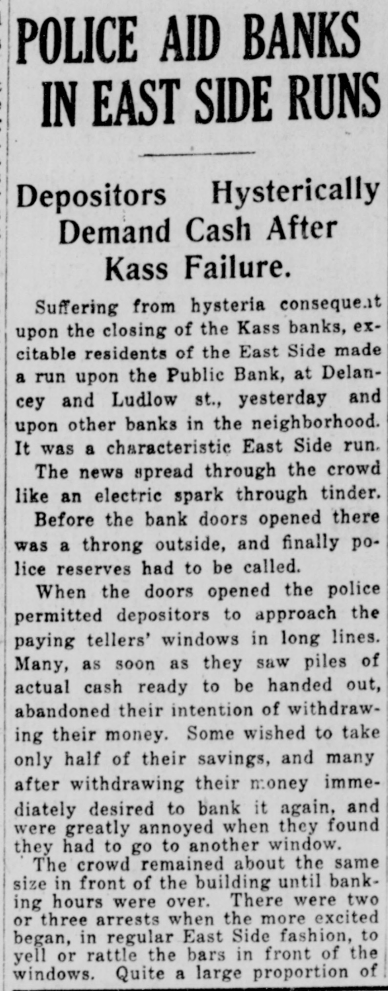 EAST SIDE BANKS FACE RUNS; SEQUEL TO KASS CLOSING Thousand at Doors of Public Bank, Delancey Street, at Opening To-day. #4 TELLERS KEPT BUSY. Bank of United States Uses Hose to Keep Crowd Away. As an aftermath of the closing of the Kass banks on the east side, in Harlom and in Williamsburg by the State Superintendent of Banking yes$erday, there was a rush on nearly every east side bank to-day. There was no indication that the free rebources of any of them would not be anough to meet the strain. The biggest crowd was at the Public Bank.at Delancey and Ludlow streets. The pressure there began early yesterday. L. P. Pullman, the cashier put fourteen employees of the bank at work as tellers, ordered fifteen depositors admitted at a time and announced that the bank would not take advantage of its privilege of closing at 3 o'clock, but would stay open to 8 o'clock. The big electric sign which flashes the legend "Resources $14,000,000** was speeded up a little and until closing time two policemen from the Delancey street station had no trouble in keeping order. After 8 o'clock, however, a great browd gathered before the doors and grew uneasy and then noisy. A platoon of reserves was called from the station. Their appearance was taken by the crowd as an indication that something had really gone wrong with the bank, and there was soinething like a riot in progress until after 10 o'clock. There were a thousand persons in front of the bank at daylight and flerce rushes were made at the doors even before 9 o'clock, the opening hour. The police, first forming the troubled depositors, many of whom were women.carrying bables, into two lines which reached to Orchard Street, admitted squads of fifteen. Clerks of the bank, many of them girls with persuasive ways, were busy pointing out men and women at several windows depositing money. Depositors were urged not to sacrifice their January interest by drawing out money now. The bank has 15,000 depositors. "These poor people are only hurting themselves in their fright," said Mr. Pullman. "It is only natural in view of yesterday's failure and the others which have kept the whole neighborhood excited for months. Our capital and surplus is over a million dollars and back of them we have the resources of our directors, every one of whom, with one exception. is a milMonatre. "Our assets are all in liquid form. We have not a loan for more than three months. We have been prepar-