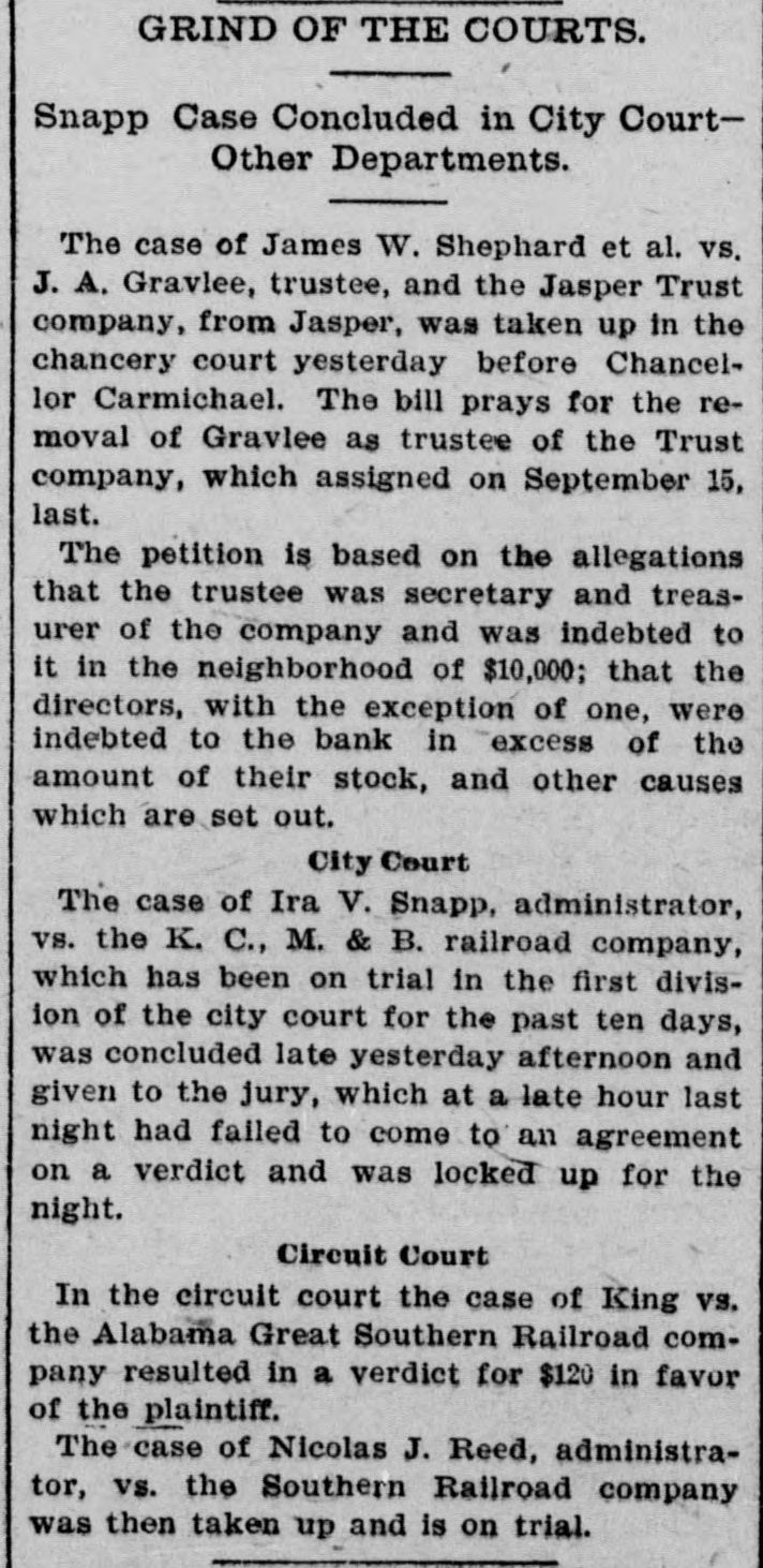 CLOSED ITS DOORS. Jasper Trust Company Will Pay Dollar for Dollar. Jasper, Ala., September 15.-(Special.)This morning at the regular opening hour a notice was posted on the door of the Jasper Trust company, stating that an a3signment had been made with John A. Gravlee, as assignee. The cause of the assignment is the heavy run which has been made on the bank by depositors this week. This run is the result of the suit brought by John A. James, in the United States court, asking for a receiver for the Jasper Town and Lands company, at the same time seeking to have a receiver appointed for the Trust company, inasmuch as the land company owned a lot of stock in the trust company. This action stirred up the depositors who began a run yesterday. It was very heavy and continued through yesterday. This morning, before banking hours, the directors of the bank held a meeting and decided to assign. The statement given out shows the liabilities to be $65,000; assets $80,000. In the liabi ities are included $33,000 of capital and $20,000 yet due depos:tors. The bank was capitalized at $50,000, but only $33,000 had been issued . "The depositors will get every cent of their money," said one of the directors this morning. "The bank was not crippled in the least, and only this unfortunate litigation could have hurt its business." The Jasper Trust company has been a financialy sure thing in Alabama for a long time. During the panic it kept its doors open, and so safe was it in the opinion of
