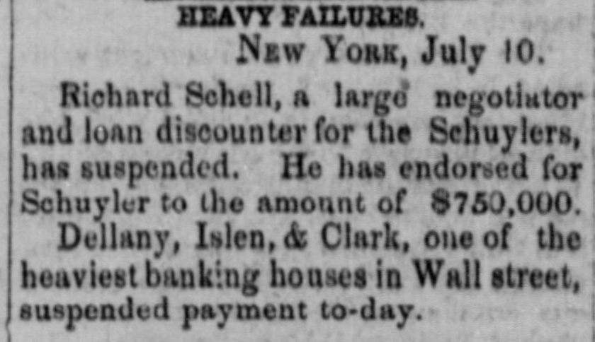 HEAVY FAILURES. NEW YORK, July 10. Richard Schell, a large negotiator and loan discounter for the Schuylers, has suspended. He has endorsed for Schuyler to the amount of $750,000. Dellany, Islen, & Clark, one of the heaviest banking houses in Wall street, suspended payment to-day.