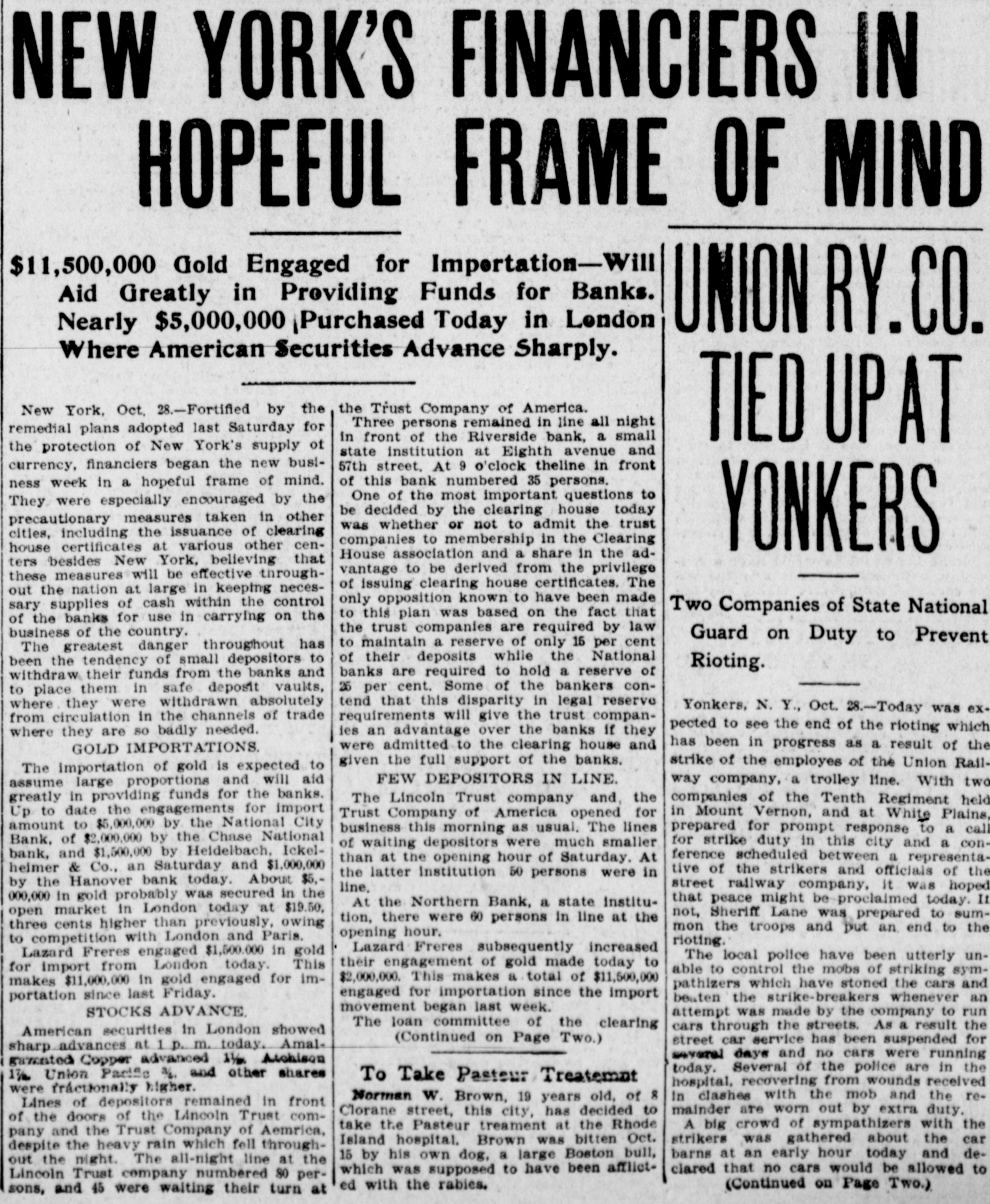 NEW YORK'S FINANCIERS IN HOPEFUL FRAME OF MIND $11,500,000 Gold Engaged for Impertation-Will Aid Greatly in Providing Funds for Banks. UNION RY.CO. Nearly $5,000,000 |Purchased Today in Lendon Where American Securities Advance Sharply. the Trust Company of America. New York, Oct. 28.-Fortified by the Three persons remained in line all night remedial plans adopted last Saturday for in front of the Riverside bank, a small TIED UP AT the protection of New York's supply of state institution at Eighth avenue and currency, financiers began the new busi57th street. At 9 o'clock theline in front of this bank numbered 35 persons. ness week in a hopeful frame of mind. One of the most important questions to They were especially encouraged by the be decided by the clearing house today precautionary measures taken in other was whether or not to admit the trust cities, including the issuance of clearing companies to membership in the Clearing house certificates at various other cenYONKERS House association and a share in the adters besides New York, believing that vantage to be derived from the privilege these measures will be effective throughof issuing clearing house certificates. The out the nation at large in keeping necesonly opposition known to have been made sary supplies of cash within the control Two Companies of State National to this plan was based on the fact that of the banks for use in carrying on the the trust companies are required by law business of the country. Guard on Duty to Prevent to maintain a reserve of only 15 per cent The greatest danger throughout has of their deposits while the National been the tendency of small depositors to Rioting. banks are required to hold a reserve of withdraw their funds from the banks and 25 per cent. Some of the bankers conto place them in safe deposit vaults, tend that this disparity in legal reserve where they were withdrawn absolutely Yonkers, N. Y., Oct. 28.-Today was exrequirements will give the trust companfrom circulation in the channels of trade pected to see the end of the rioting which ies an advantage over the banks if they where they are so badly needed. has been in progress as a result of the were admitted to the clearing house and GOLD IMPORTATIONS. given the full support of the banks. strike of the employes of the Union RailThe importation of gold is expected to FEW DEPOSITORS IN LINE. way company, a trolley line. With two assume large proportions and will aid greatly in providing funds for the banks. The Lincoln Trust company and, the companies of the Tenth Regiment held Up to date the engagements for import Trust Company of America opened for in Mount Vernon, and at White Plains, amount to $5,000,000 by the National City business this morning as usual. The lines prepared for prompt response to a call Bank, of $2,000,000 by the Chase National for strike duty in this city and a conof waiting depositors were much smaller bank, and $1,500,000 by Heidelbach, Ickelference scheduled between a representathan at the opening hour of Saturday. At heimer & Co., an Saturday and $1,000,000 tive of the strikers and officials of the the latter Institution 50 persons were in by the Hanover bank today. About $5,street railway company, it was hoped line. 000,000 in gold probably was secured in the that peace might be proclaimed today. It At the Northern Bank, a state instituopen market in London today at $19.50, not, Sheriff Lane was prepared to sumtion, there were 60 persons in line at the three cents higher than previously, owing mon the troops and put an end to the opening hour. to competition with London and Paris. rioting. Lazard Freres subsequently increased Lazard Freres engaged $1,500.000 in gold The local police have been utterly untheir engagement of gold made today to for import from London today. This able to control the mobs of striking sym$2,000,000. This makes a total of $11,500,000 makes $11,000,000 in gold engaged for impathizers which have stoned the cars and engaged for importation since the import portation since last Friday. beaten the strike-breakers whenever an movement began last week. STOCKS ADVANCE attempt was made by the company to run The loan committee of the clearing cars through the streets. As a result the American securities in London showed (Continued on Page Two.) street car service has been suspended for sharp advances at 1 D. m. today. Amalseveral days and no cars were running gamated Copper advanced 11/m. Atchison today. Several of the police are in the 1½. Union Paciac 2/2. and other shares To Take Pasteur Treatemat hospital, recovering from wounds received were fráctionally higher. In clashes with the mob and the reNorman W. Brown, 19 years old, of 8 Lines of depositors remained in front mainder are worn out by extra duty. Clorane street, this city, has decided to of the doors of the Lincoln Trust comA big crowd of sympathizers with the take the Pasteur treament at the Rhode pany and the Trust Company of Aemrica, strikers was gathered about the car Island hospital. Brown was bitten Oct. despite the heavy rain which fell throughbarns at an early hour today and de15 by his own dog, a large Boston bull, out the night. The all-night line at the clared that no cars would be allowed to which was supposed to have been afflictLincoln Trust company numbered 80 pered with the rabies. (Continued on Page Two.) sons, and 45 were waiting their turn at