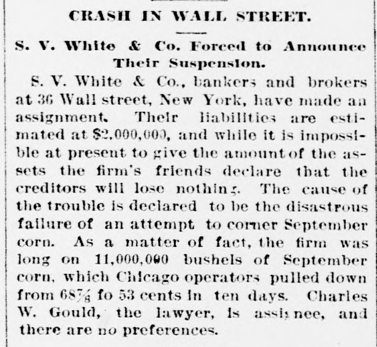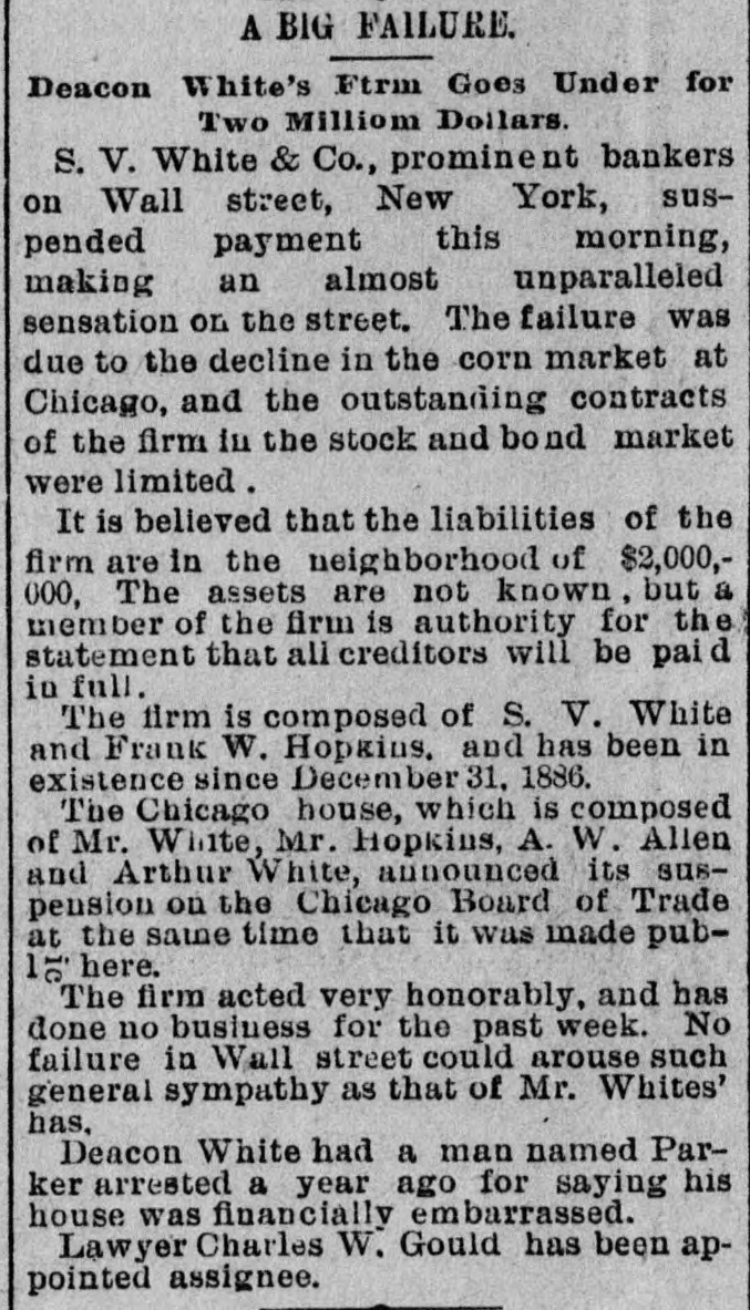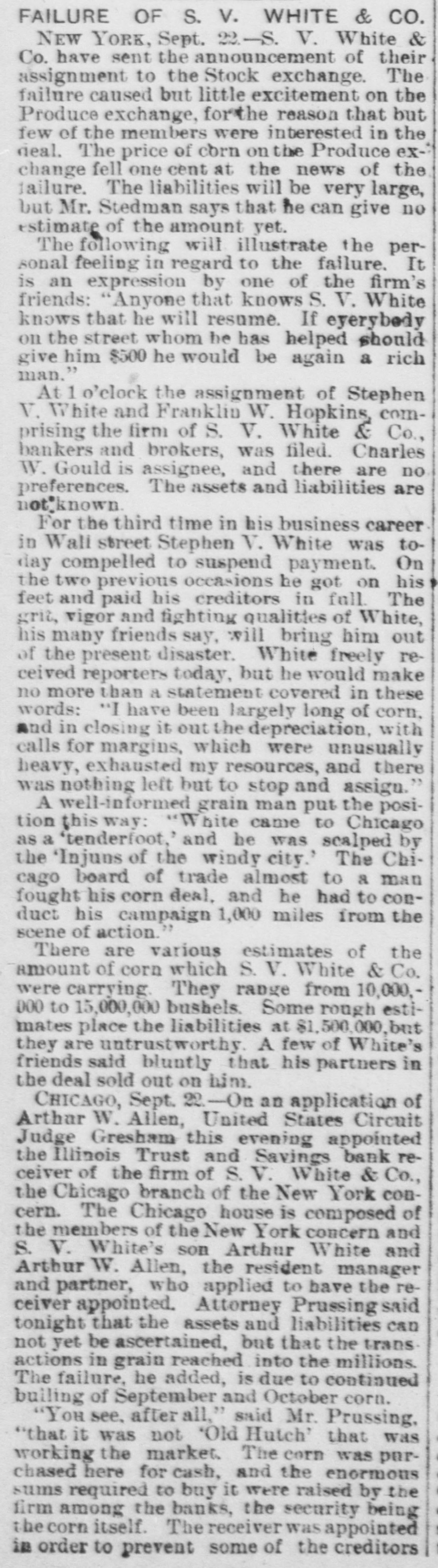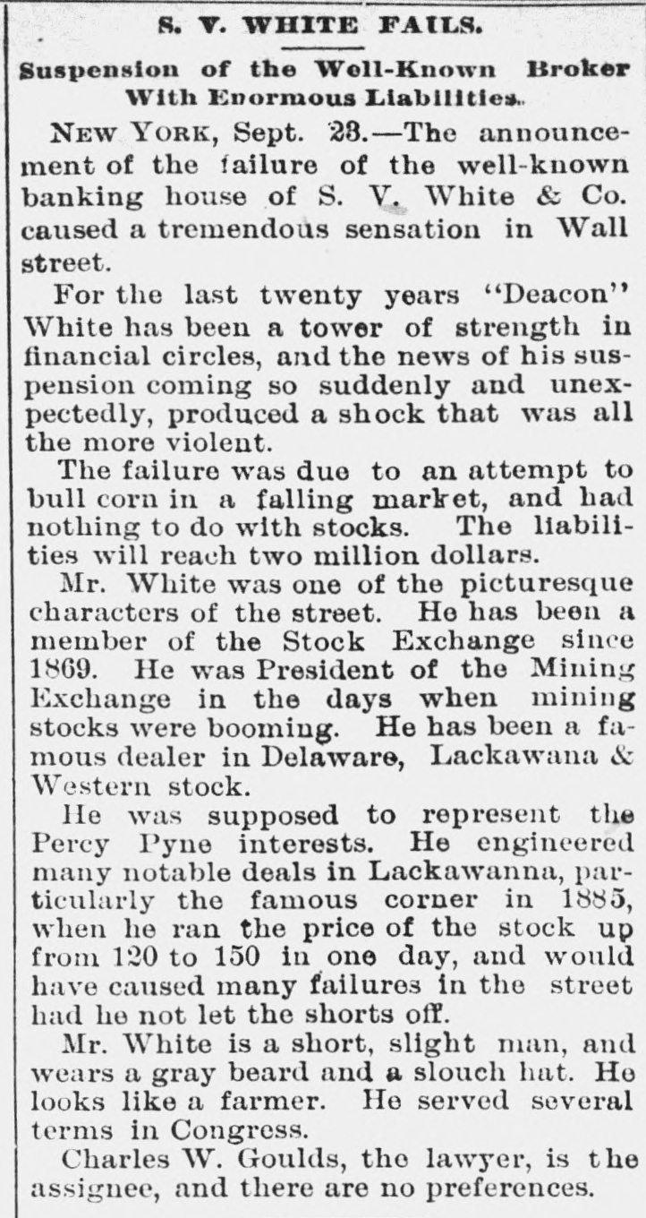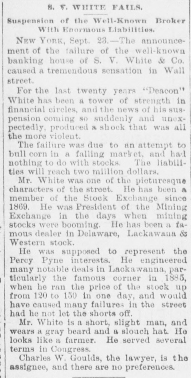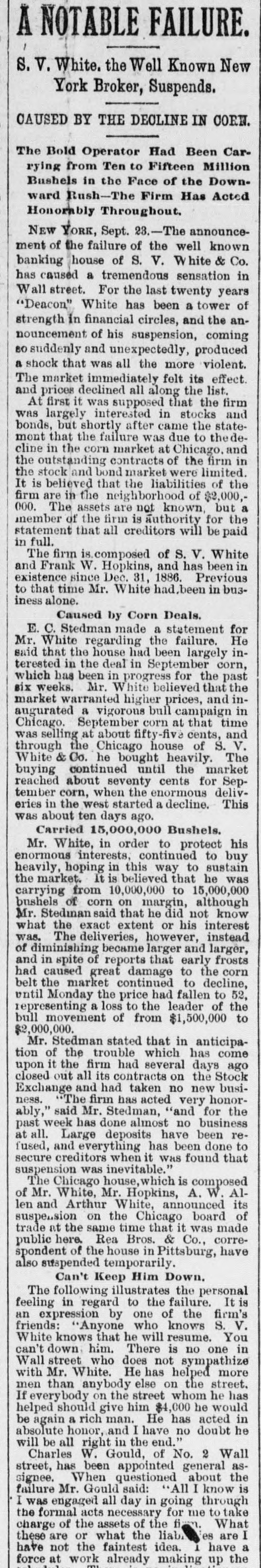 A NOTABLE FAILURE. S. V. White. the Well Known New York Broker, Suspends. CAUSED BY THE DEOLINE IN CORN. The Bold Operator Had Been Carrying from Ten to Fifteen Million Bushels in the Face of the Down. ward Rush-The Firm Has Acted Honorably Throughout. NEW YORK, Sept. 23.-The announcement of the failure of the well known banking house of S. V. White & Co. has caused a tremendous sensation in Wall street. For the last twenty years "Deacon" White has been a tower of strength in financial circles, and the announcement of his suspension, coming BO suddenly and unexpectedly, produced a shock that was all the more violent. The market immediately felt its effect. and prices declined all along the list. At first it was supposed that the firm WAS largely interested in stocks and bonds, but shortly after came the statemont that the failure was due to thedecline in the corn market at Chicago, and the outstanding contracts of the firm in the stock and bond market were limited. It is believed that the liabilities of the firm are in the neighborhood of $2,000,000. The assets are not known, but a member of the firm is authority for the statement that all creditors will be paid in full. The firm is composed of S. V. White and Frank W. Hopkins, and has been in existence since Dec. 31, 1886. Previous to that time Mr. White had,been in bu3iness alone. Caused by Corn Deals. E. C. Stedman made a statement for Mr. White regarding the failure. He said that the house had been largely interested in the deal in September corn, which has been in progress for the past six weeks. Mr. White believed that the market warranted higher prices, and inaugurated a vigorous bull campaign in Chicago. September corn at that time was selling at about fifty-fiva cents, and through the Chicago house of S. V. White & Co. he bought heavily. The buying continued until the market reached about seventy cents for September corn, when the enormous deliveries in the west started a decline. This was about ten days ago. Carried 15,000,000 Bushels. Mr. White, in order to protect his enormous interests, continued to buy heavily, hoping in this way to sustain the market. It is believed that he was carrying from 10,000,000 to 15,000,000 bushels of corn on margin, although Mr. Stedman said that he did not know what the exact extent or his interest was. The deliveries, however, instead of diminishing became larger and larger, and in spite of reports that early frosts had caused great damage to the corn belt the market continued to decline, until Monday the price had fallen to 52, representing a loss to the leader of the bull movement of from $1,500,000 to $2,000,000. Mr. Stedman stated that in anticipation of the trouble which has come upon it the firm had several days ago closed out all its contracts on the Stock Exchange and had taken no new business. 'The firm has acted very honorably," said Mr. Stedman, "and for the past week has done almost no business at all. Large deposits have been refused, and everything has been done to secure creditors when it was found that suspension was inevitable.' The Chicago house, which is composed of Mr. White, Mr. Hopkins, A. W. Allen and Arthur White, announced its suspension on the Chicago board of trade at the same time that it was made public here. Rea Bros. & Co., correspondent of the house in Pittsburg, have also suspended temporarily. Can't Keep Him Down. The following illustrates the personal feeling in regard to the failure. It is an expression by one of the firm's friends: "Anyone who knows S. V. White knows that he will resume. You can't down him. There is no one in Wall street who does not sympathize with Mr. White. He has helped more men than anybody else on the street. If everybody on the street whom he has helped should give him $4,000 he would be again a rich man. He has acted in absolute honor, and I have no doubt he will be all right in the end. Charles W. Gould, of No. 2 Wall street, has been appointed general assignee. When questioned about the failure Mr. Gould said: "All ] know is I was engaged all day in going through the formal acts necessary for me to take What charge of the assets of the fi these are or what the liab es are have not the faintest idea. 1 have a force at work already making up the
