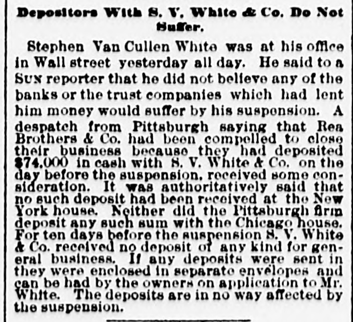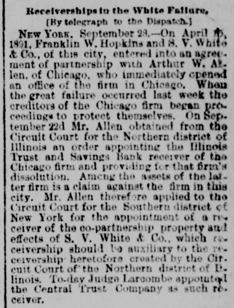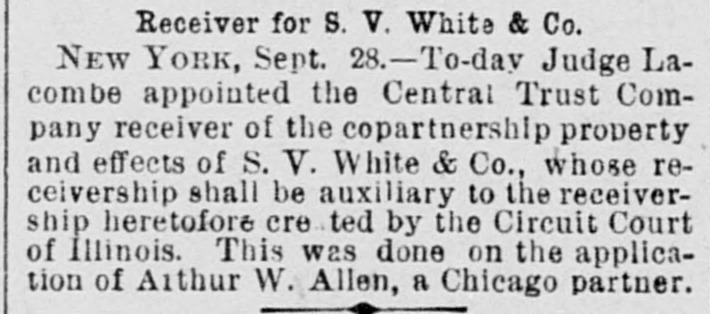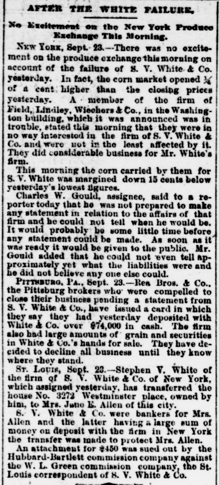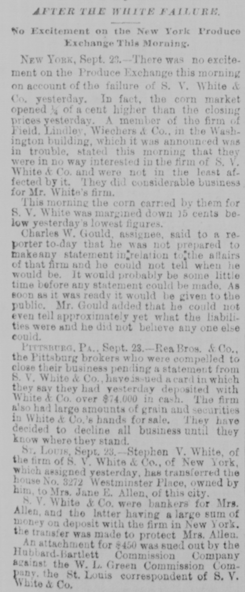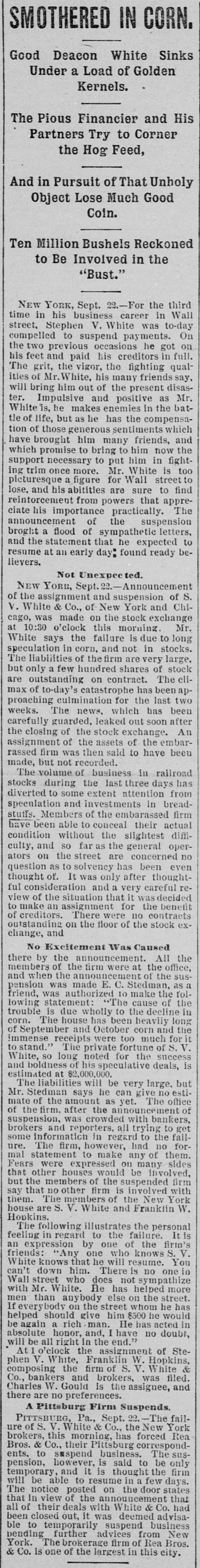 A NOTABLE FAILURE. S. V. White. the Well Known New York Broker, Suspends. CAUSED BY THE DEOLINE IN CORN. The Bold Operator Had Been Carrying from Ten to Fifteen Million Bushels in the Face of the Down. ward Rush-The Firm Has Acted Honorably Throughout. NEW YORK, Sept. 23.-The announcement of the failure of the well known banking house of S. V. White & Co. has caused a tremendous sensation in Wall street. For the last twenty years "Deacon" White has been a tower of strength in financial circles, and the announcement of his suspension, coming BO suddenly and unexpectedly, produced a shock that was all the more violent. The market immediately felt its effect. and prices declined all along the list. At first it was supposed that the firm WAS largely interested in stocks and bonds, but shortly after came the statemont that the failure was due to thedecline in the corn market at Chicago, and the outstanding contracts of the firm in the stock and bond market were limited. It is believed that the liabilities of the firm are in the neighborhood of $2,000,000. The assets are not known, but a member of the firm is authority for the statement that all creditors will be paid in full. The firm is composed of S. V. White and Frank W. Hopkins, and has been in existence since Dec. 31, 1886. Previous to that time Mr. White had,been in bu3iness alone. Caused by Corn Deals. E. C. Stedman made a statement for Mr. White regarding the failure. He said that the house had been largely interested in the deal in September corn, which has been in progress for the past six weeks. Mr. White believed that the market warranted higher prices, and inaugurated a vigorous bull campaign in Chicago. September corn at that time was selling at about fifty-fiva cents, and through the Chicago house of S. V. White & Co. he bought heavily. The buying continued until the market reached about seventy cents for September corn, when the enormous deliveries in the west started a decline. This was about ten days ago. Carried 15,000,000 Bushels. Mr. White, in order to protect his enormous interests, continued to buy heavily, hoping in this way to sustain the market. It is believed that he was carrying from 10,000,000 to 15,000,000 bushels of corn on margin, although Mr. Stedman said that he did not know what the exact extent or his interest was. The deliveries, however, instead of diminishing became larger and larger, and in spite of reports that early frosts had caused great damage to the corn belt the market continued to decline, until Monday the price had fallen to 52, representing a loss to the leader of the bull movement of from $1,500,000 to $2,000,000. Mr. Stedman stated that in anticipation of the trouble which has come upon it the firm had several days ago closed out all its contracts on the Stock Exchange and had taken no new business. 'The firm has acted very honorably," said Mr. Stedman, "and for the past week has done almost no business at all. Large deposits have been refused, and everything has been done to secure creditors when it was found that suspension was inevitable.' The Chicago house, which is composed of Mr. White, Mr. Hopkins, A. W. Allen and Arthur White, announced its suspension on the Chicago board of trade at the same time that it was made public here. Rea Bros. & Co., correspondent of the house in Pittsburg, have also suspended temporarily. Can't Keep Him Down. The following illustrates the personal feeling in regard to the failure. It is an expression by one of the firm's friends: "Anyone who knows S. V. White knows that he will resume. You can't down him. There is no one in Wall street who does not sympathize with Mr. White. He has helped more men than anybody else on the street. If everybody on the street whom he has helped should give him $4,000 he would be again a rich man. He has acted in absolute honor, and I have no doubt he will be all right in the end. Charles W. Gould, of No. 2 Wall street, has been appointed general assignee. When questioned about the failure Mr. Gould said: "All ] know is I was engaged all day in going through the formal acts necessary for me to take What charge of the assets of the fi these are or what the liab es are have not the faintest idea. 1 have a force at work already making up the
